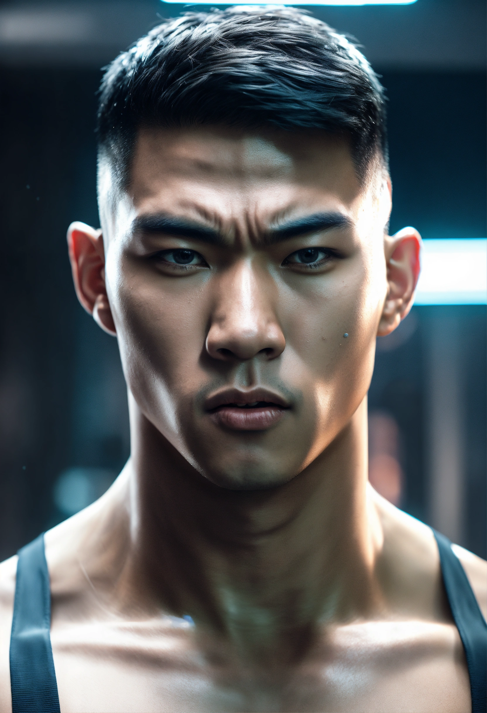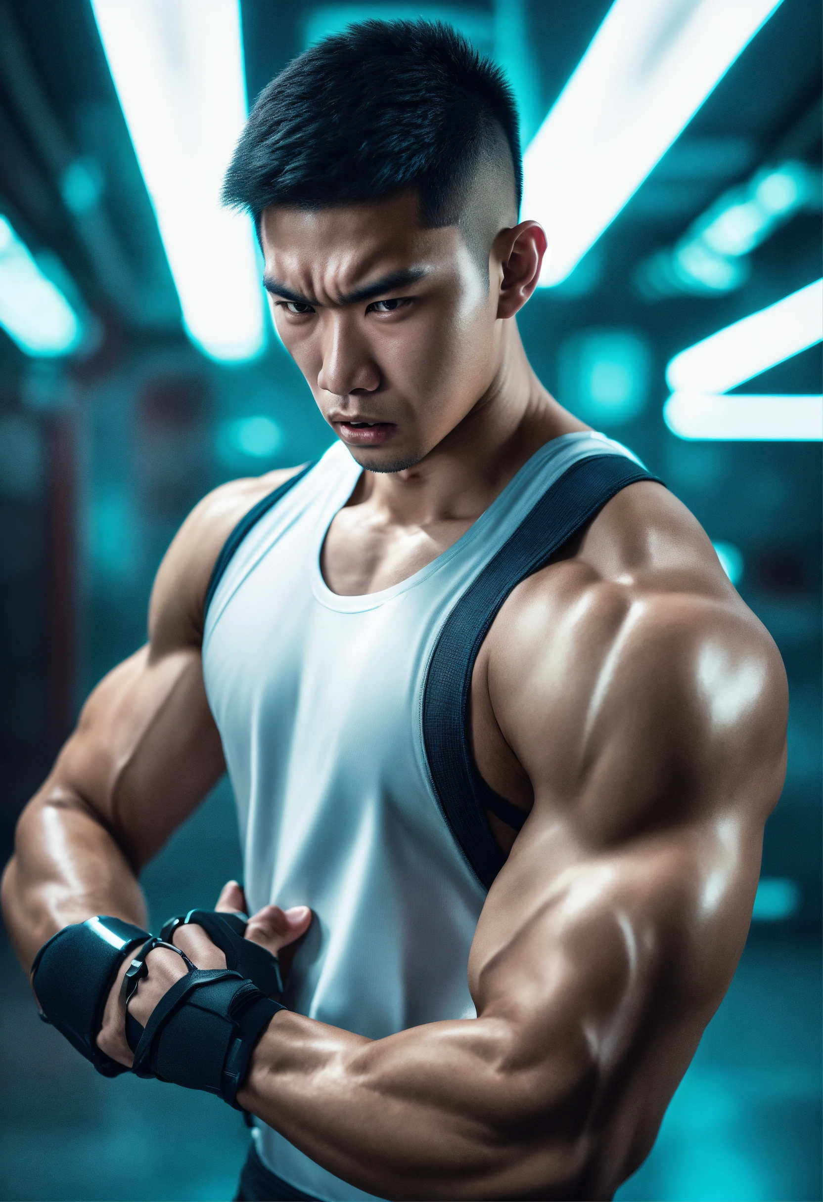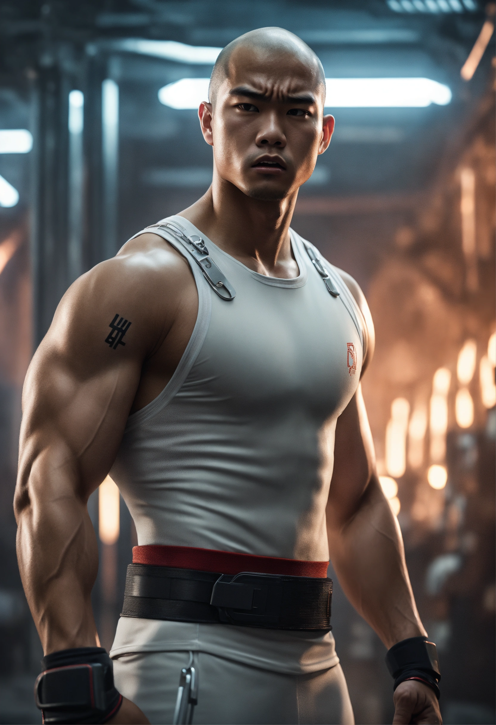 A realistic photo of an asian 20-year-old man with a very angry expression. very big muscled body, sharp nose, scary looking, completely shaved head, with one metal arm, wearing futuristic training clothing in a white sci-fi background. ultrarealistic, ultradetailed, 8k