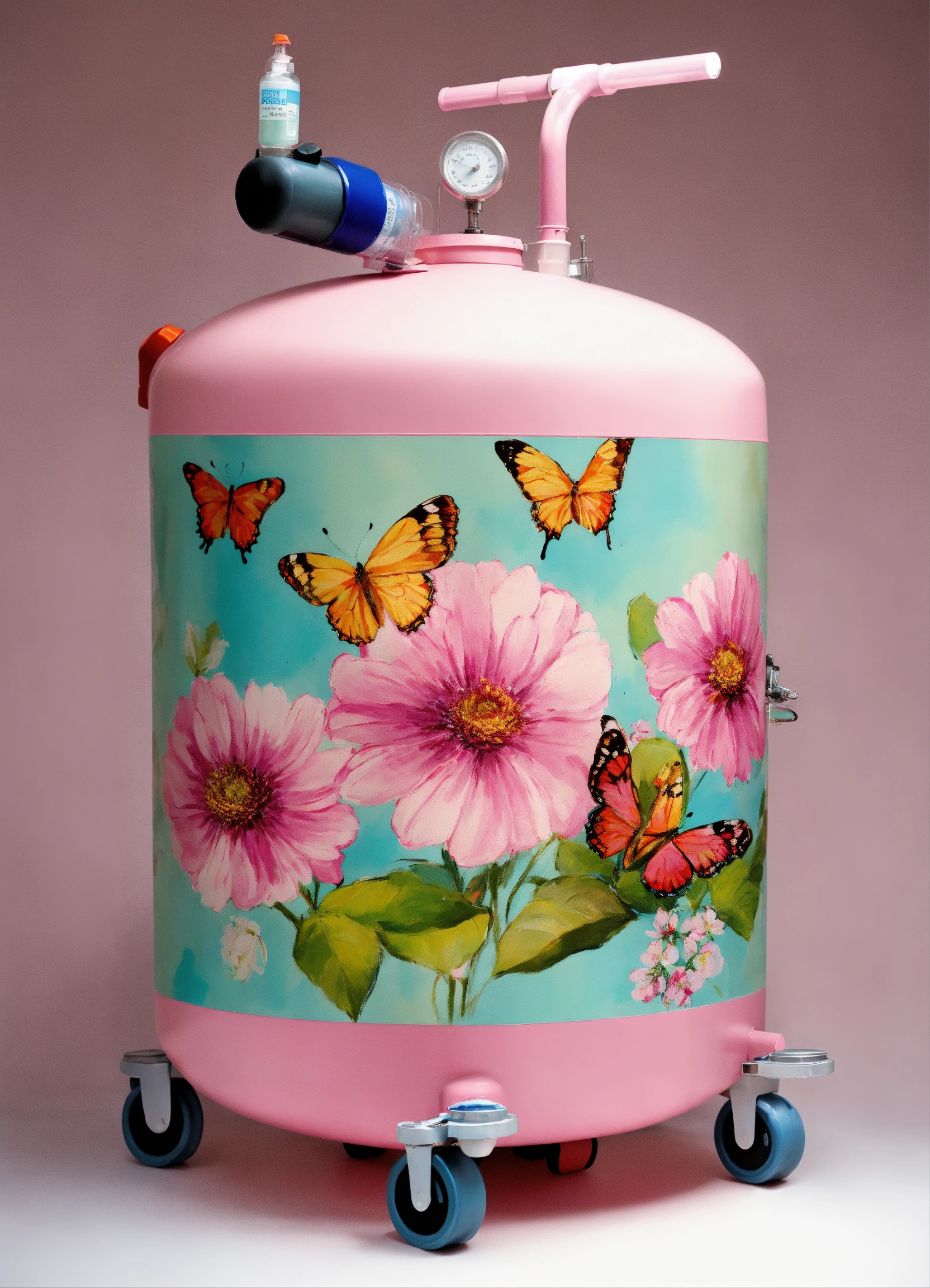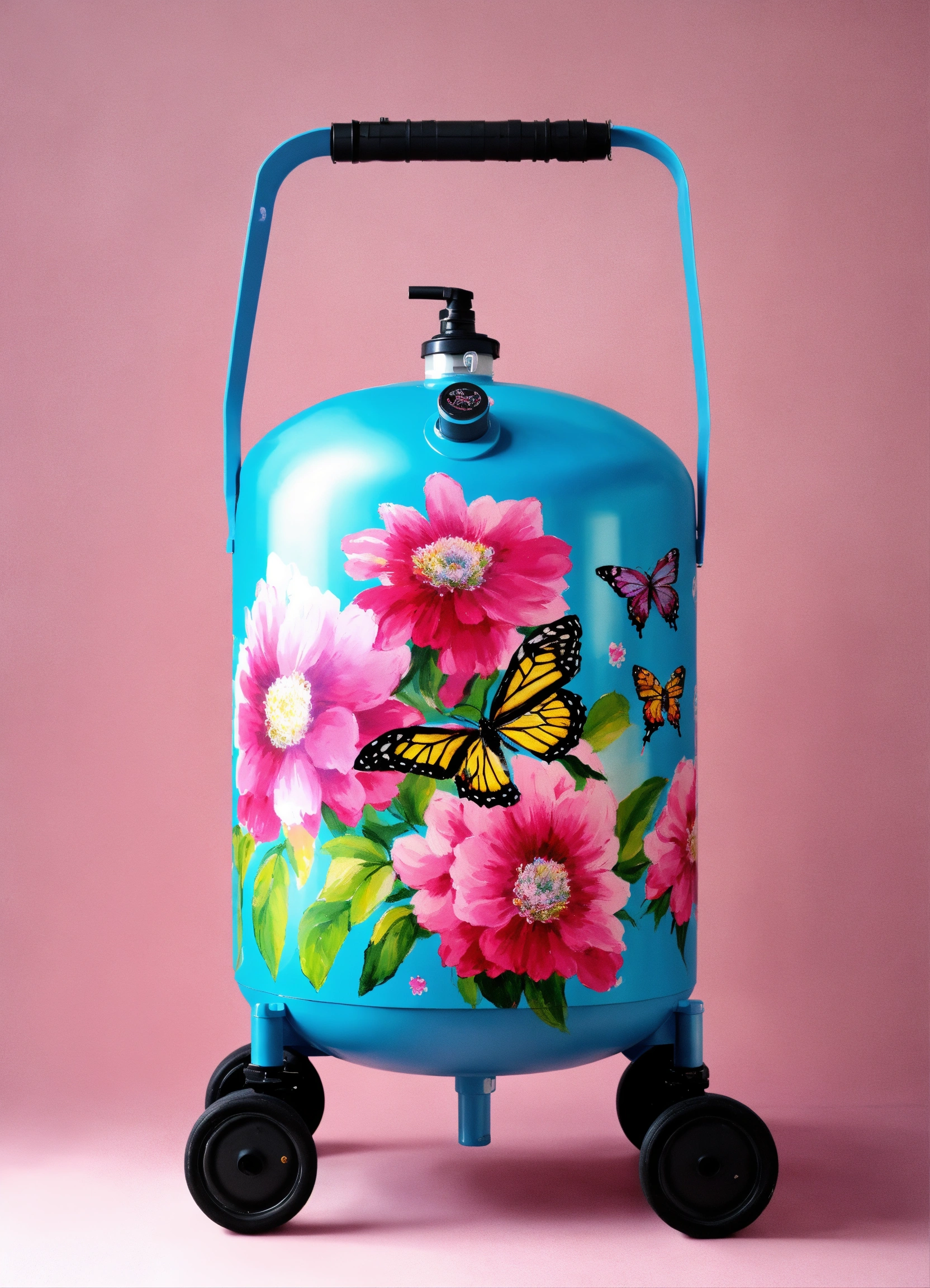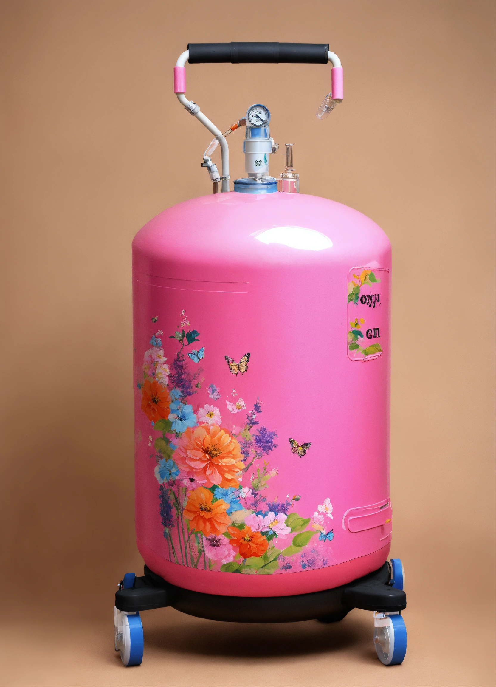 Concept art of oxygen tank and nasogastric tubenose tube, portable, rolling wheels, small, blank background, handprinted painted artsy design, portable oxygen concentrators, pink flowers and butterflies painted on the tank, medical, realistic, hyper realistic, portable, cute, artsy, decorated, thin tank, colorful girly handprinted designs on the tank, thin small portable tank, personalized decorated painted medical portable oxygen tank