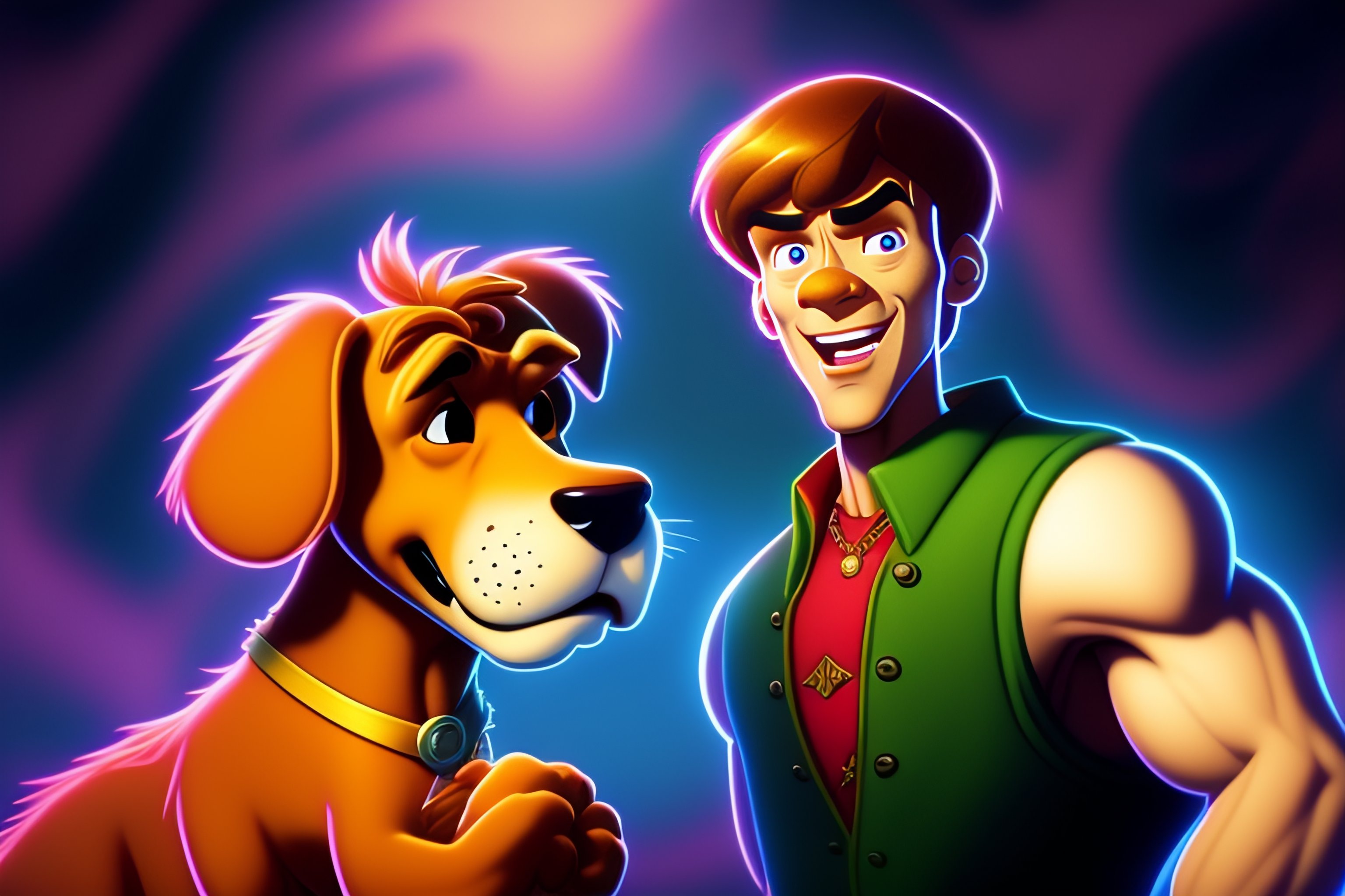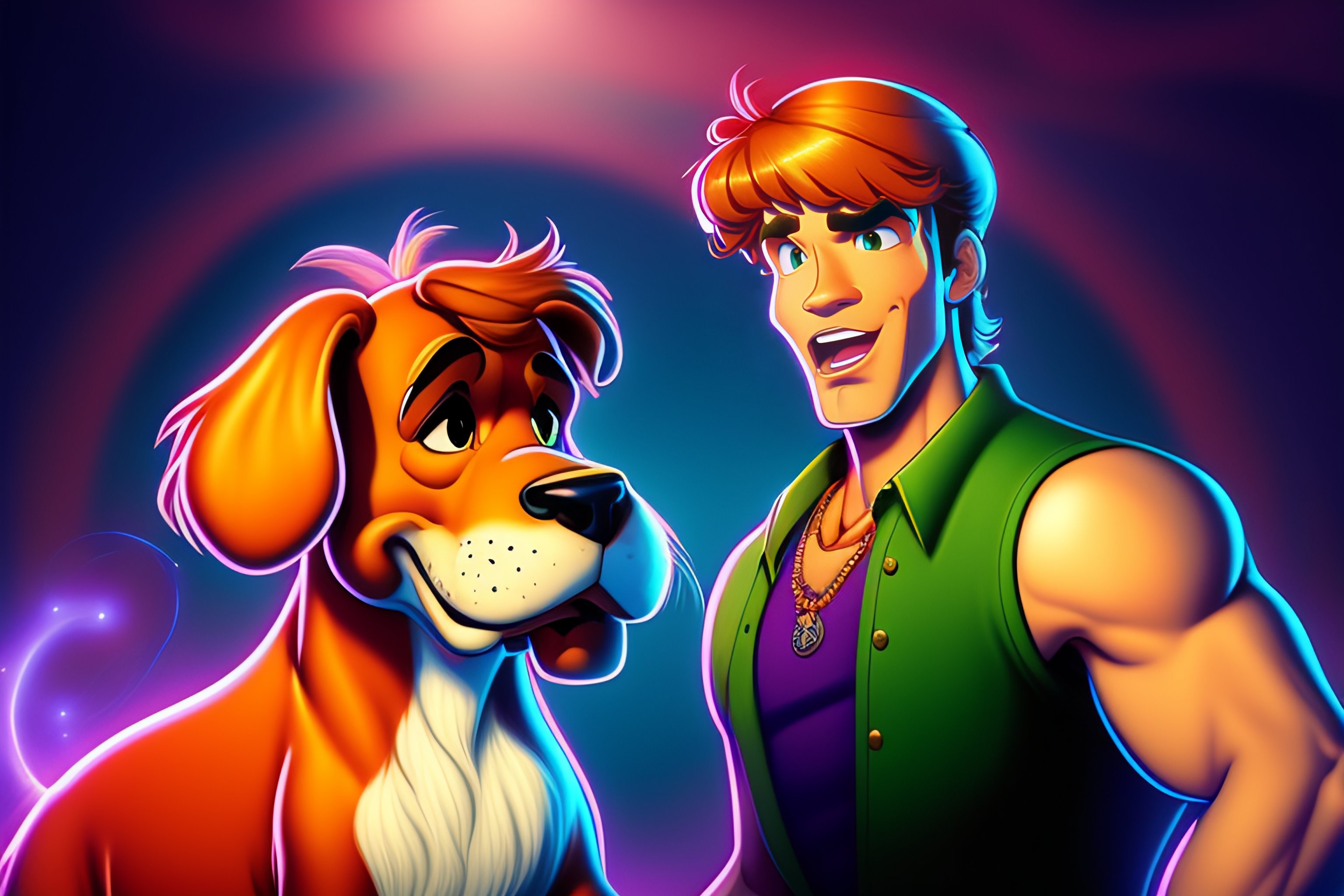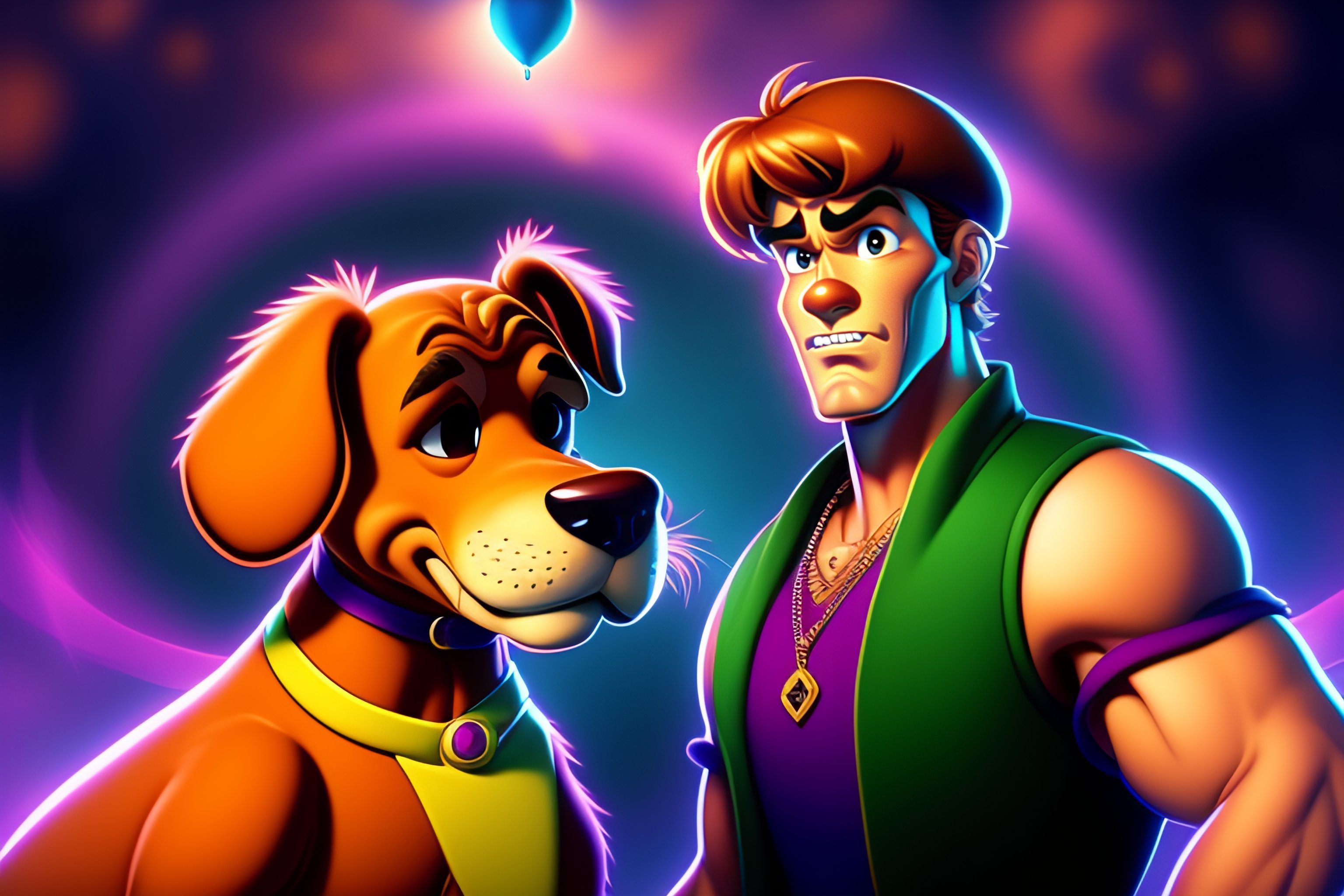 A beautiful photo of scooby-doo and shaggy being scared of a ghost
