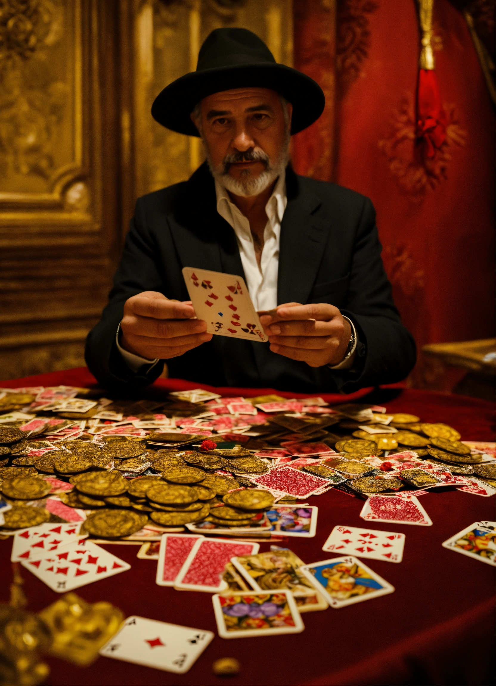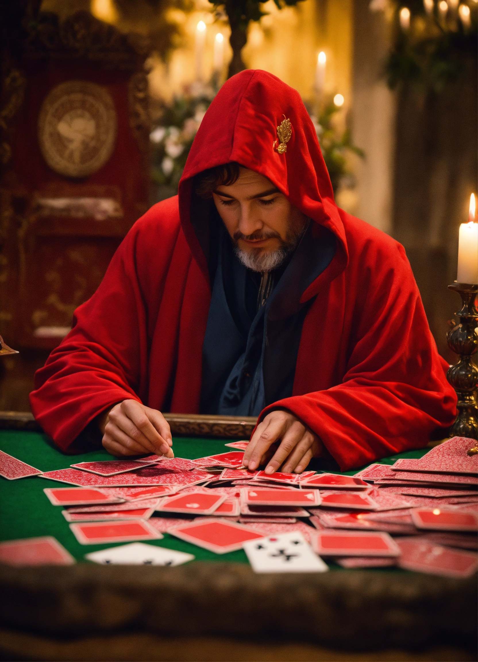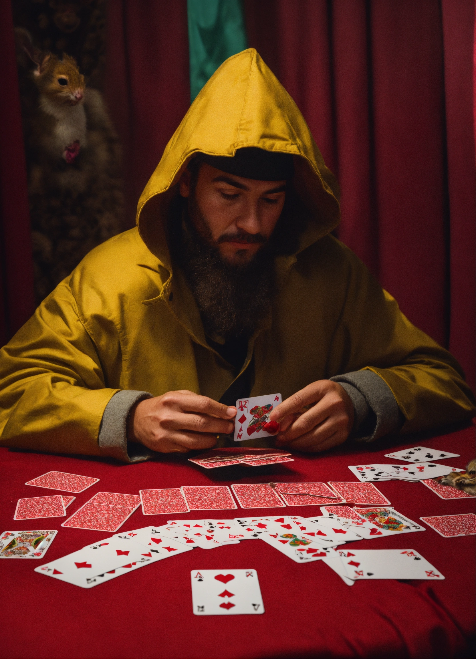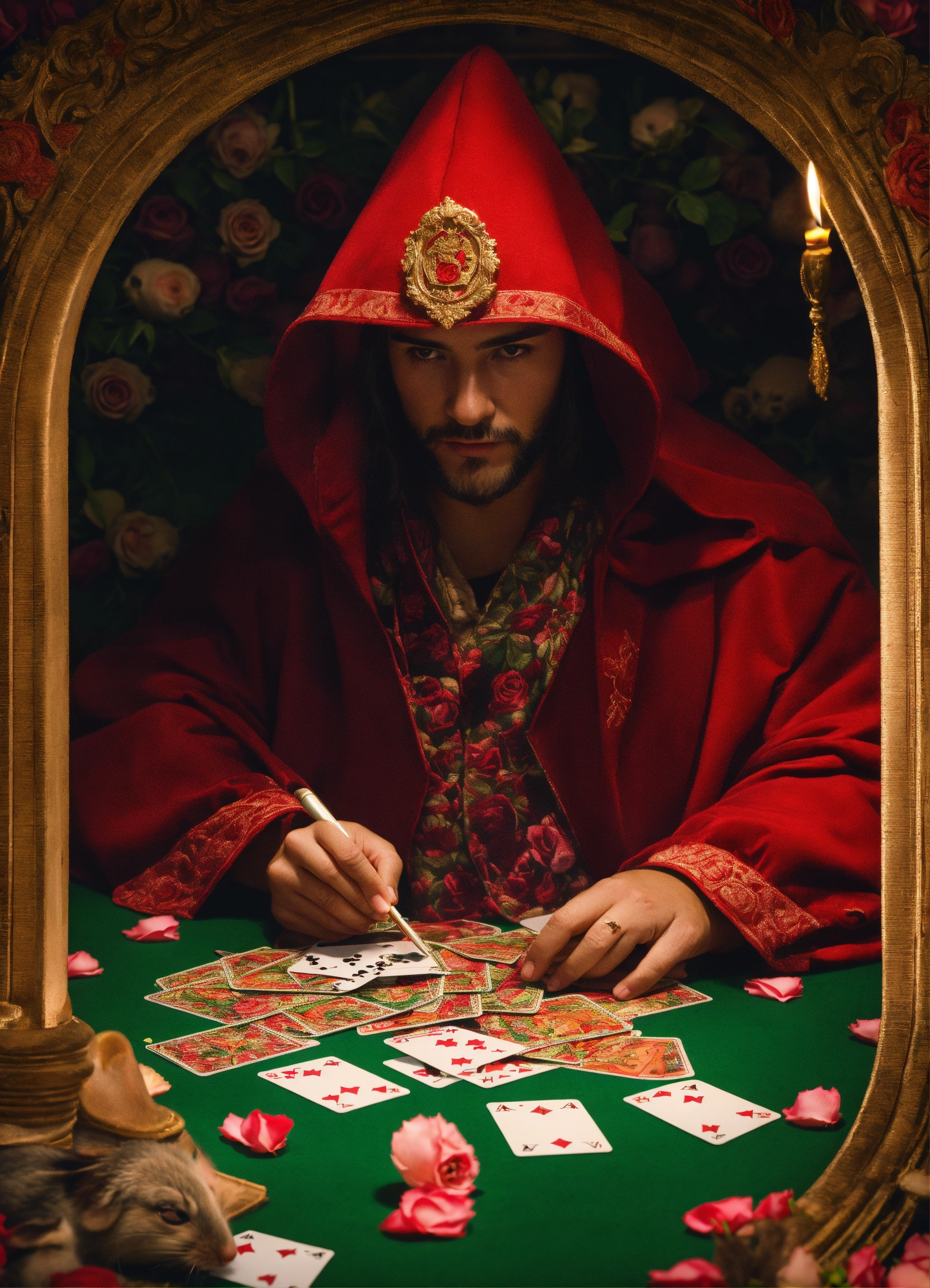 Un mago con capucha moreno, con cartas y rosas alrededor, dentro un club, en el fondo hay un montón de ratas hablando entre sí