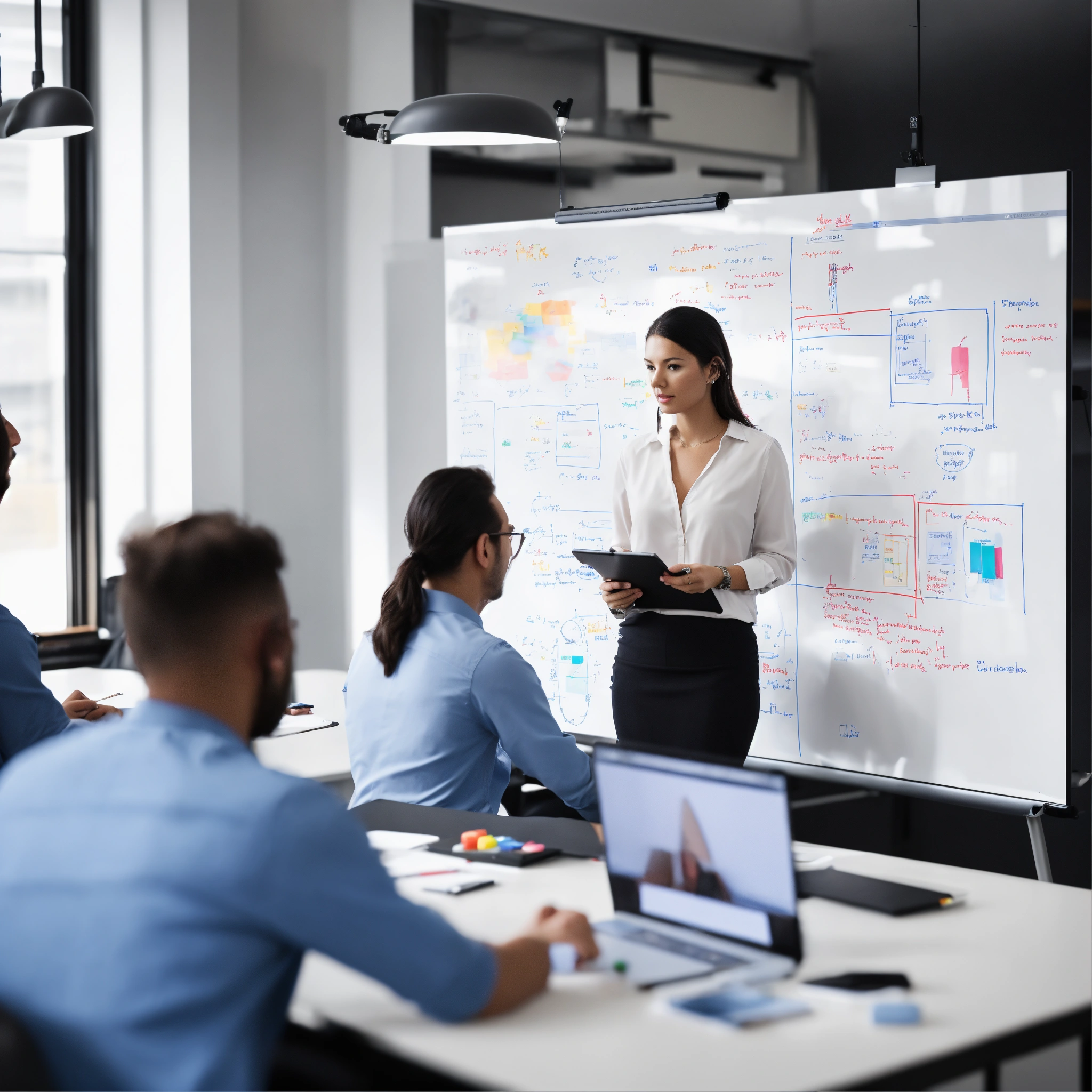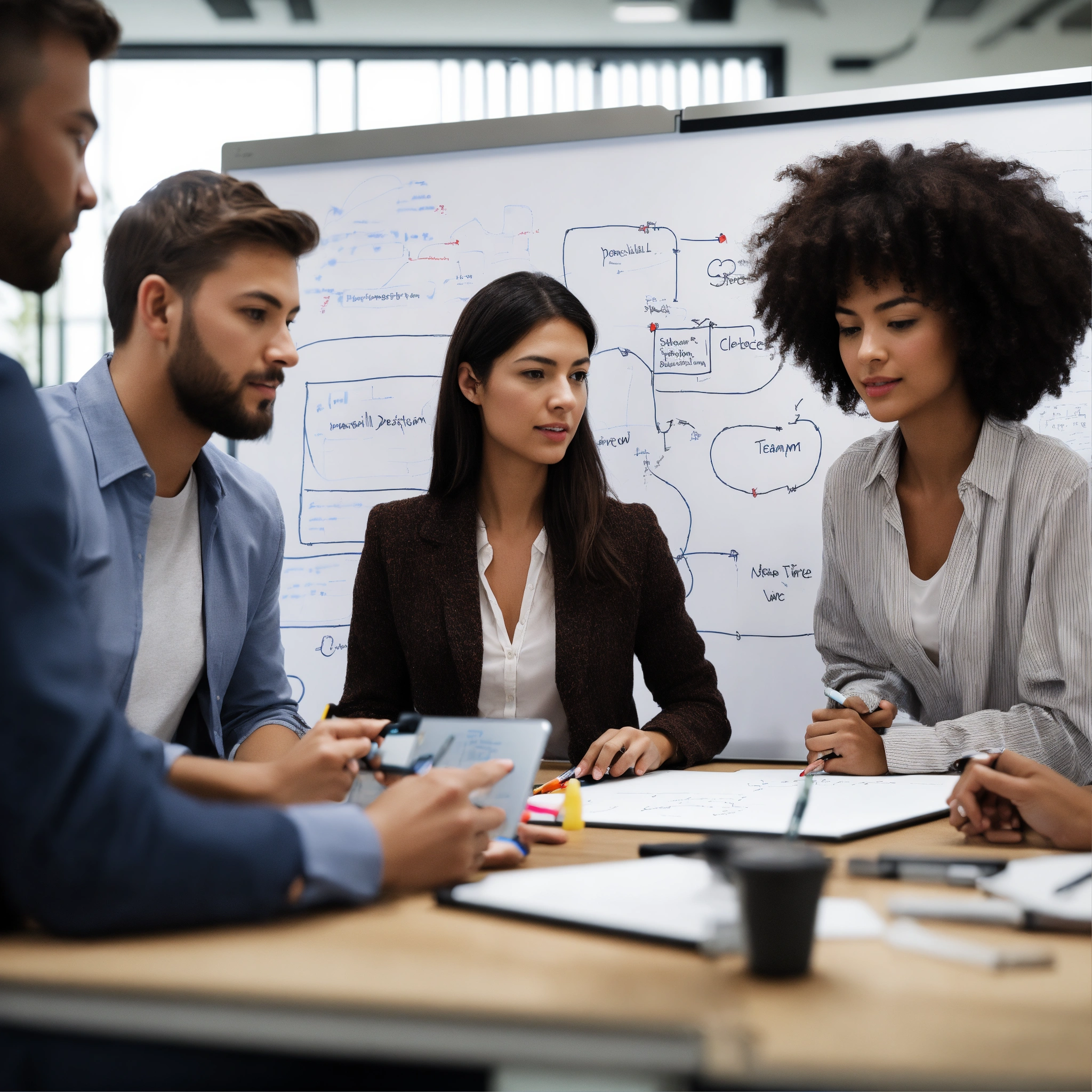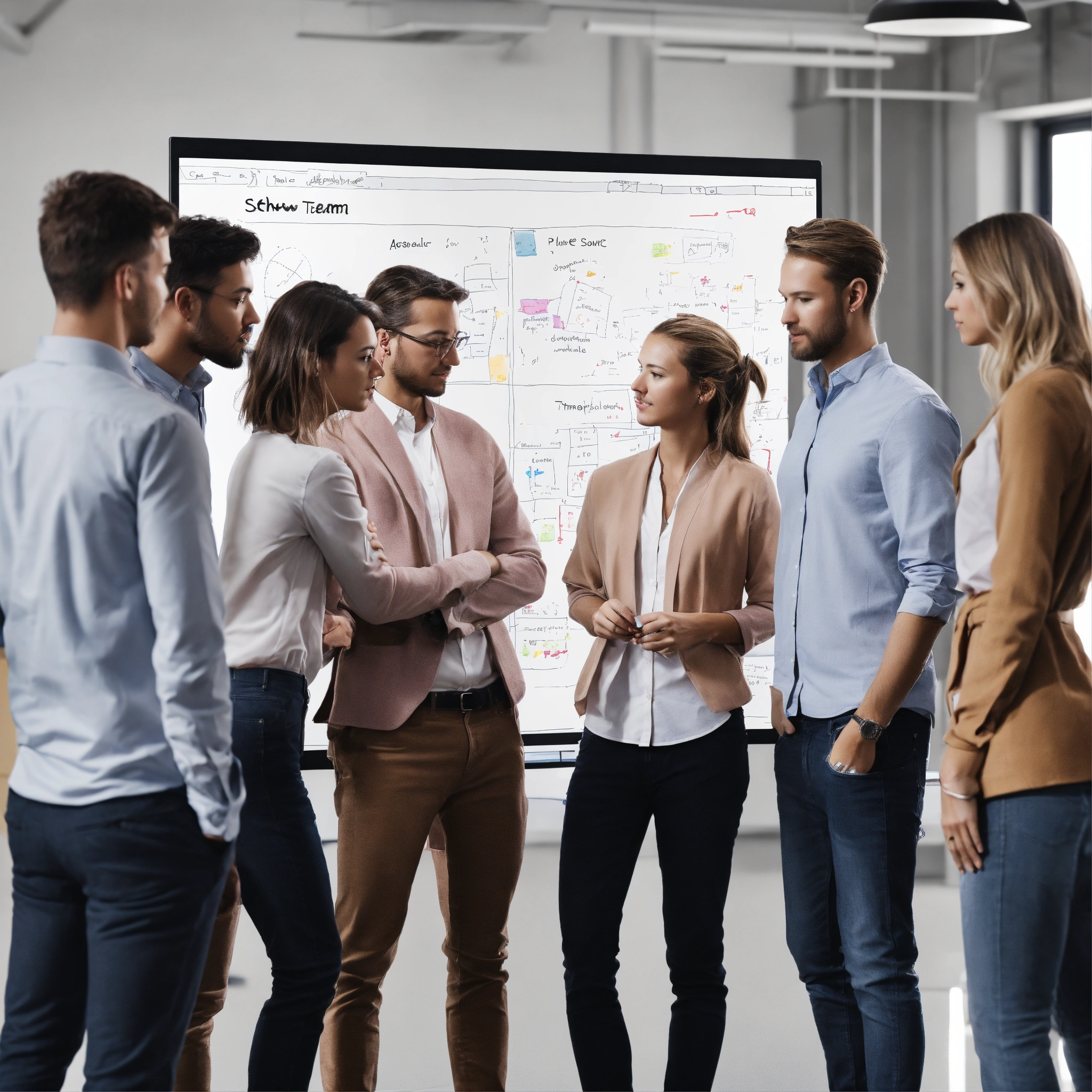 Show a picture of a team that is in the process to create a stunning software design on a whiteboard, agile team setting, office, photo realistic. clear background, {{{informal clothing}}}