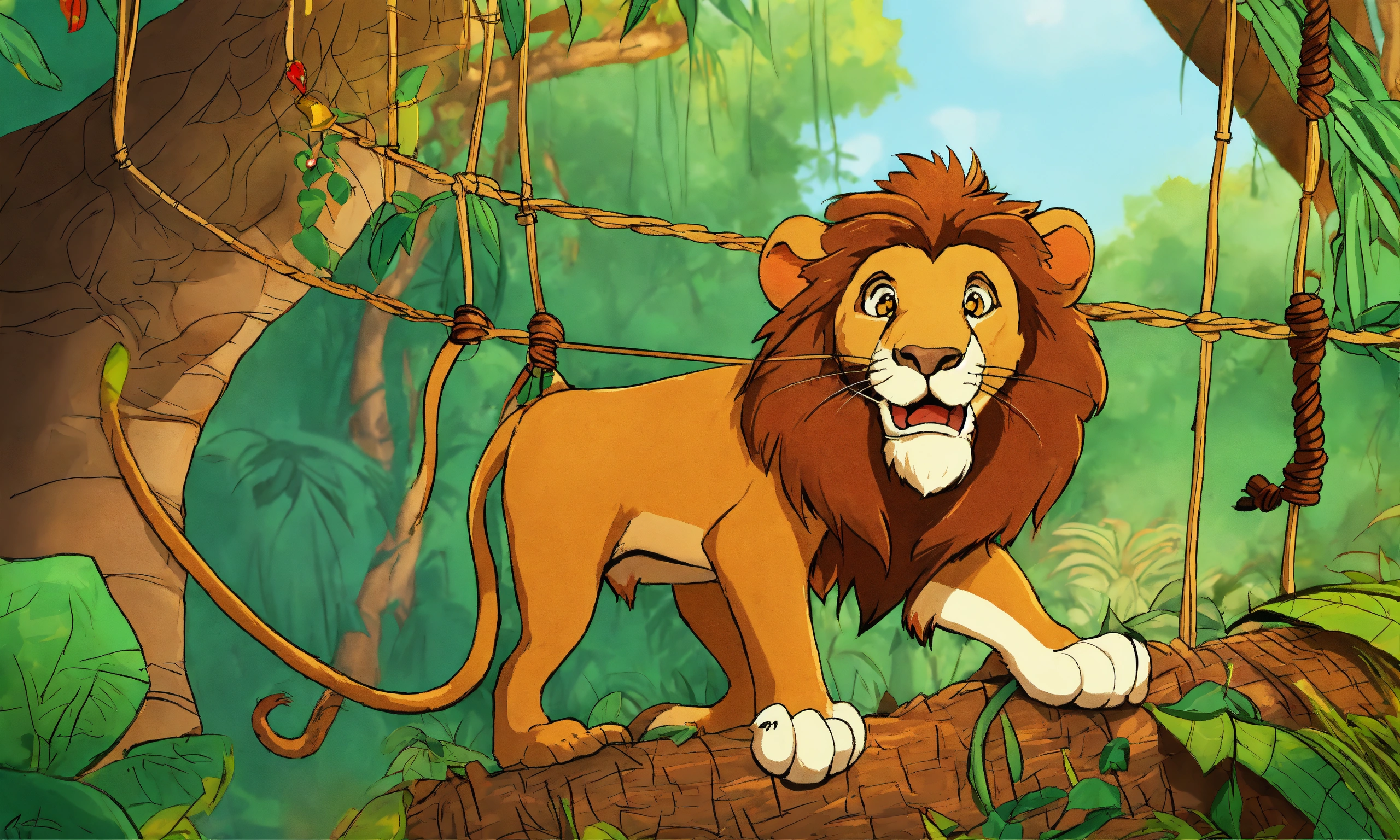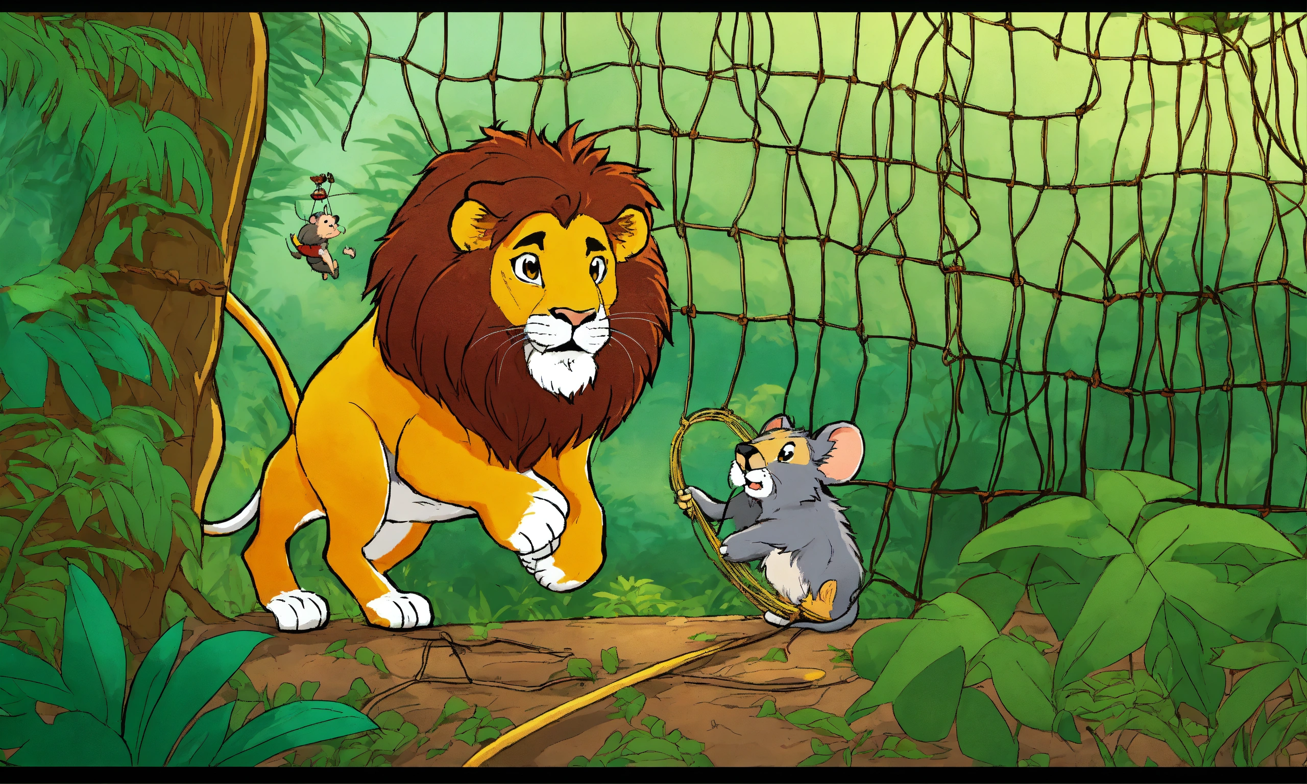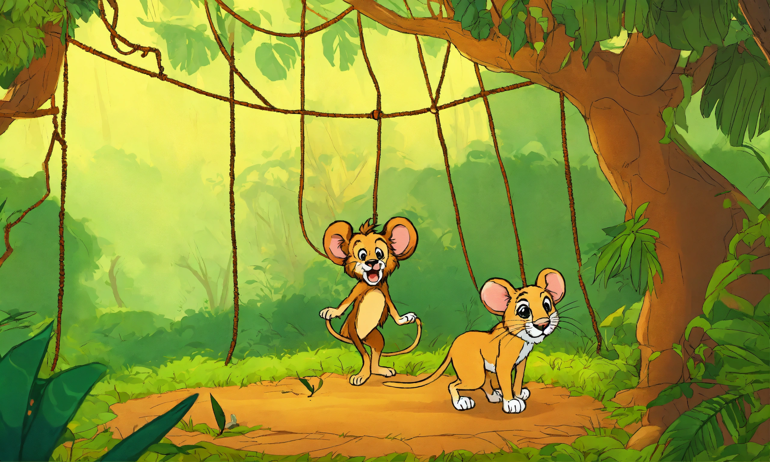 Cartoon in a jungle mouse cut net in which big lion was captured and trapped then hang to the tree