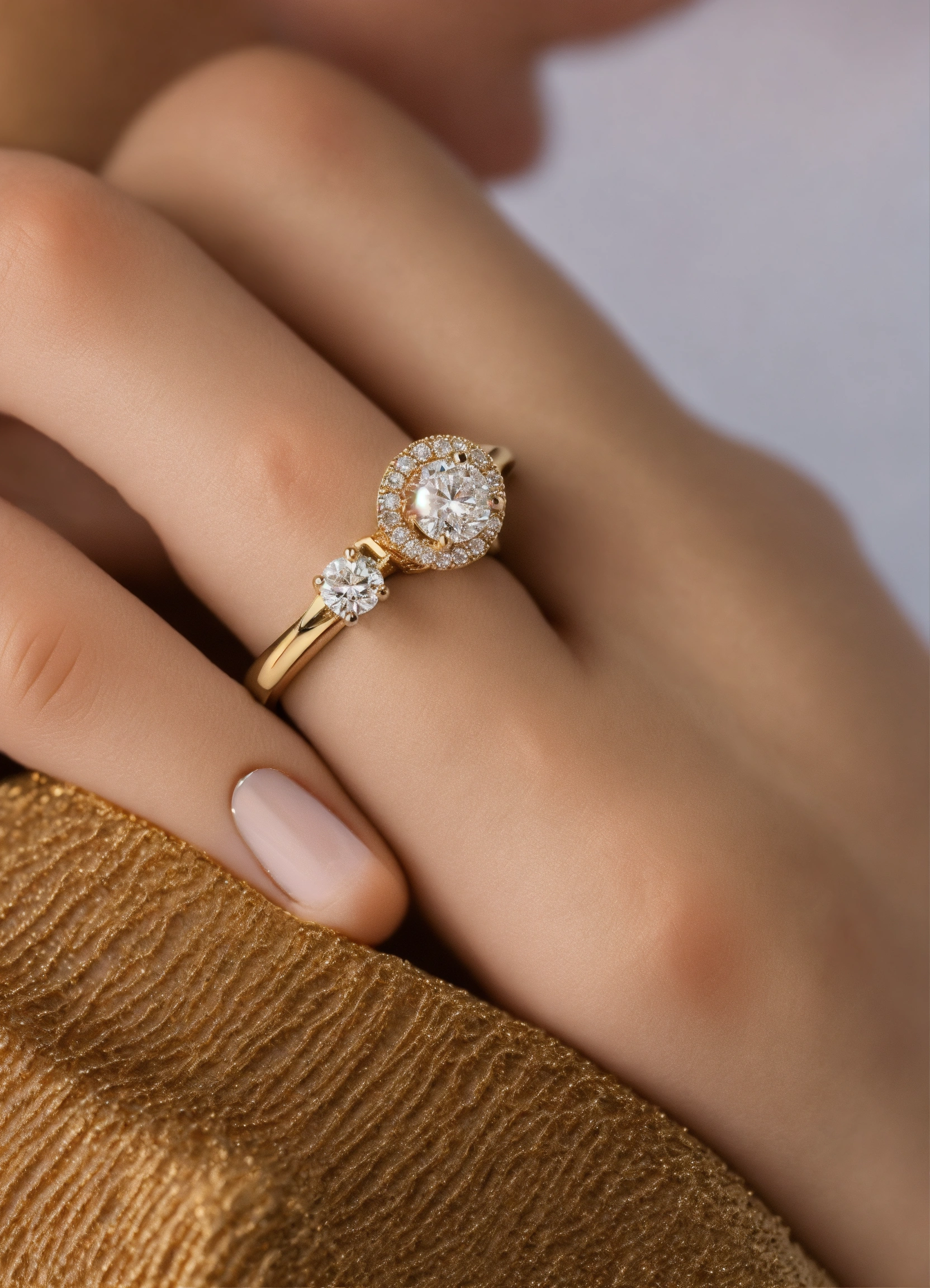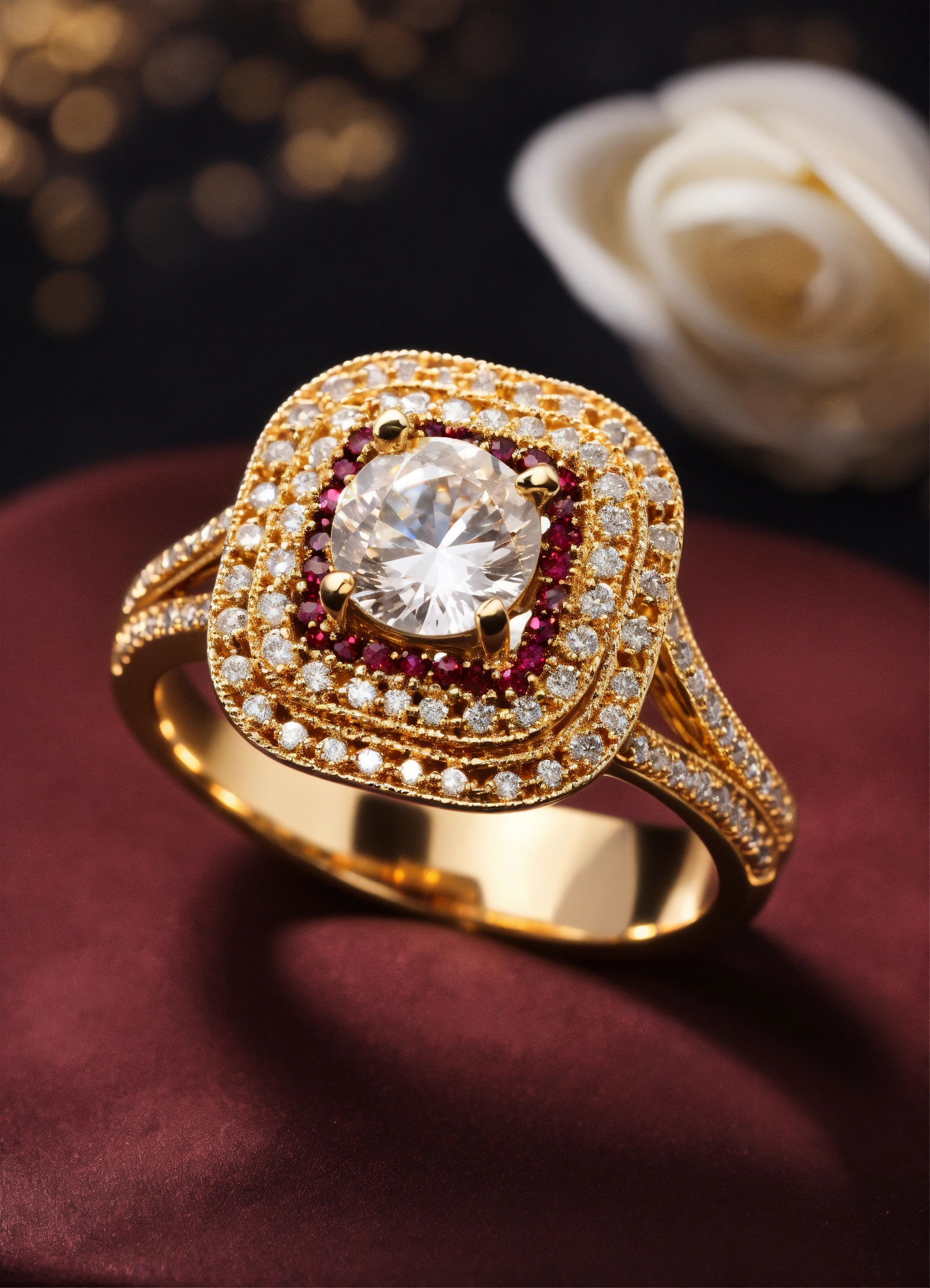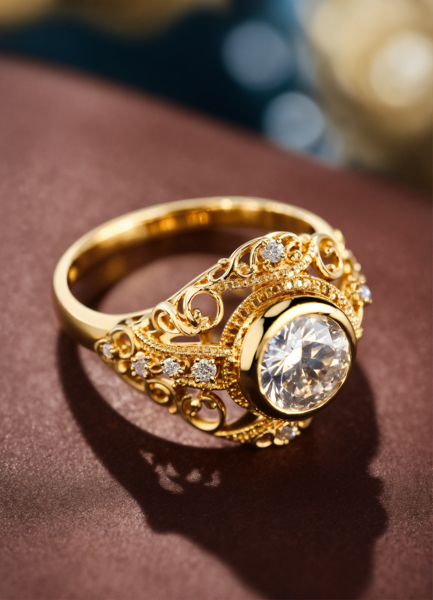 Jewellery design, vintage style, create diamond gold ring with matte finish in prong setting, mid-age women, saturday party, christmas-theme --product-view --ultra-quality