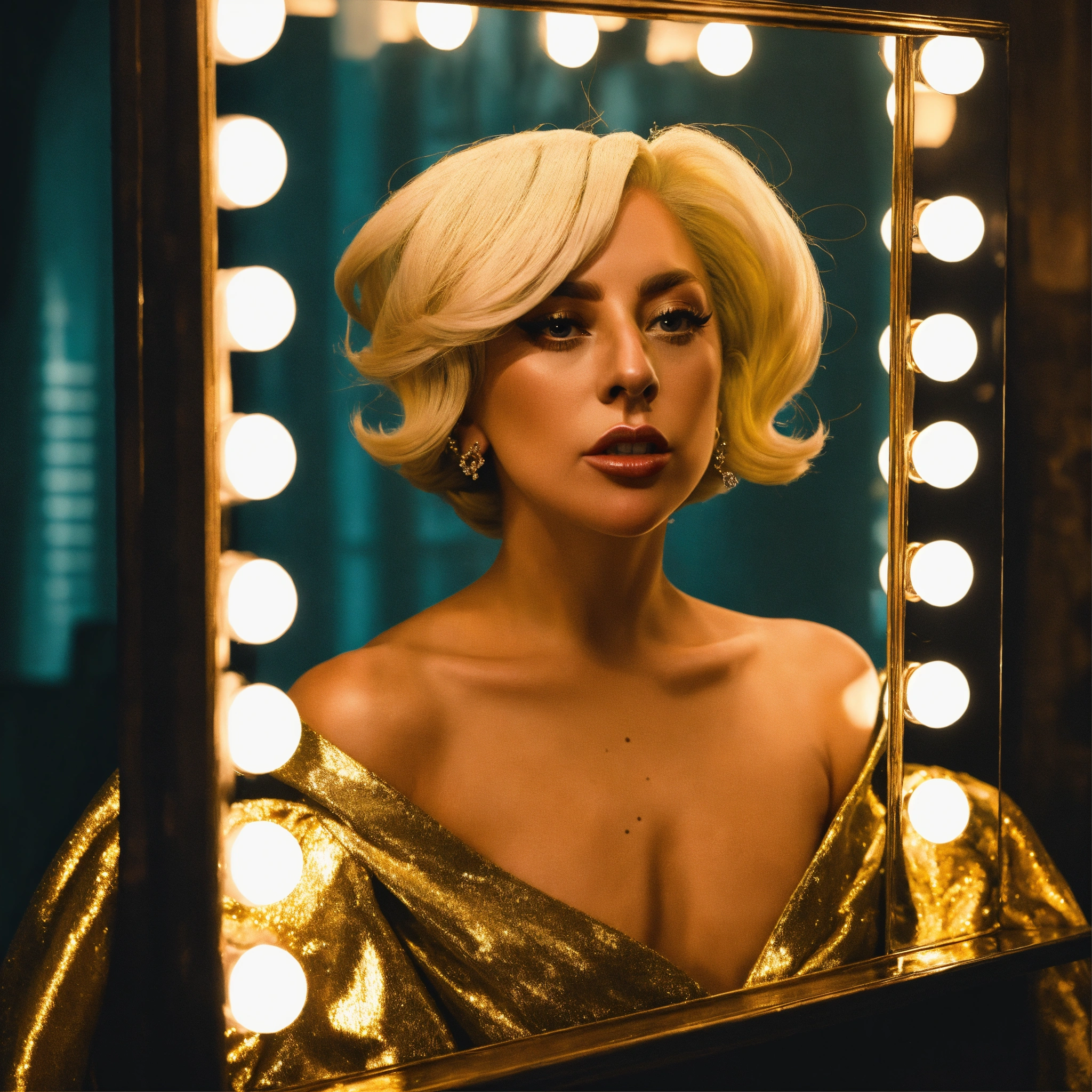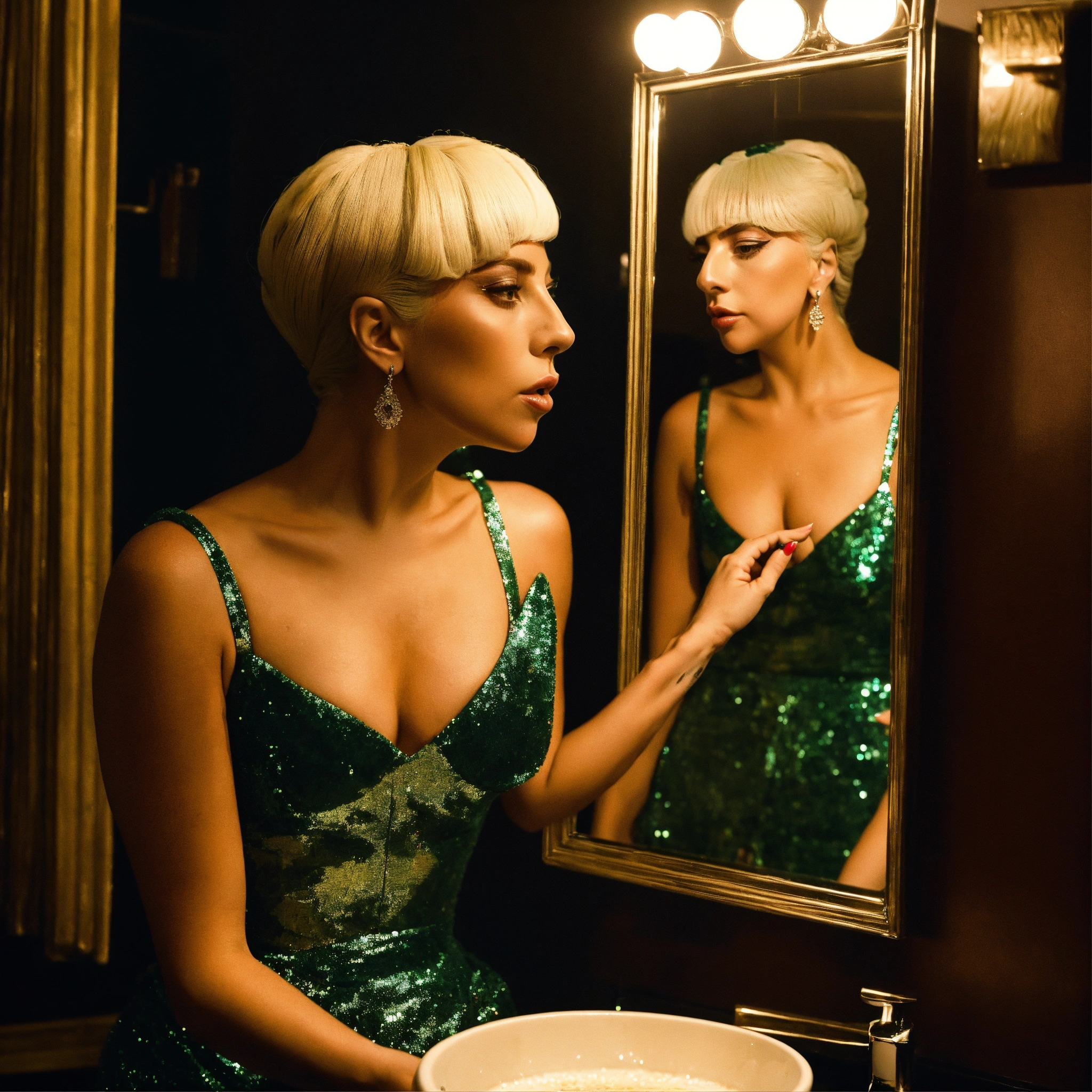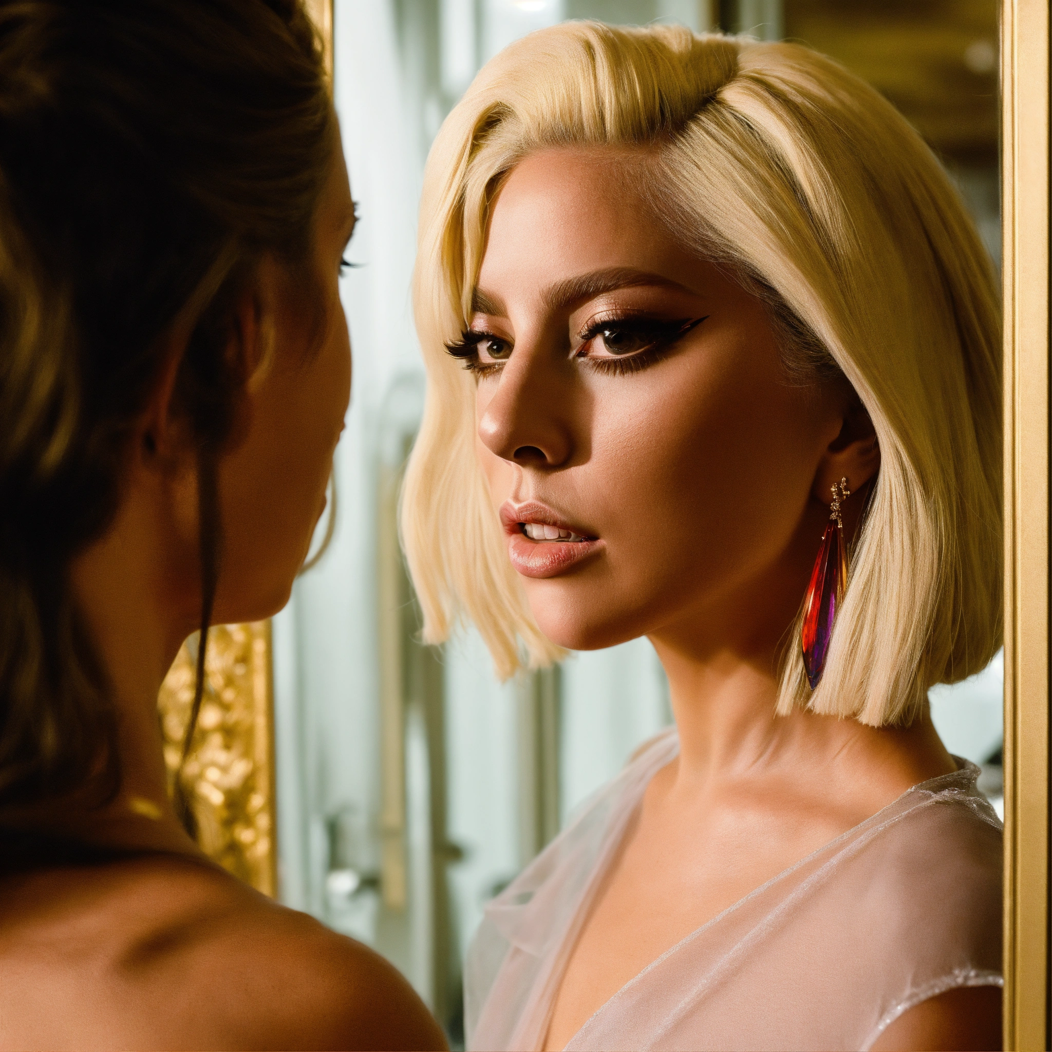 Lady gaga looking in to the mirror on reflection seeing woman inside