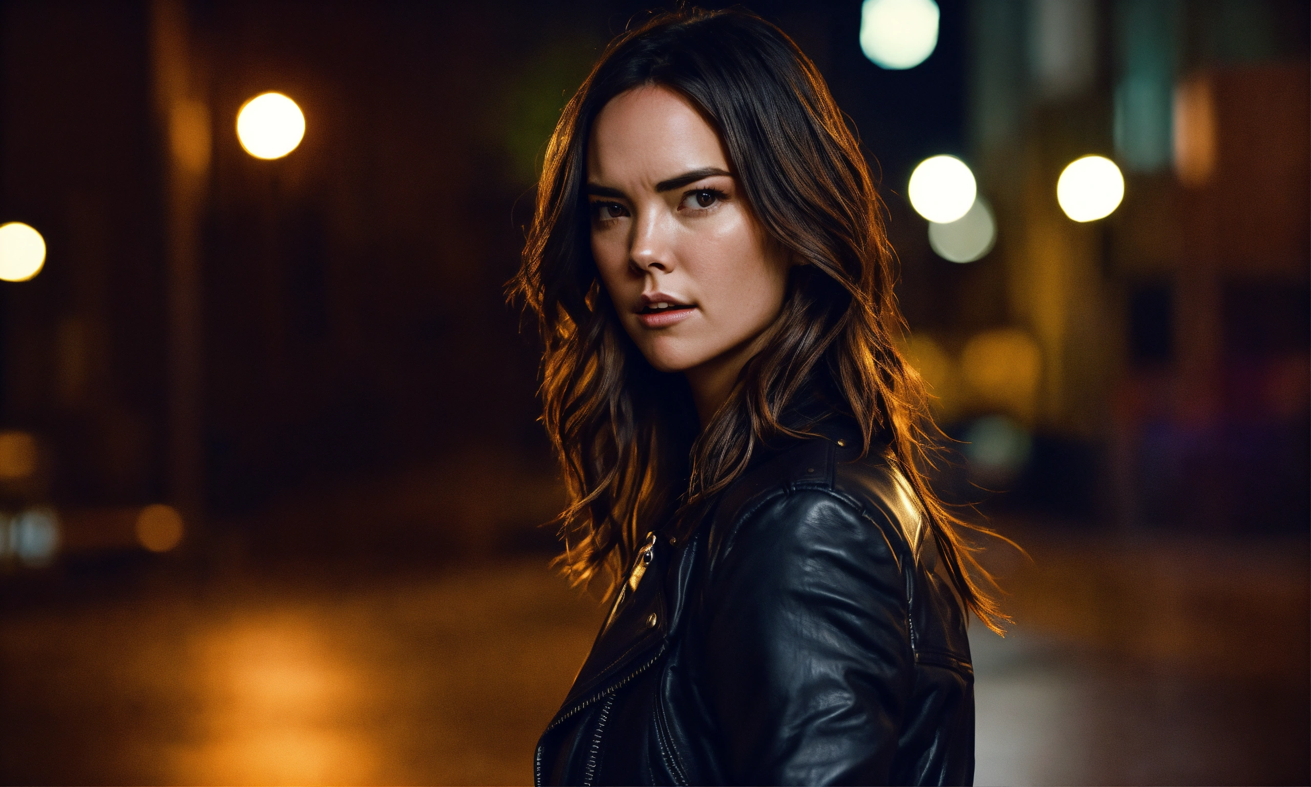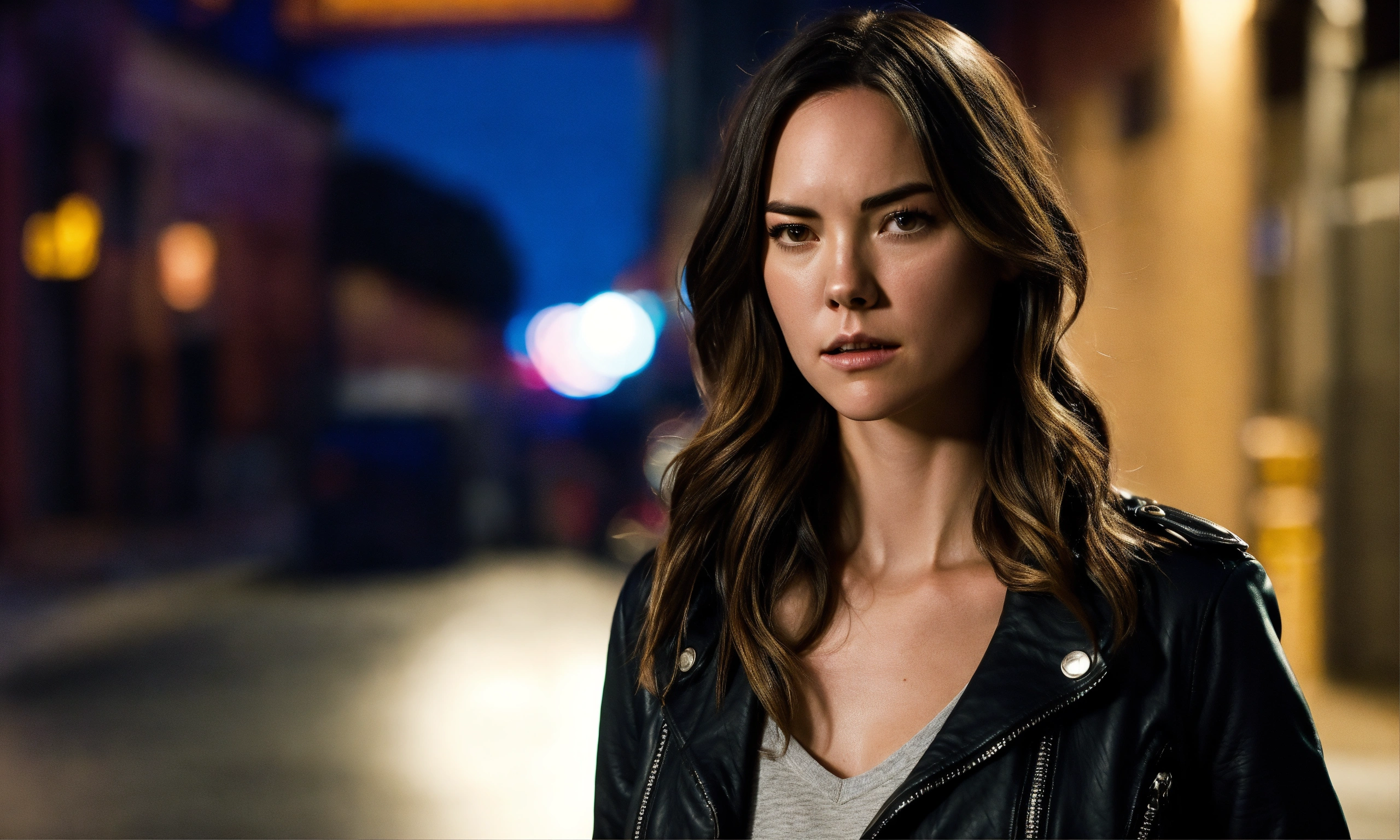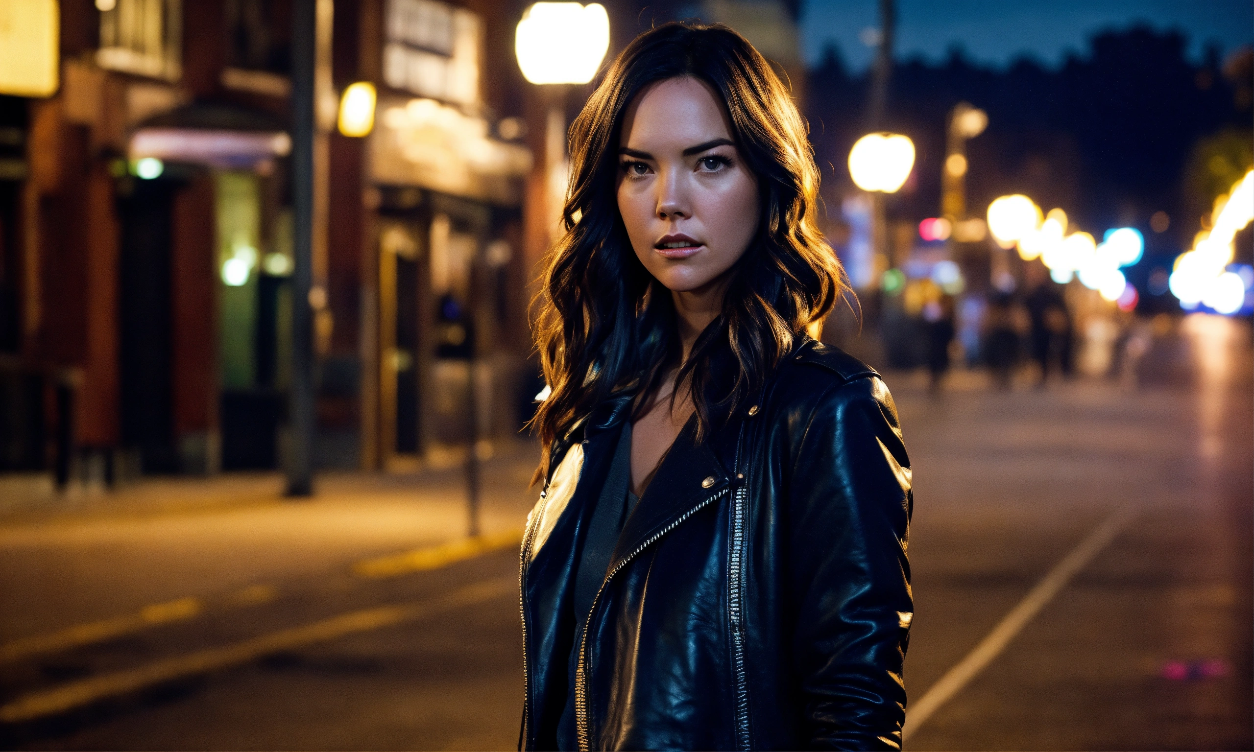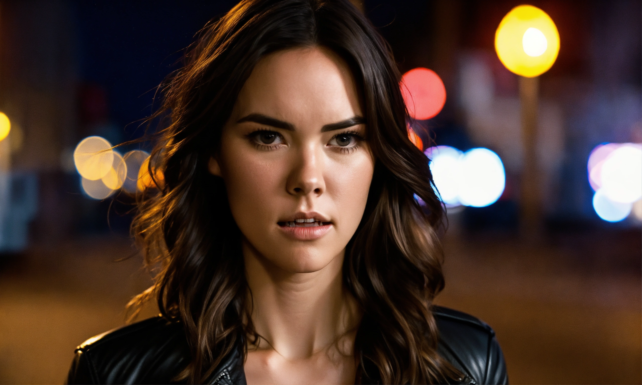 Very beautiful 30 years old odette annable, cute big eyes, thrilling serial killer victim, night, city, life-or-death situation, leather jacket, cinematic, realistic walk, closed mouth serious face