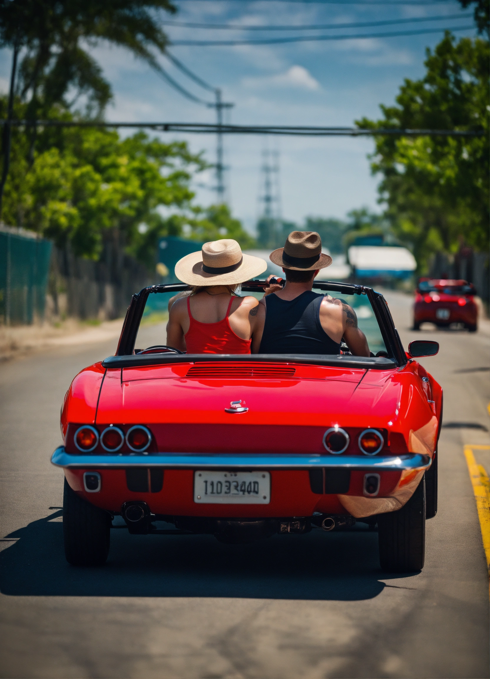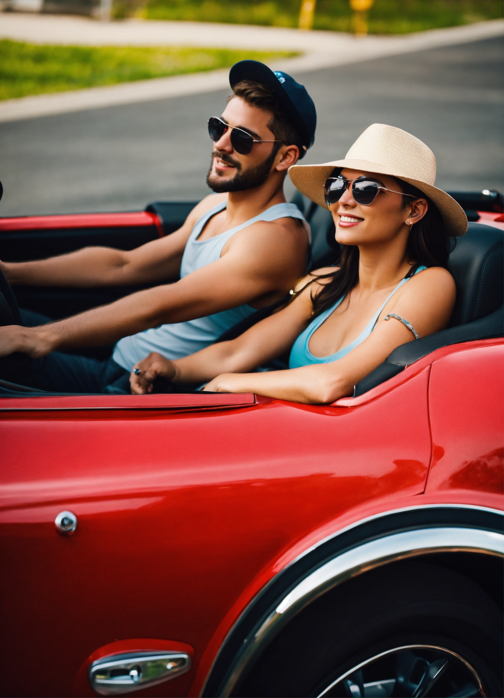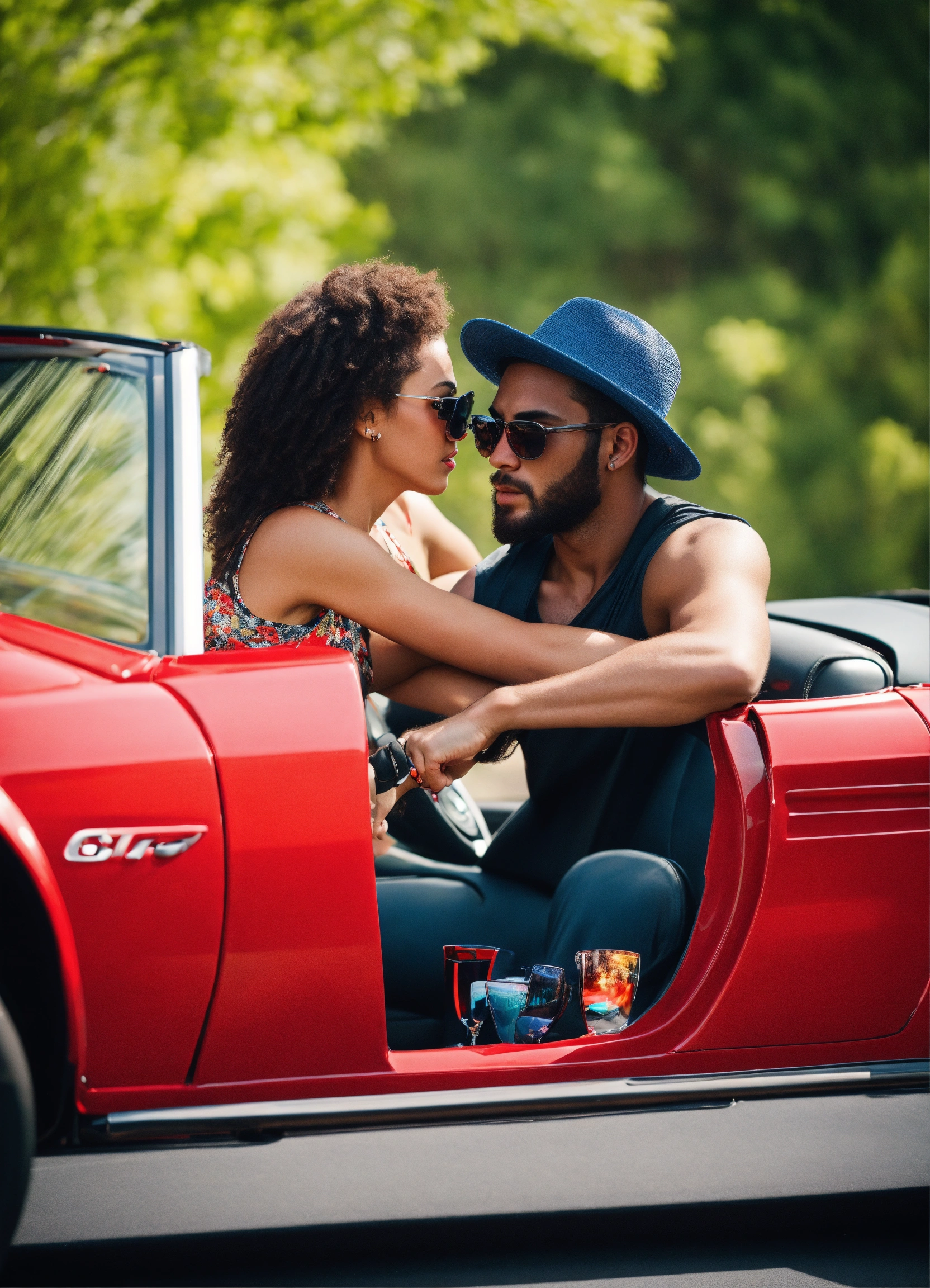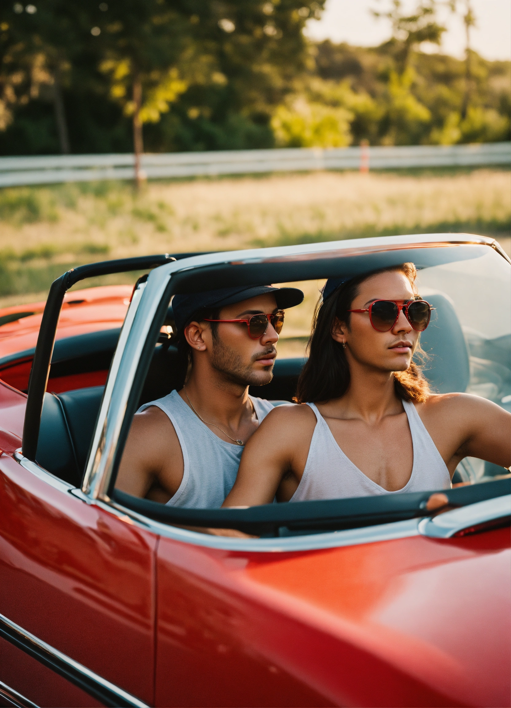 A man, wearing a tank top, sunglasses, and a hat on backwards, driving a red sports car with the top down. with his arm around the shoulders of his girlfriend