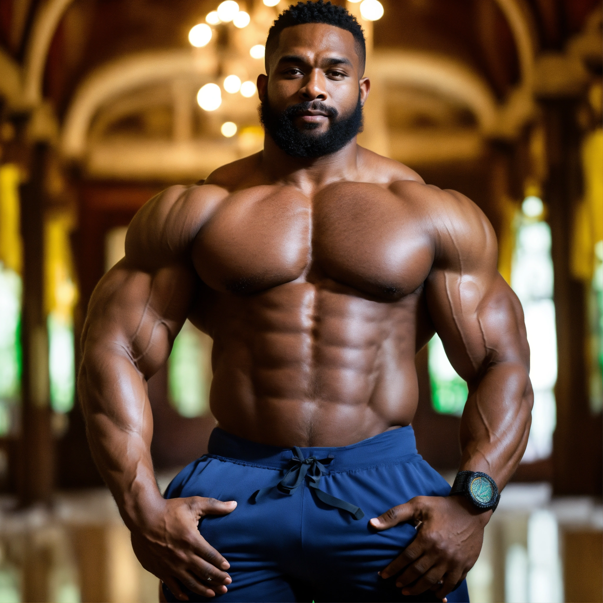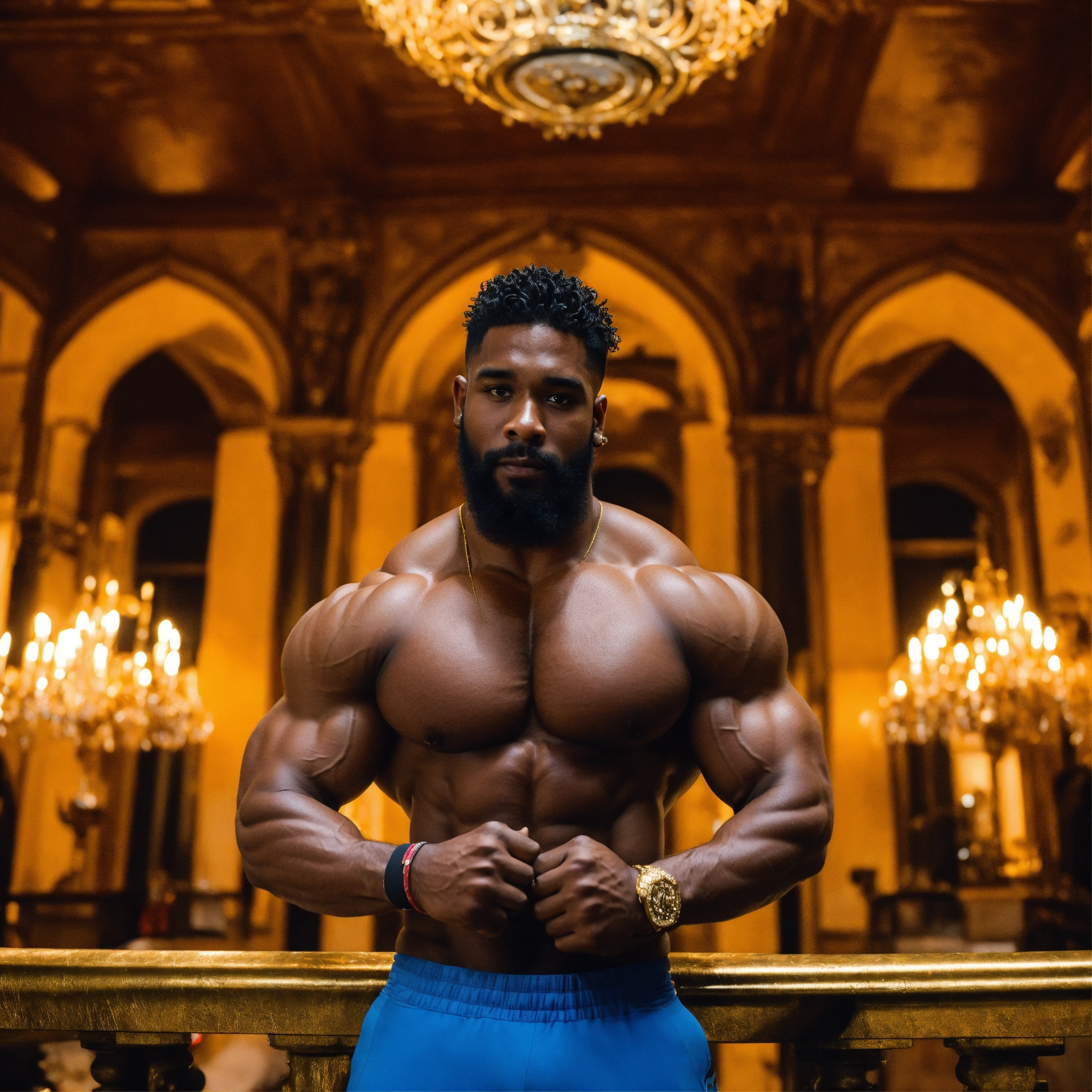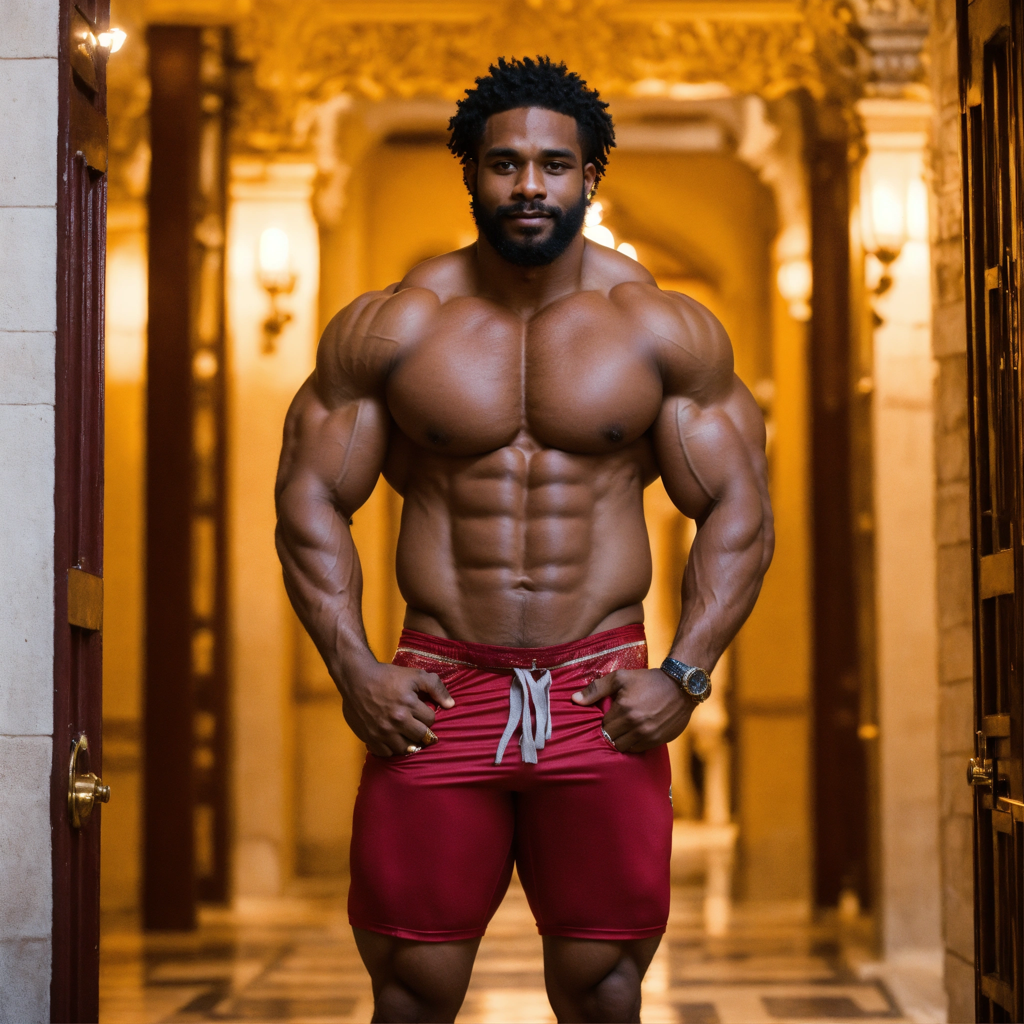 30-year-old hairy trinidadian man with big muscles, big bodybuilder, body like a wrestler, in a beautiful palace