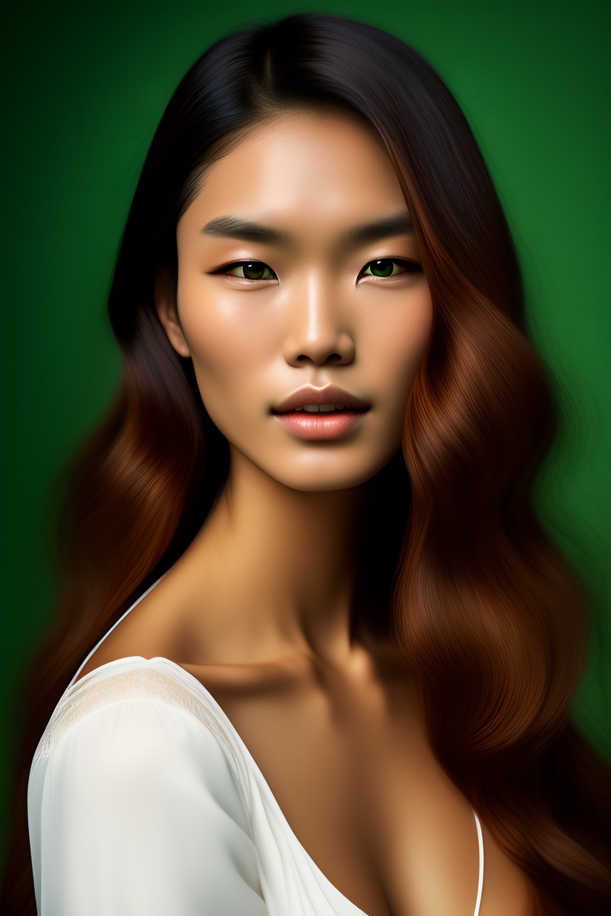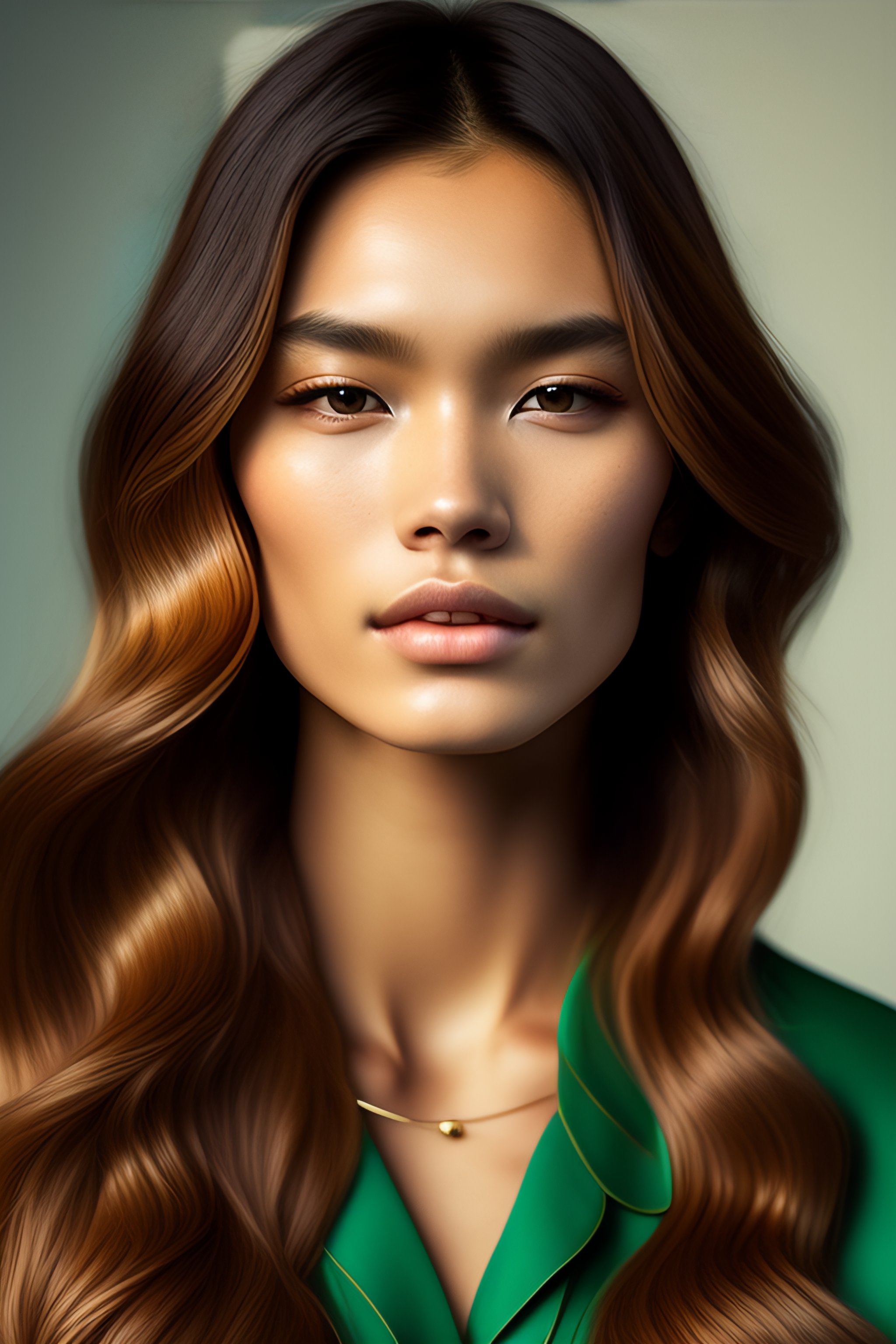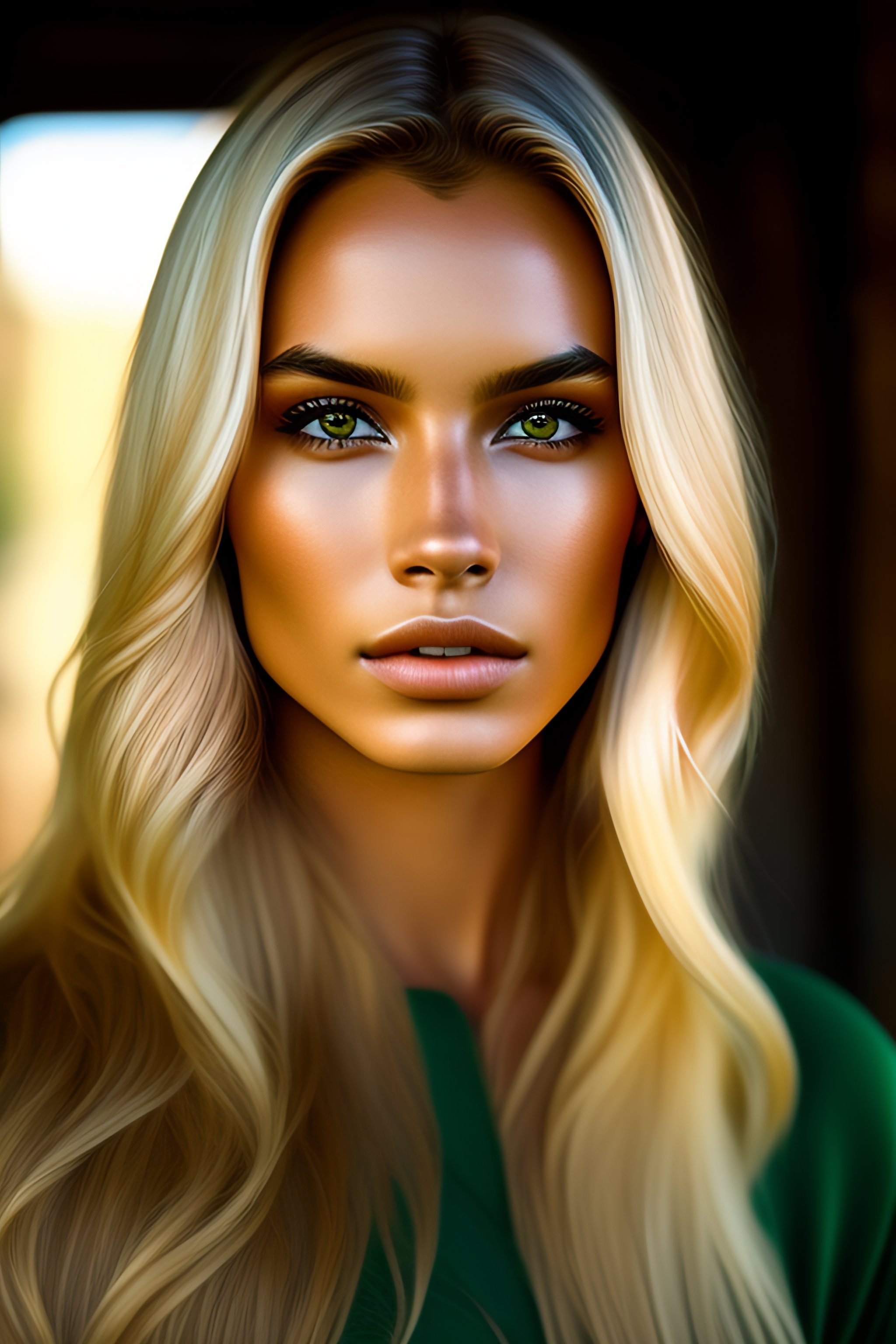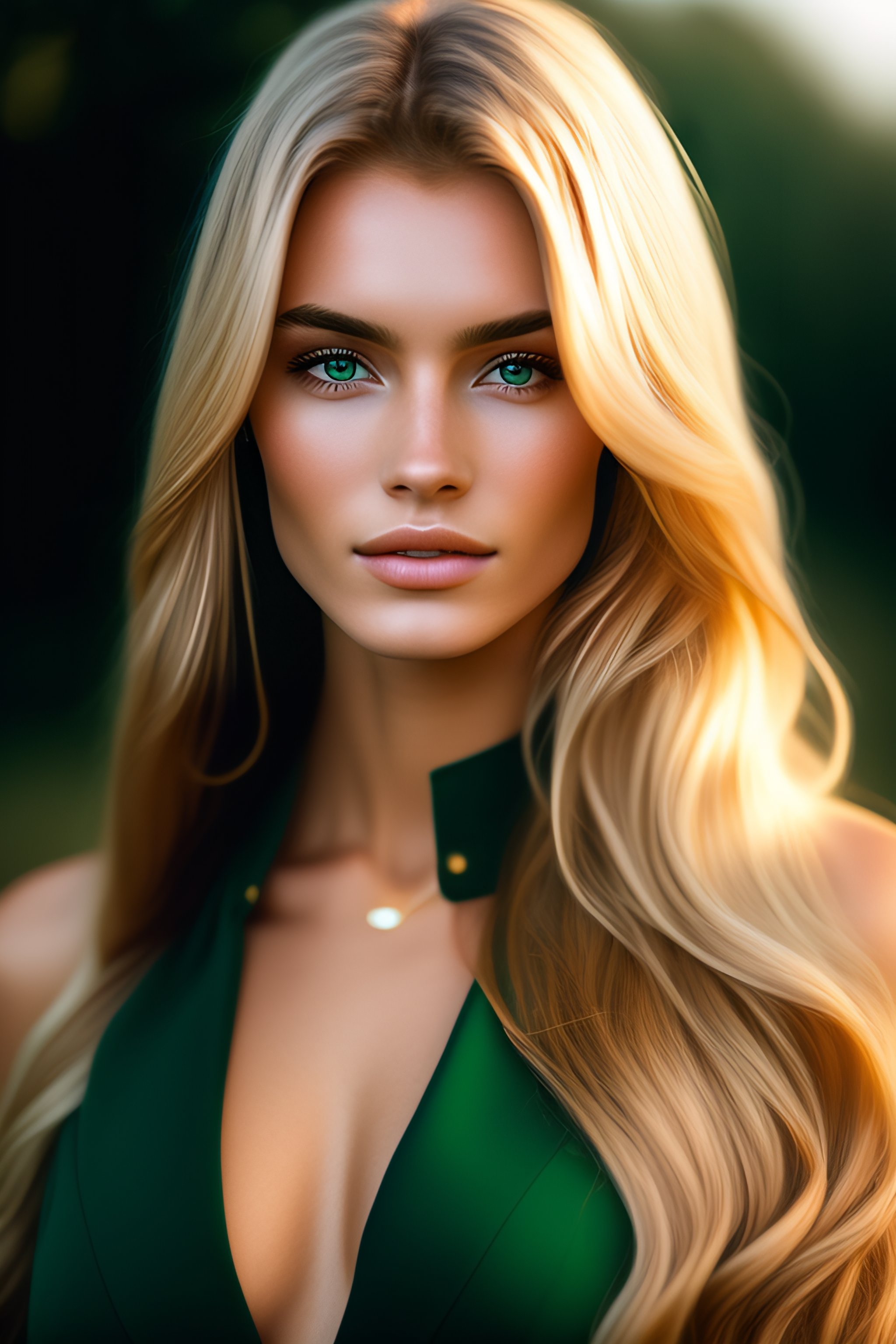 Brunette with long dyed blonde hair, 21 years old, 165 cm tall, round shaped face, big forehead, lop eared, thin eyebrows, emerald eyes, darker skin, real life photograph