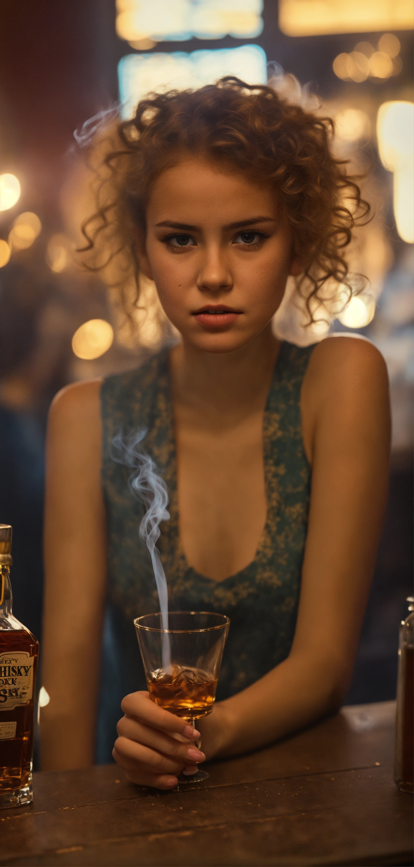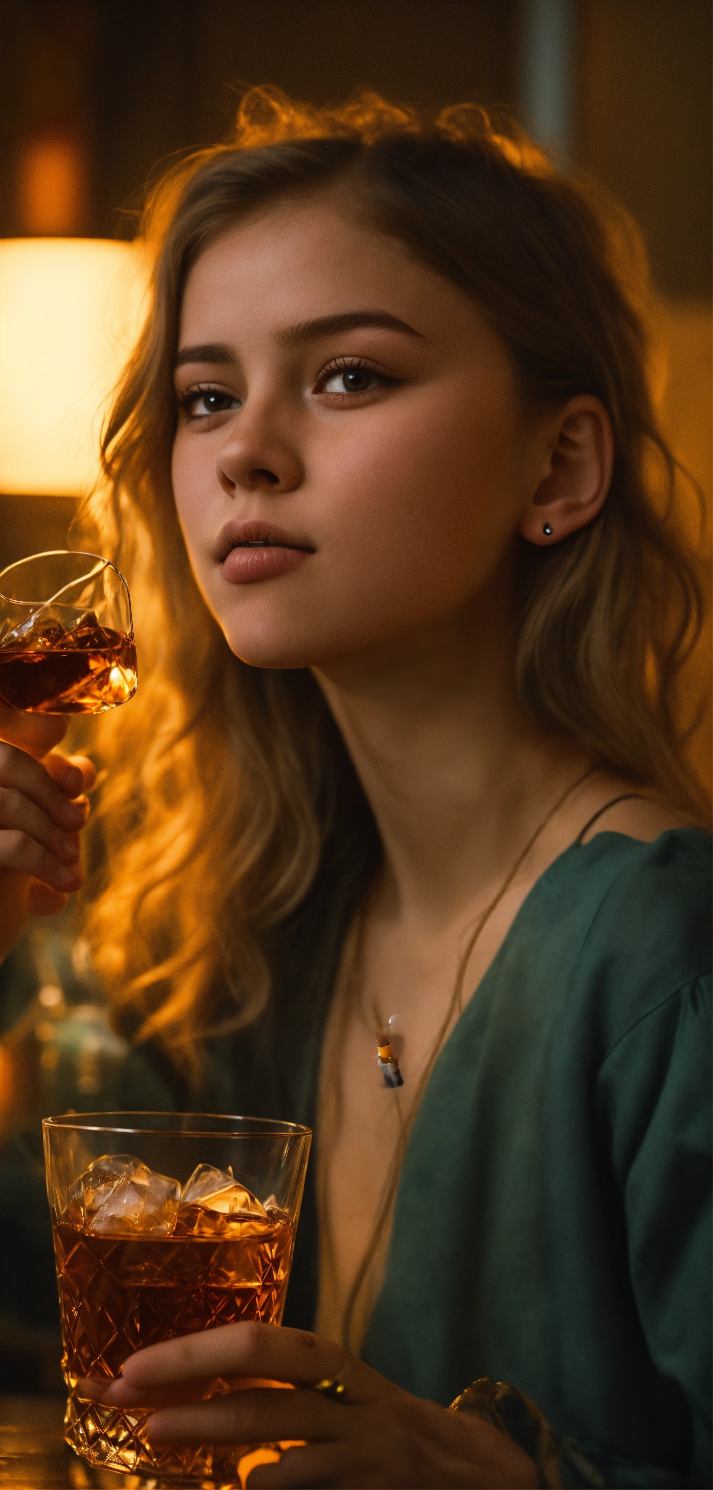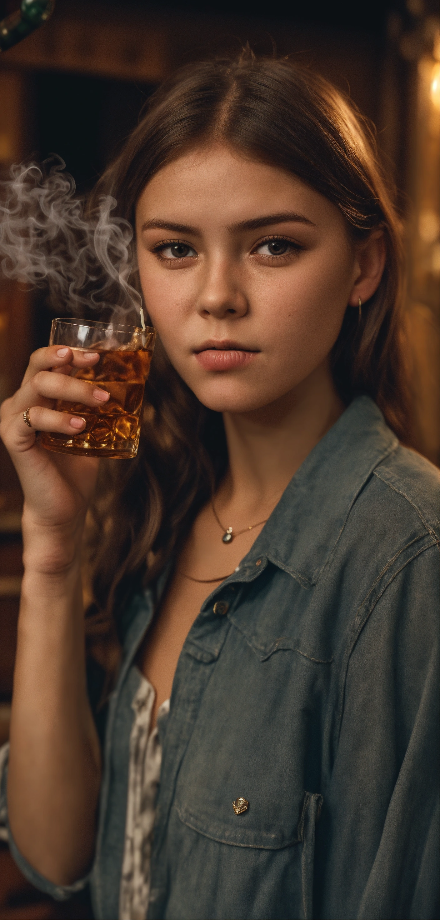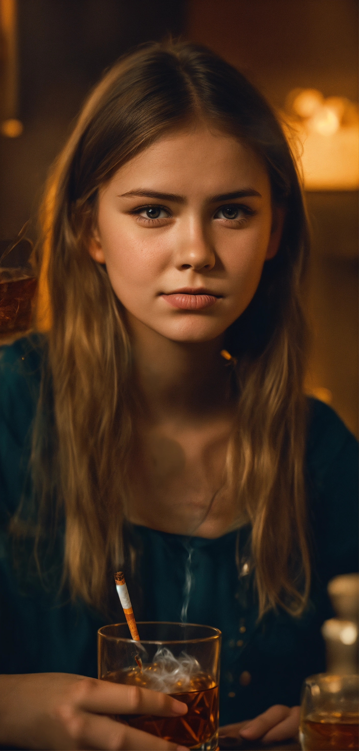 A young girl with a cheeky look of disdain on her face. in one hand the girl has a smoking cigarette. in her other hand, a glass of whiskey with ice. the girl looks at the camera with a cheeky look of disdain on her face.