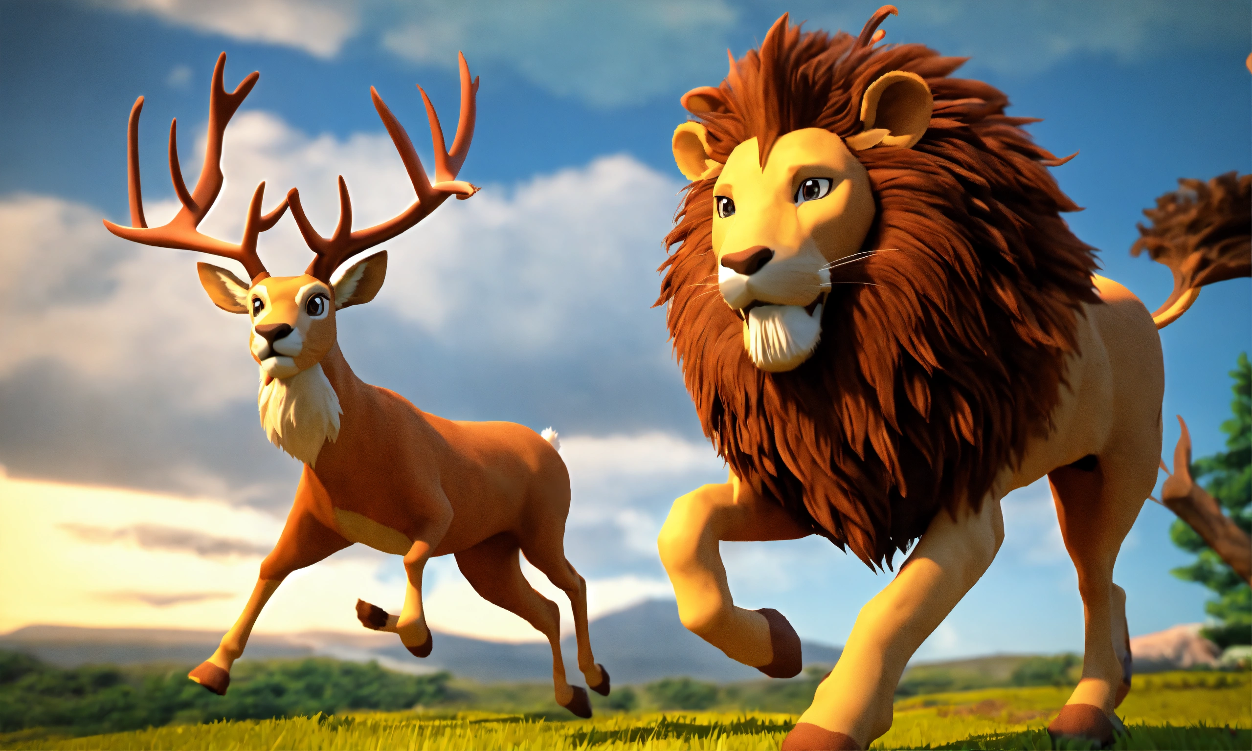 3d animation style cartoon deer running ahead behind it lion running