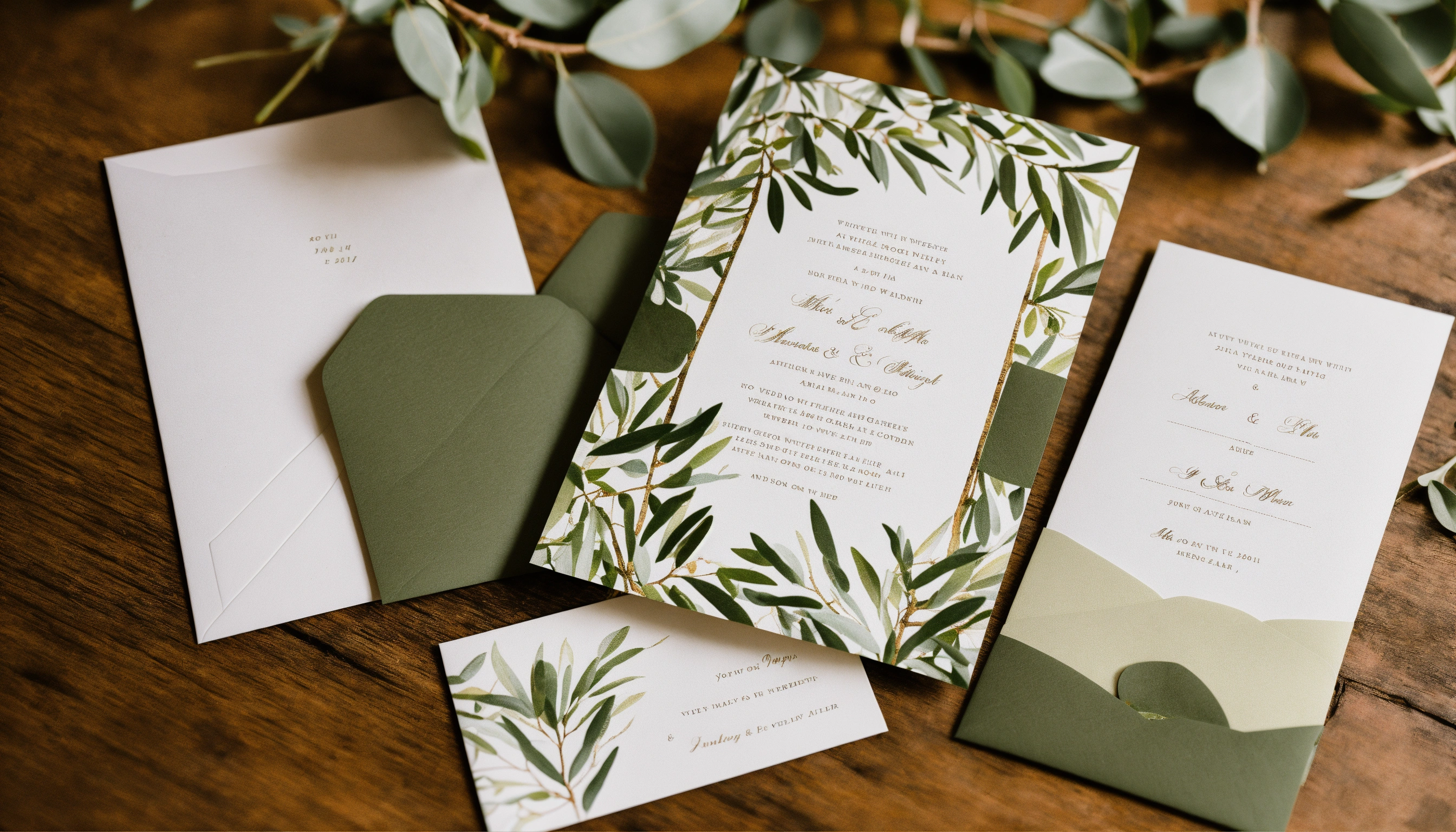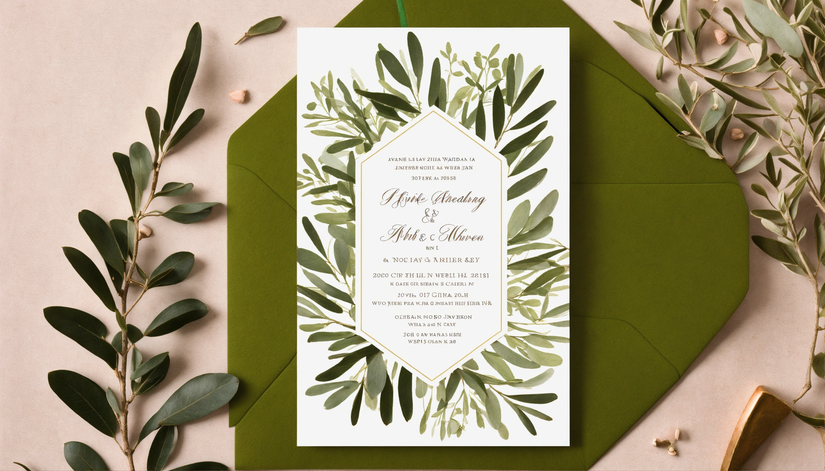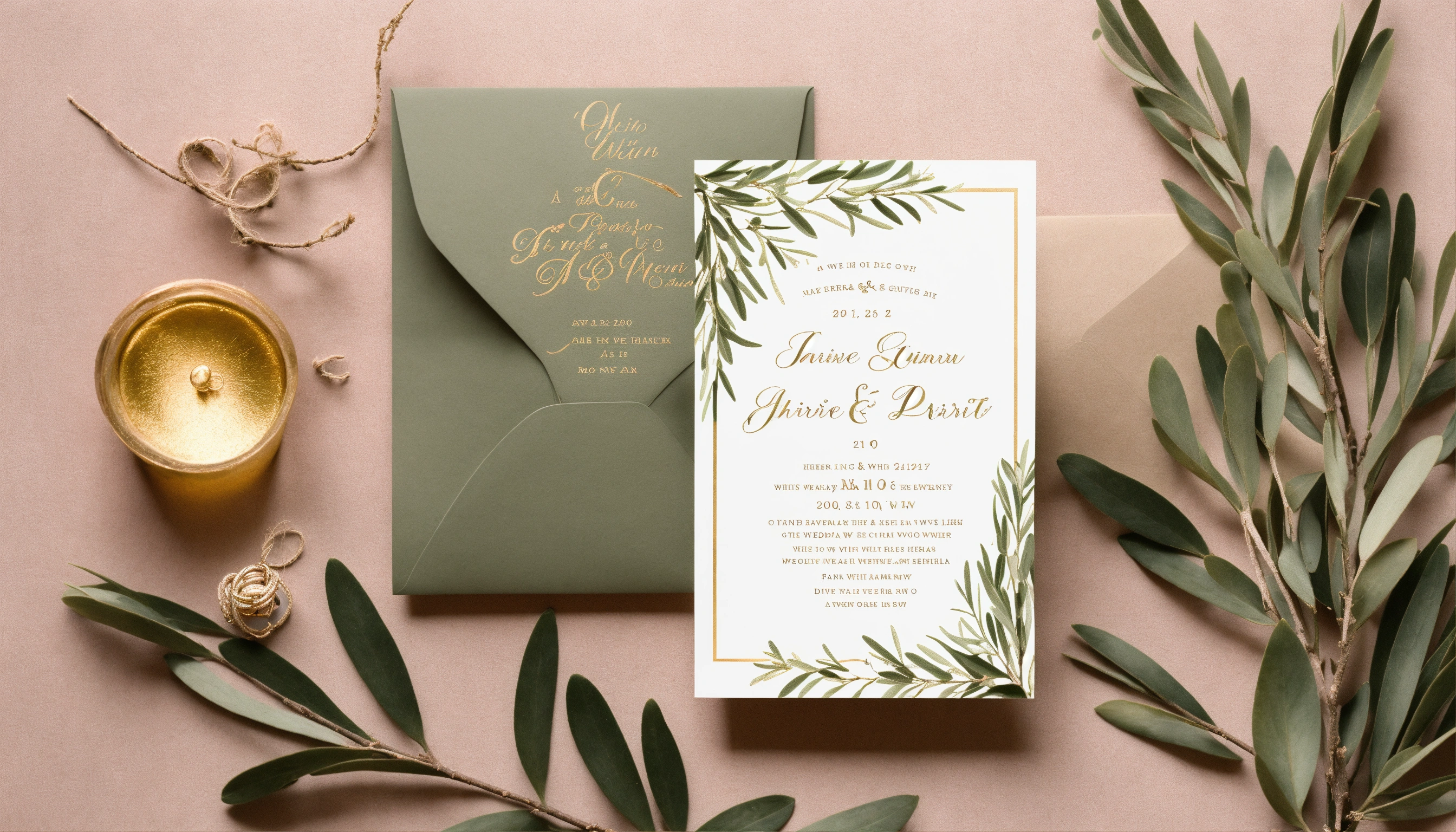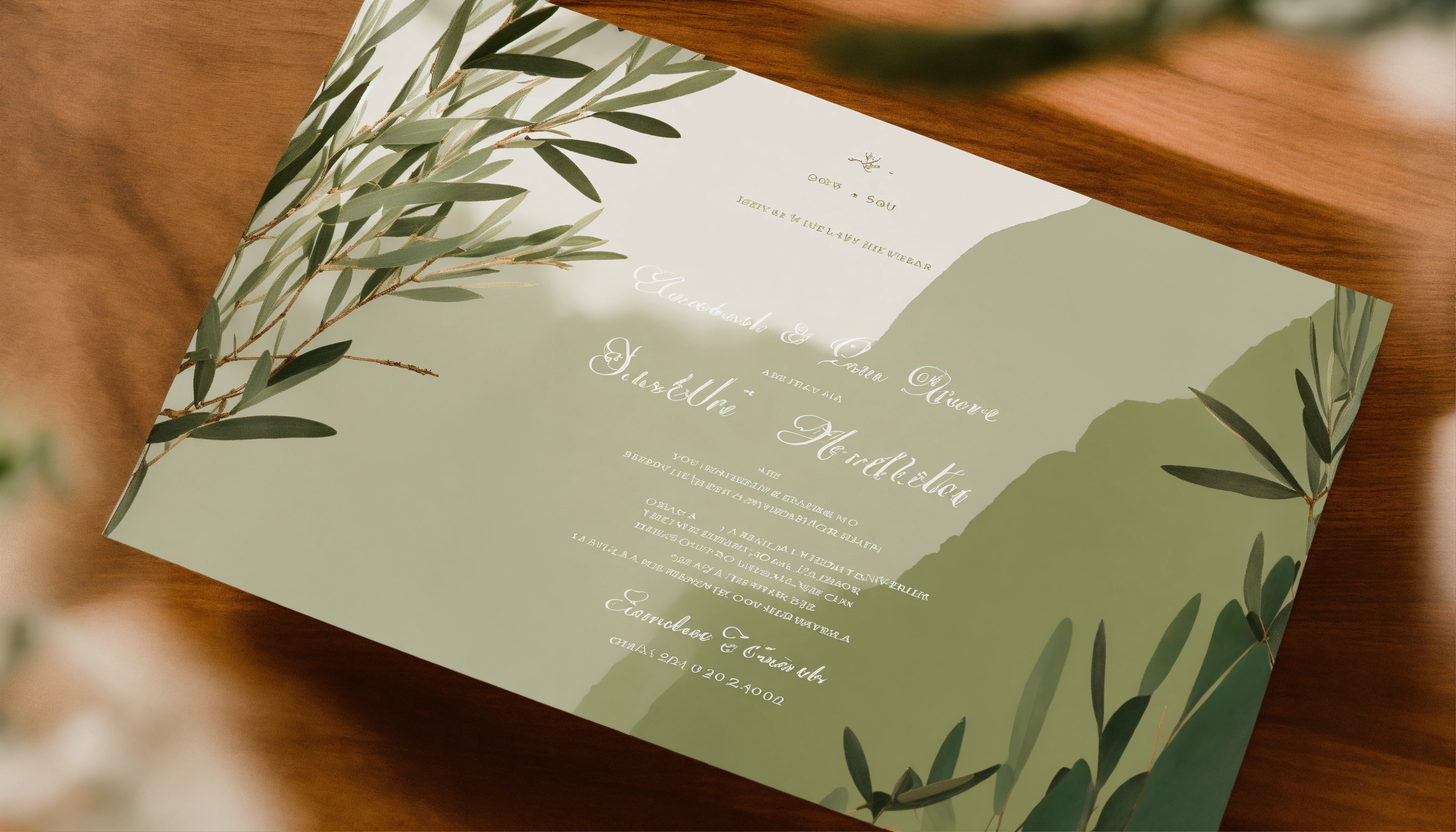 A wedding invitation with a white in the back and olive tree branches