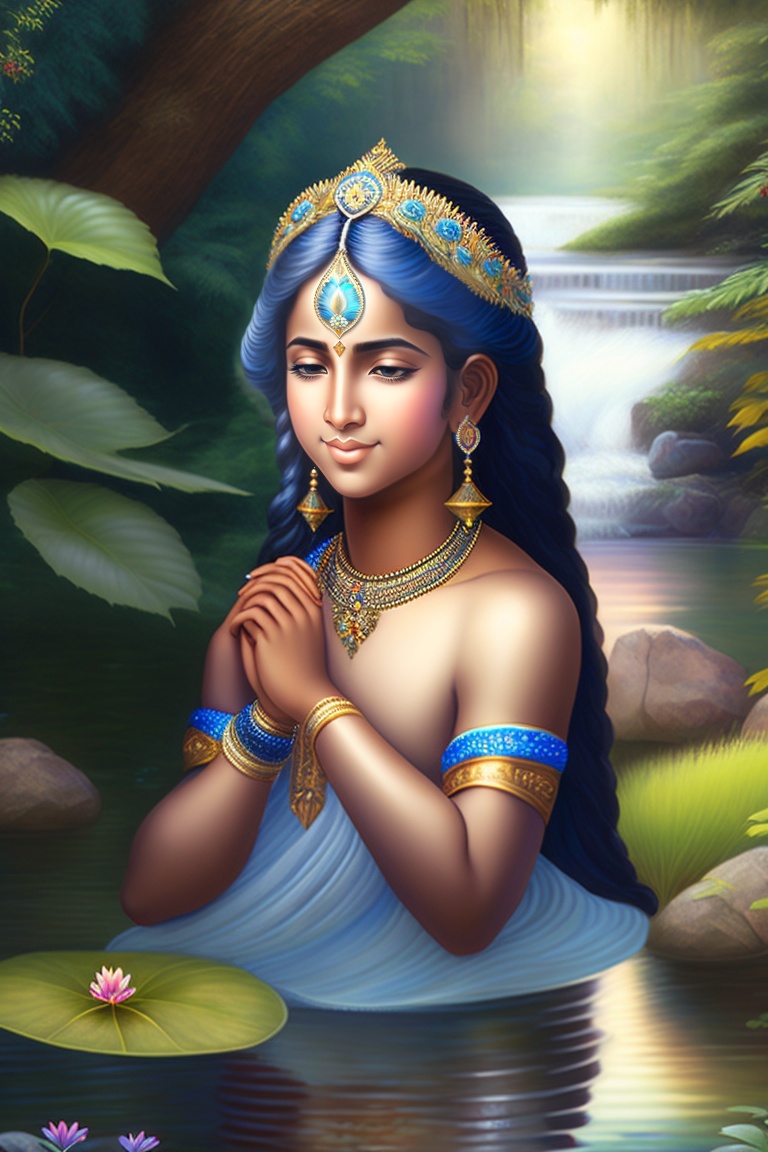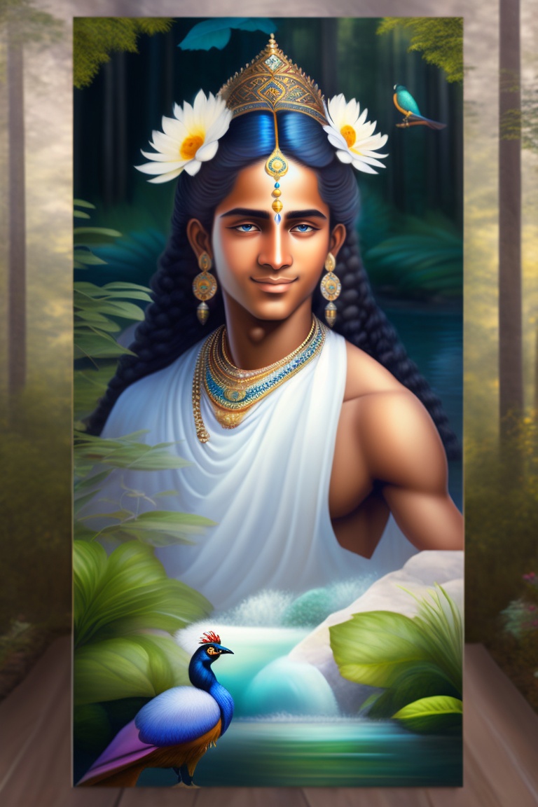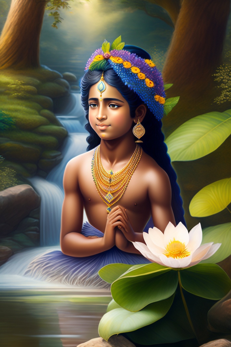 A beautiful, realistic image of lord krishna, the hindu god of love and compassion. he is depicted as a young boy, with dark skin, blue eyes, and long, flowing hair. he is wearing a white dhoti and a peacock feather crown. he is sitting on a lotus flower, surrounded by lush greenery. the image is set in a peaceful forest clearing, with a stream flowing in the background. the overall feeling of the image is one of beauty, serenity, and divinity.