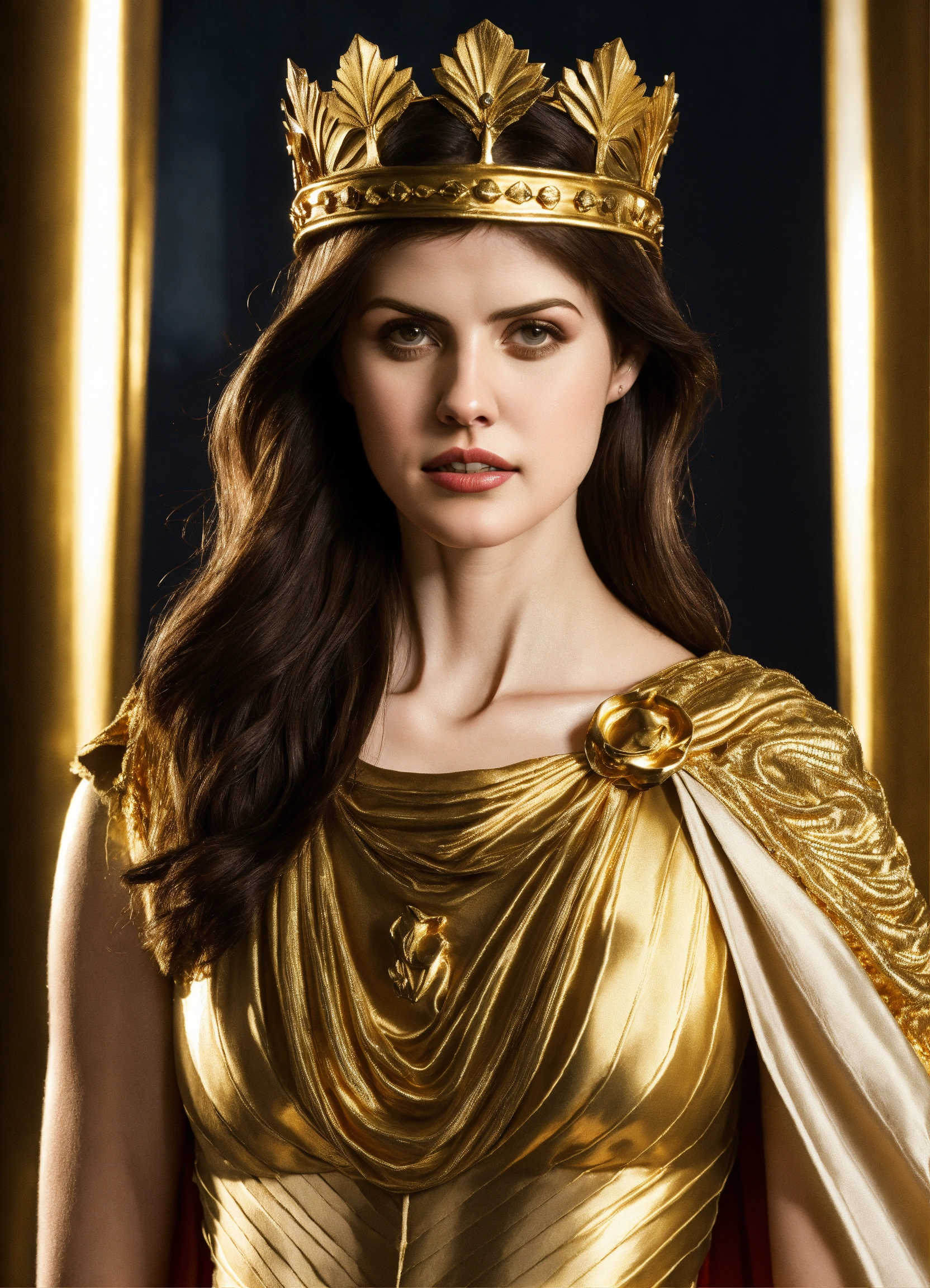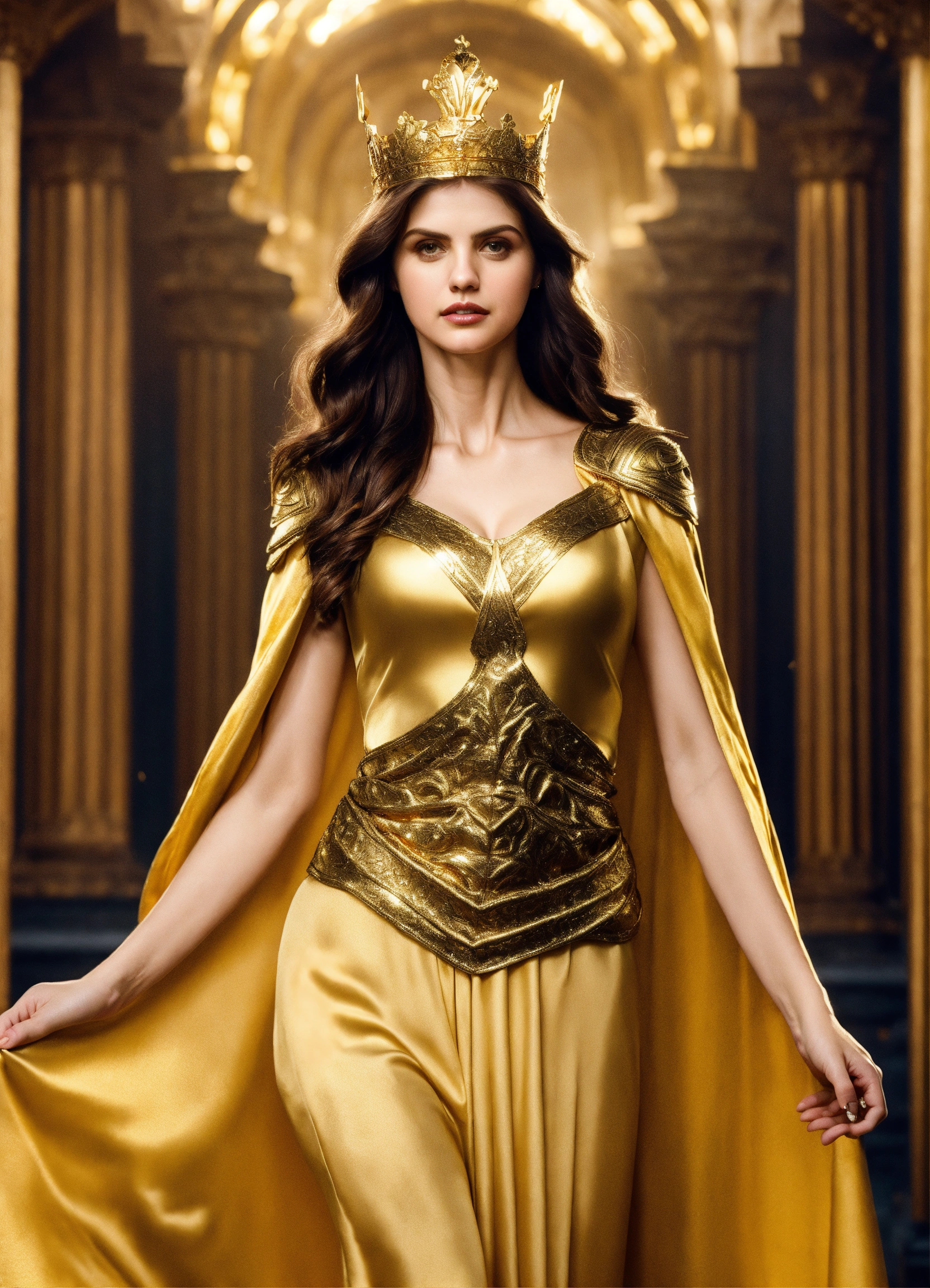 Alexandra daddario as greek goddess in golden armor with crown with silk golden cape