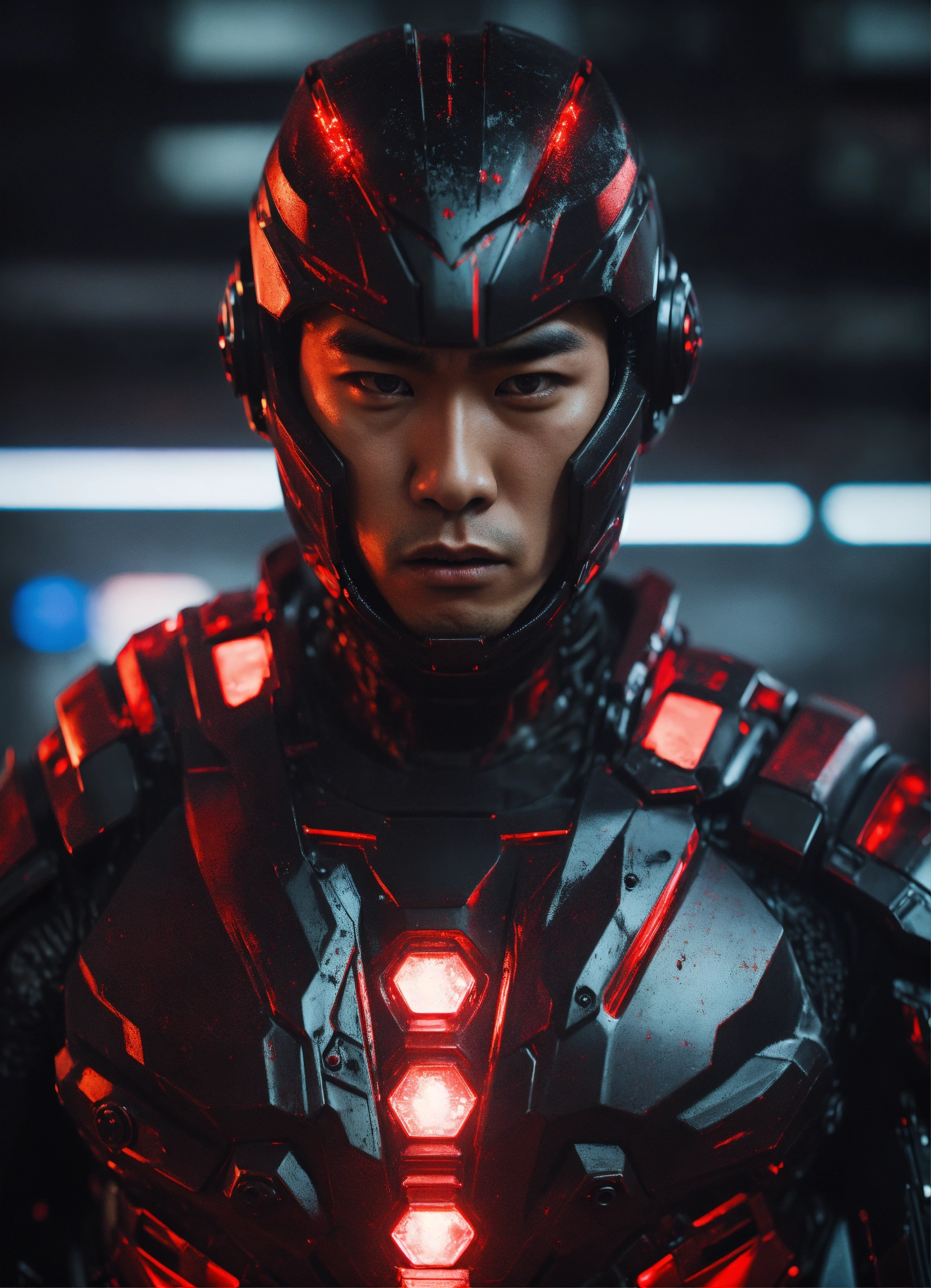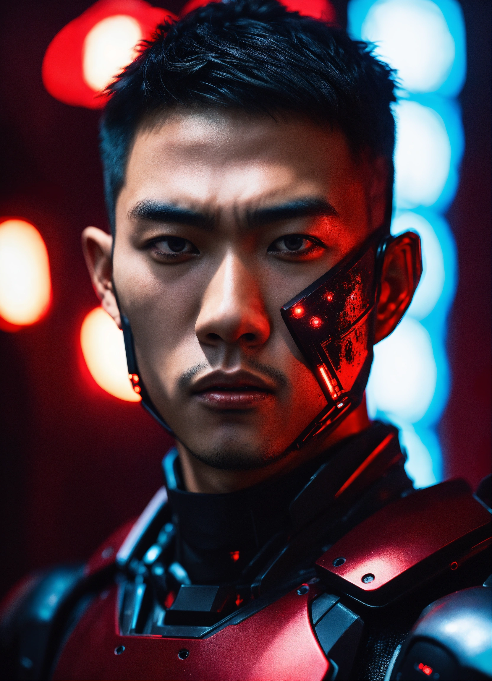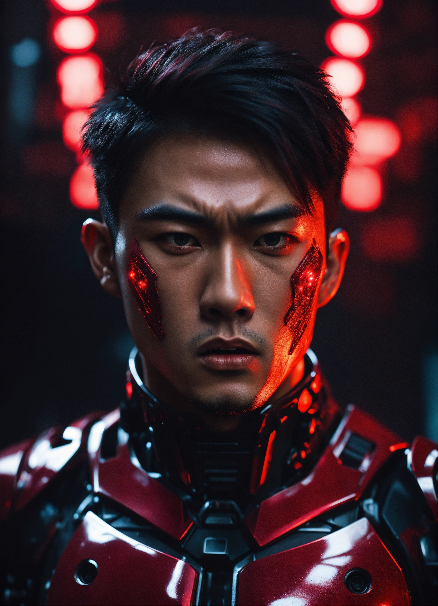 A realistic half body photo of an asian 25-year-old man with a very angry expression, slim fit muscled body, short hair with a bun, scary looking, sharp nose, wearing a sci-fi black robotic armor, covered with red dye, with a dark background with red leds, very dramatic illumination, hyperdetailed, hyperrealistic, 8 k