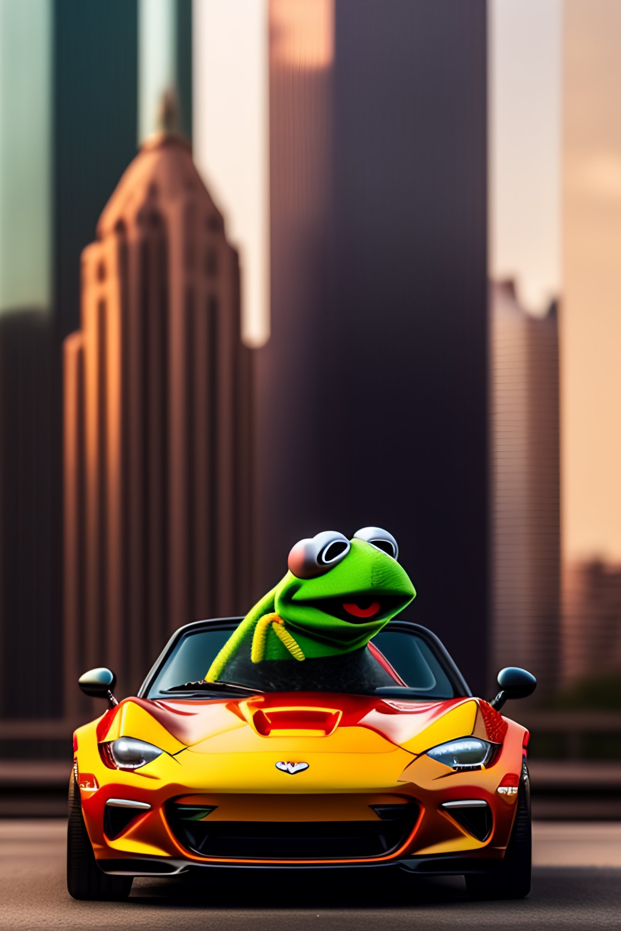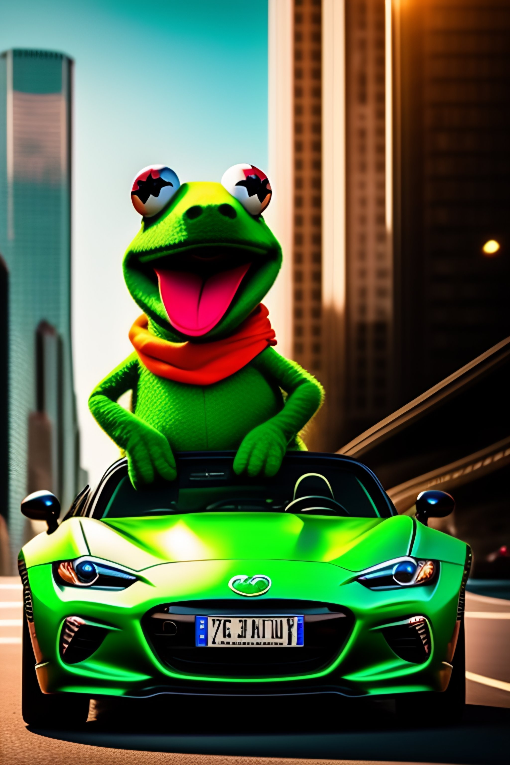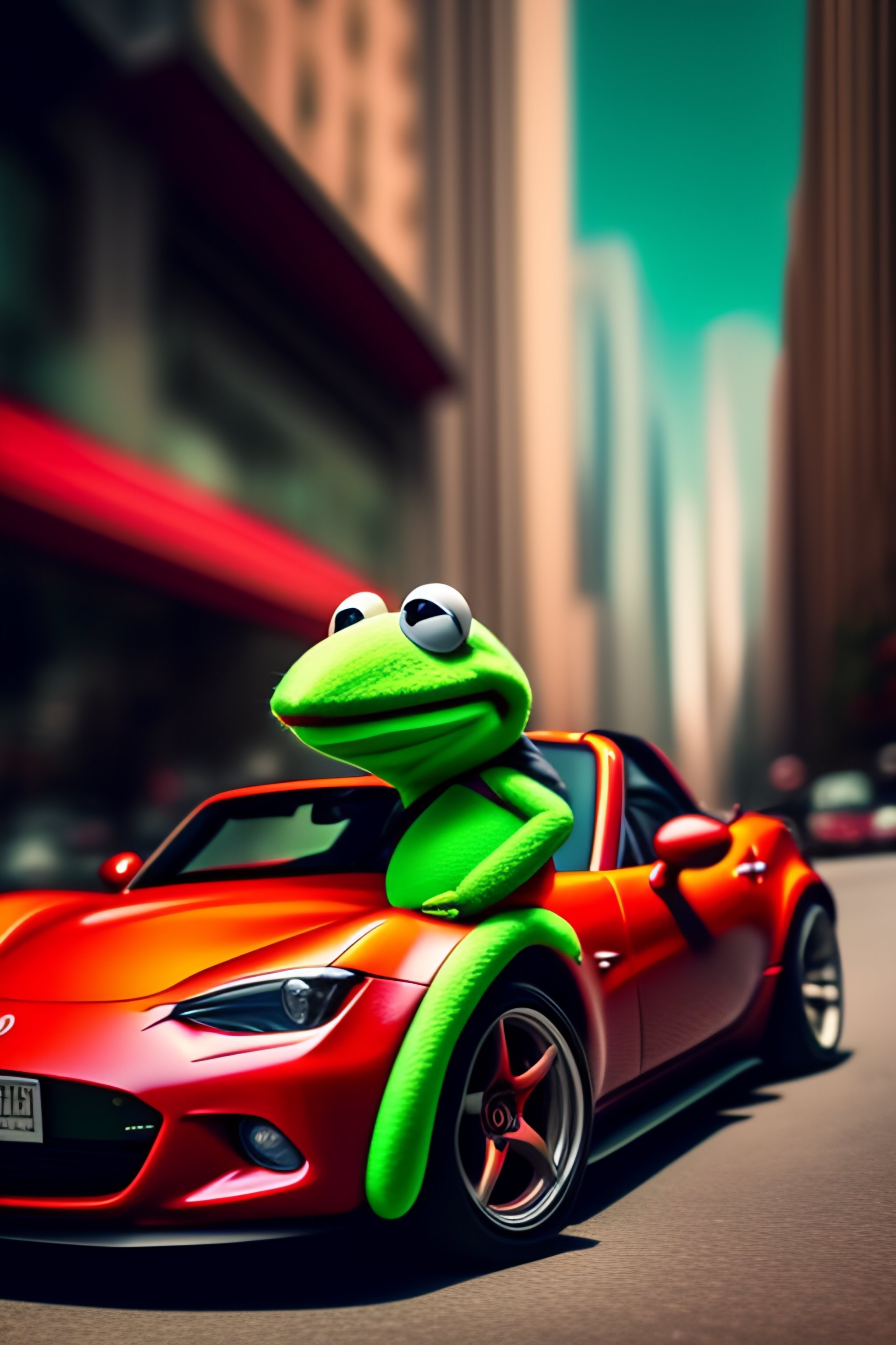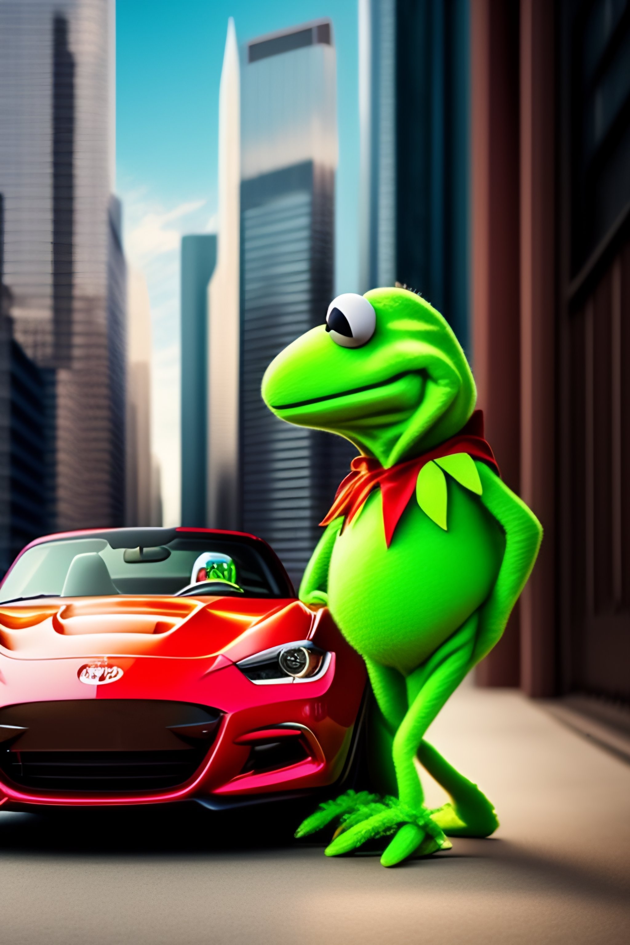 Kermit the frog driving a red miata