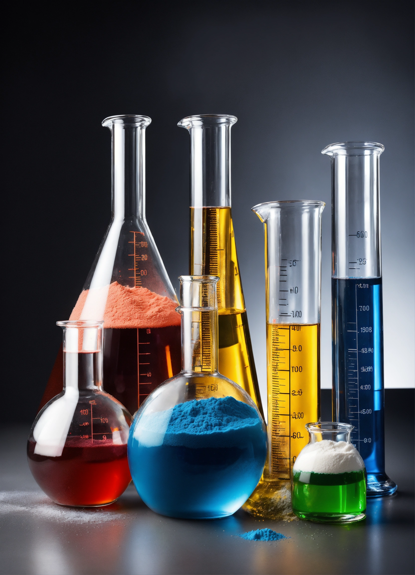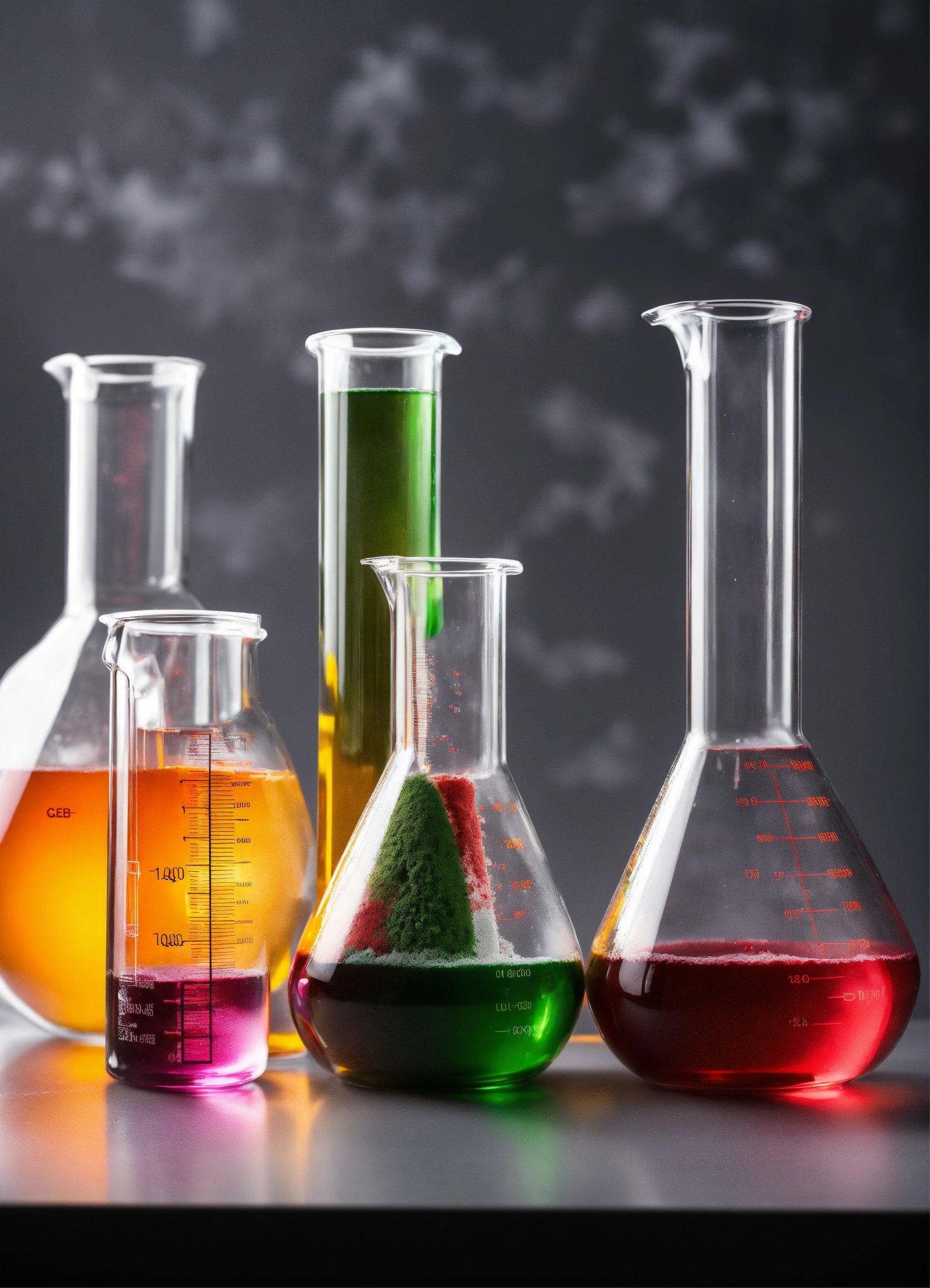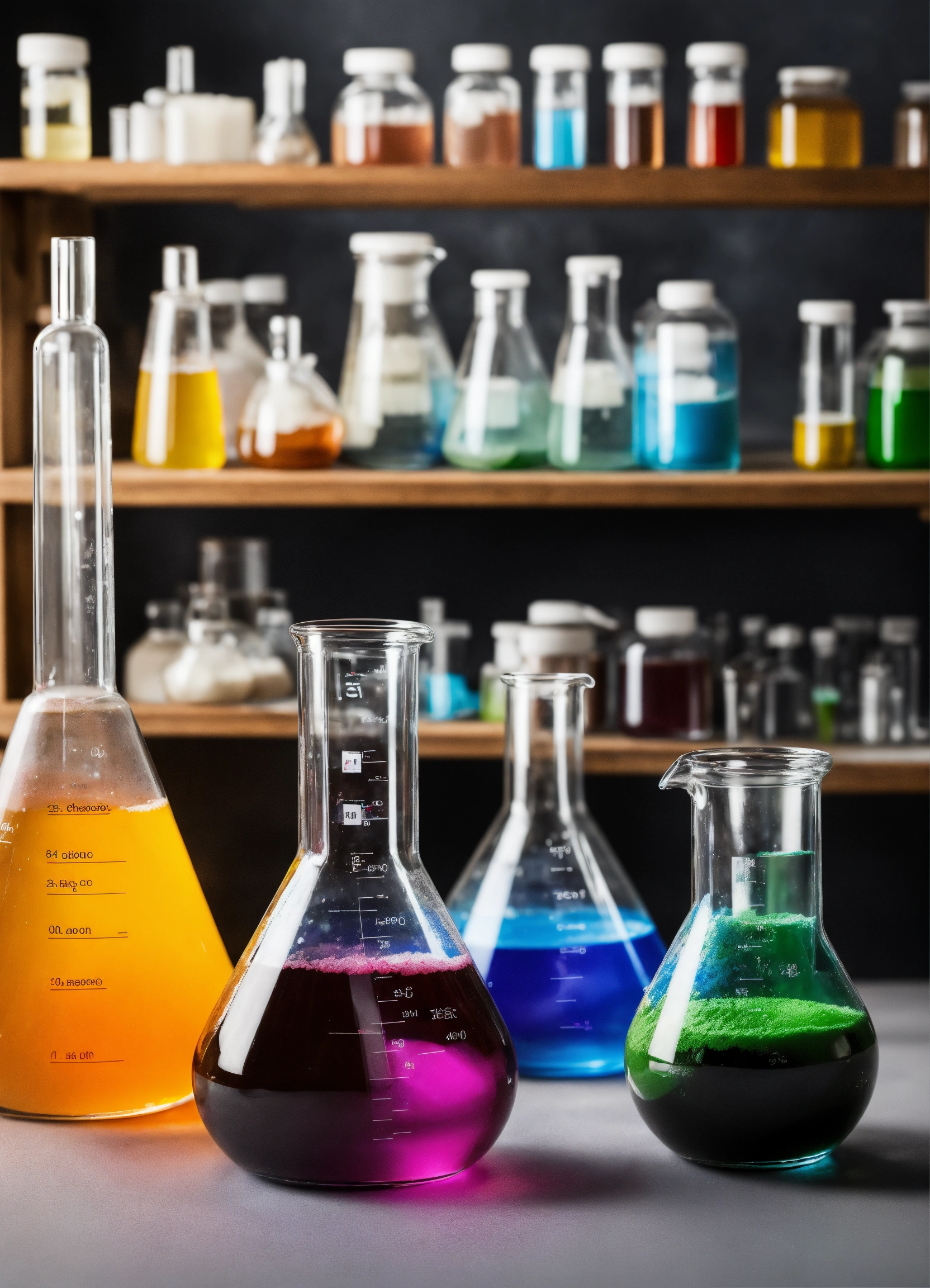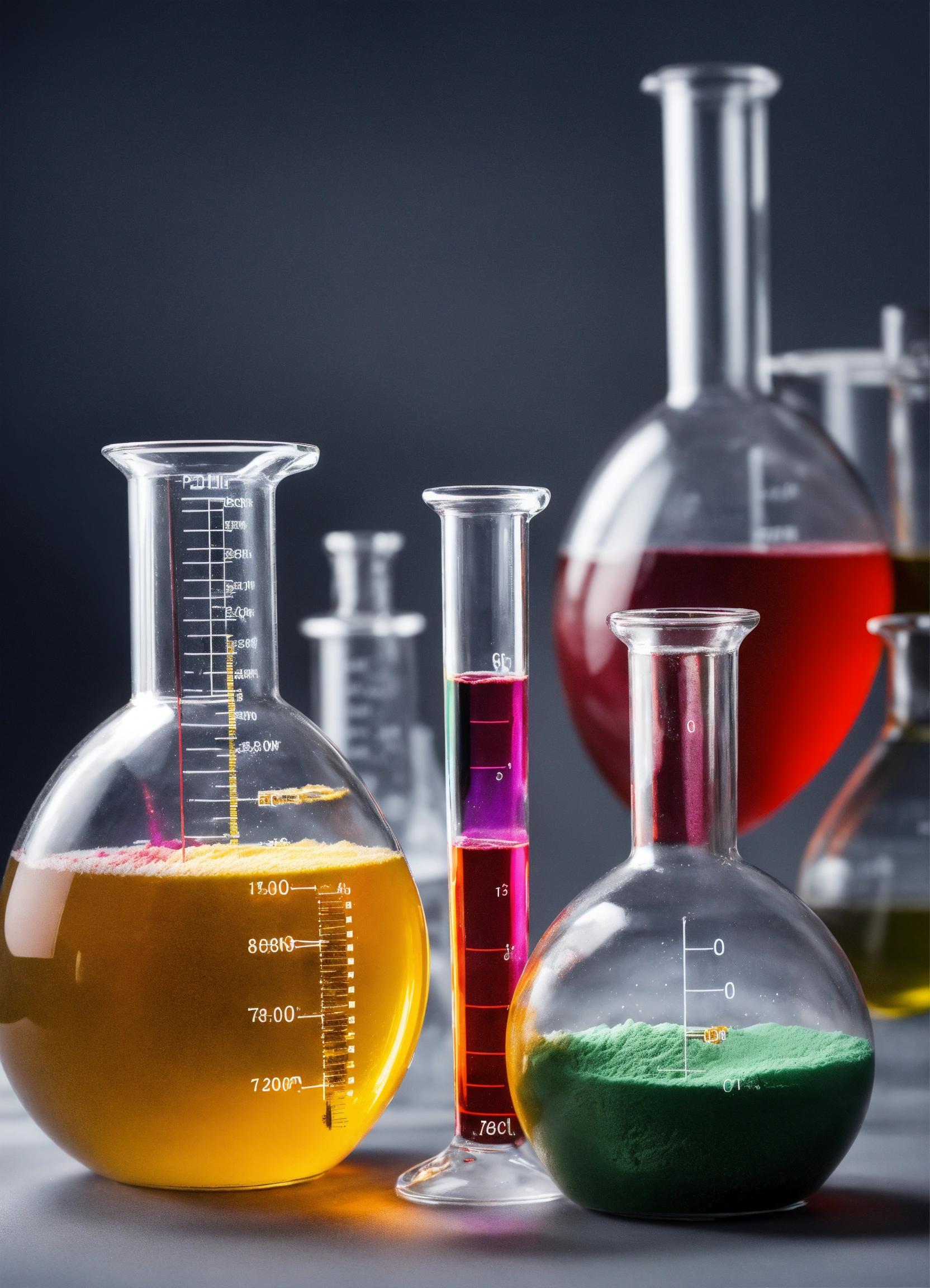 Different chemicals with powders and liquids in glassware in a laboratory environment, grey background