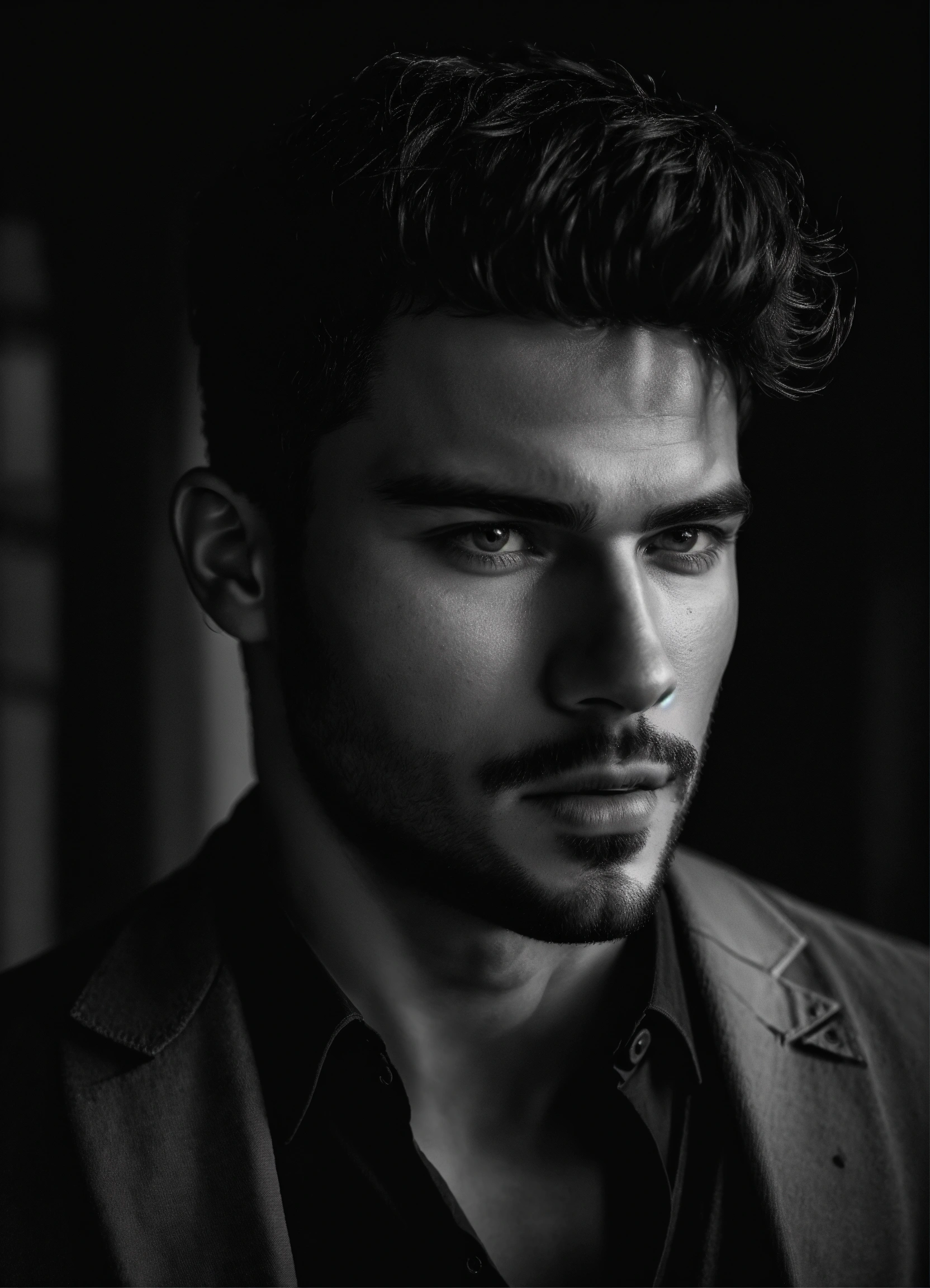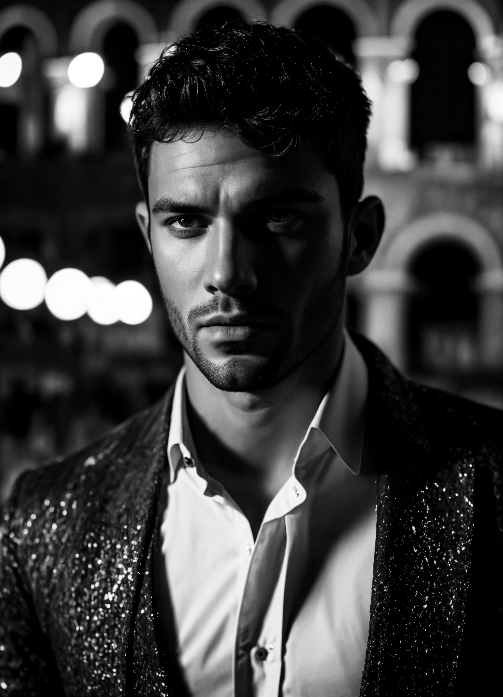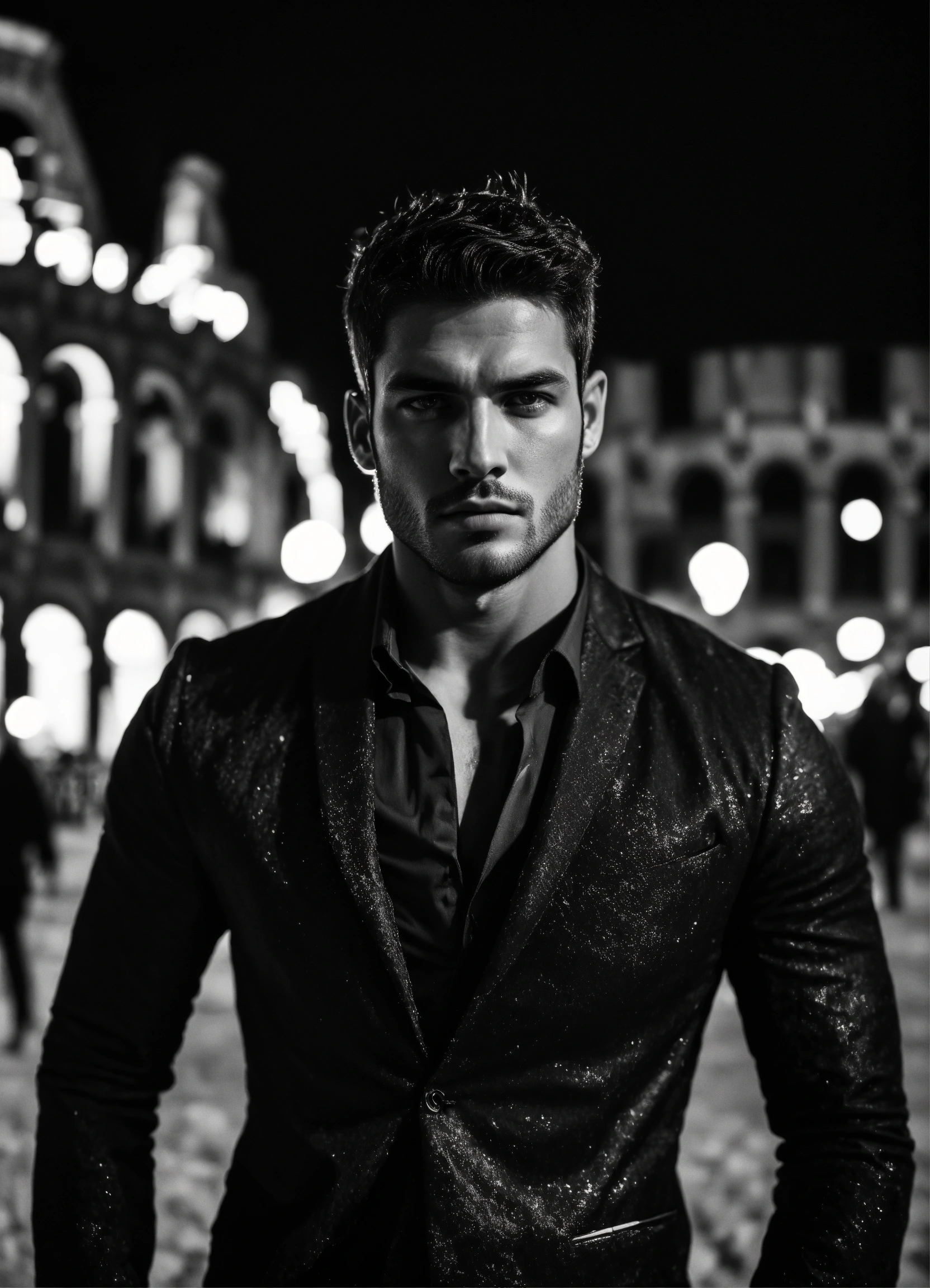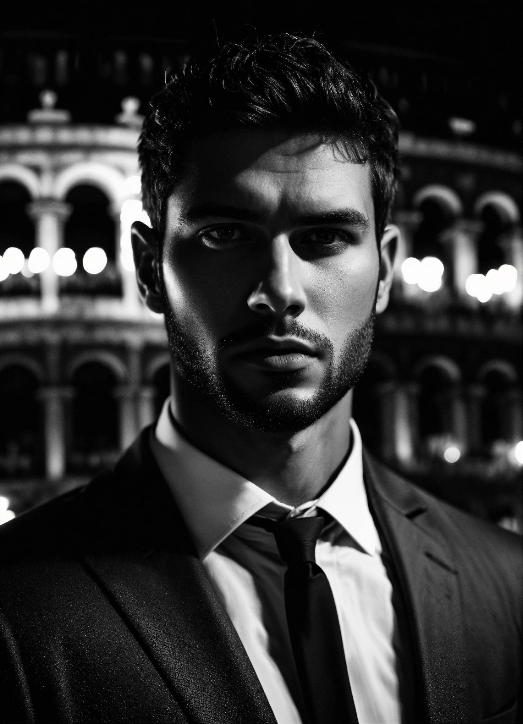 Photo of male model gonçalo teixeira, black and white, realistic, portrait, not painted, very detailed faces, skin with pores, 4k, dark suit, skin not smoothed, desire in the eyes, glowering, looking into the camera, dark shirt. colosseum in rome in full view at night as background