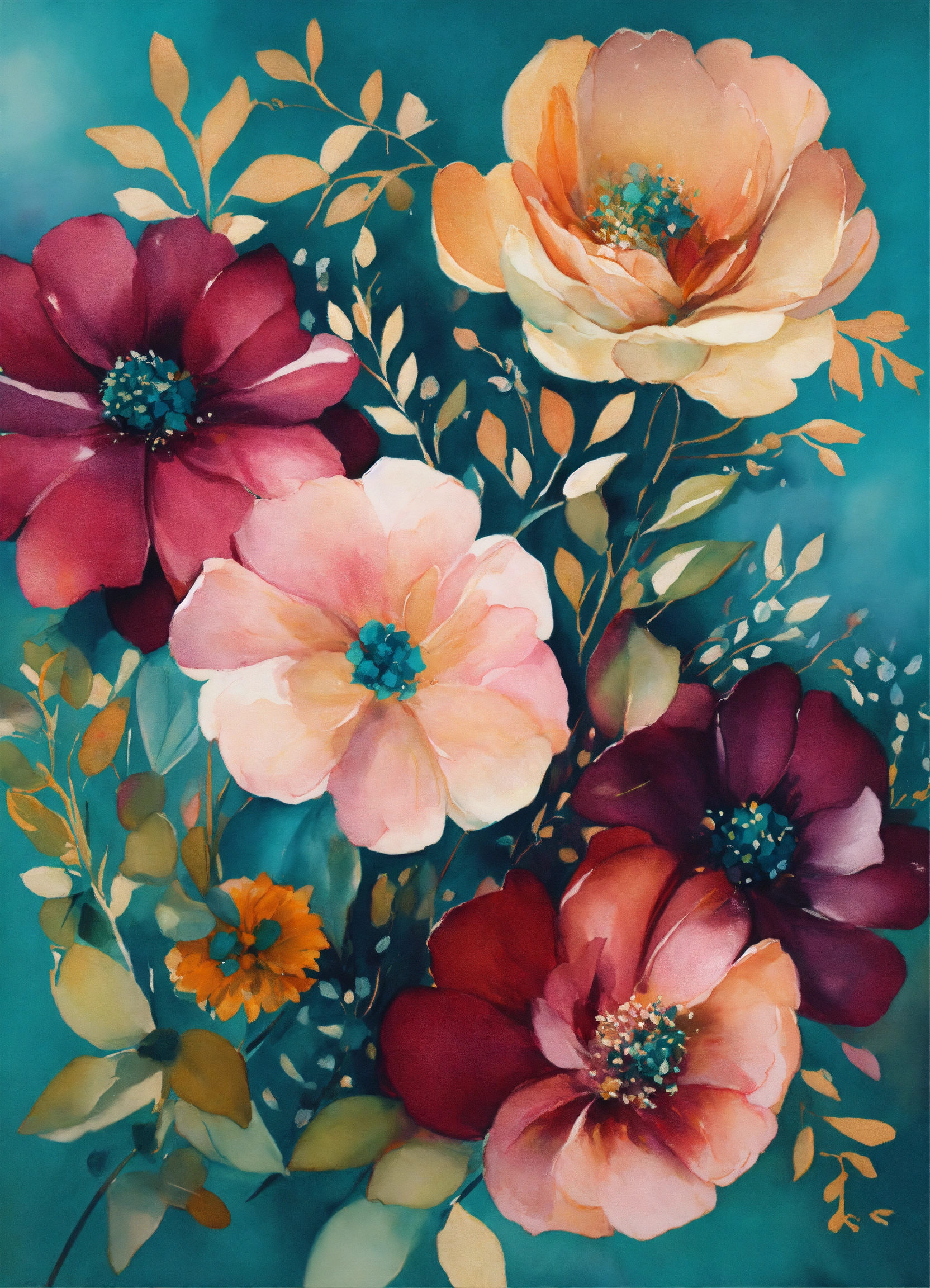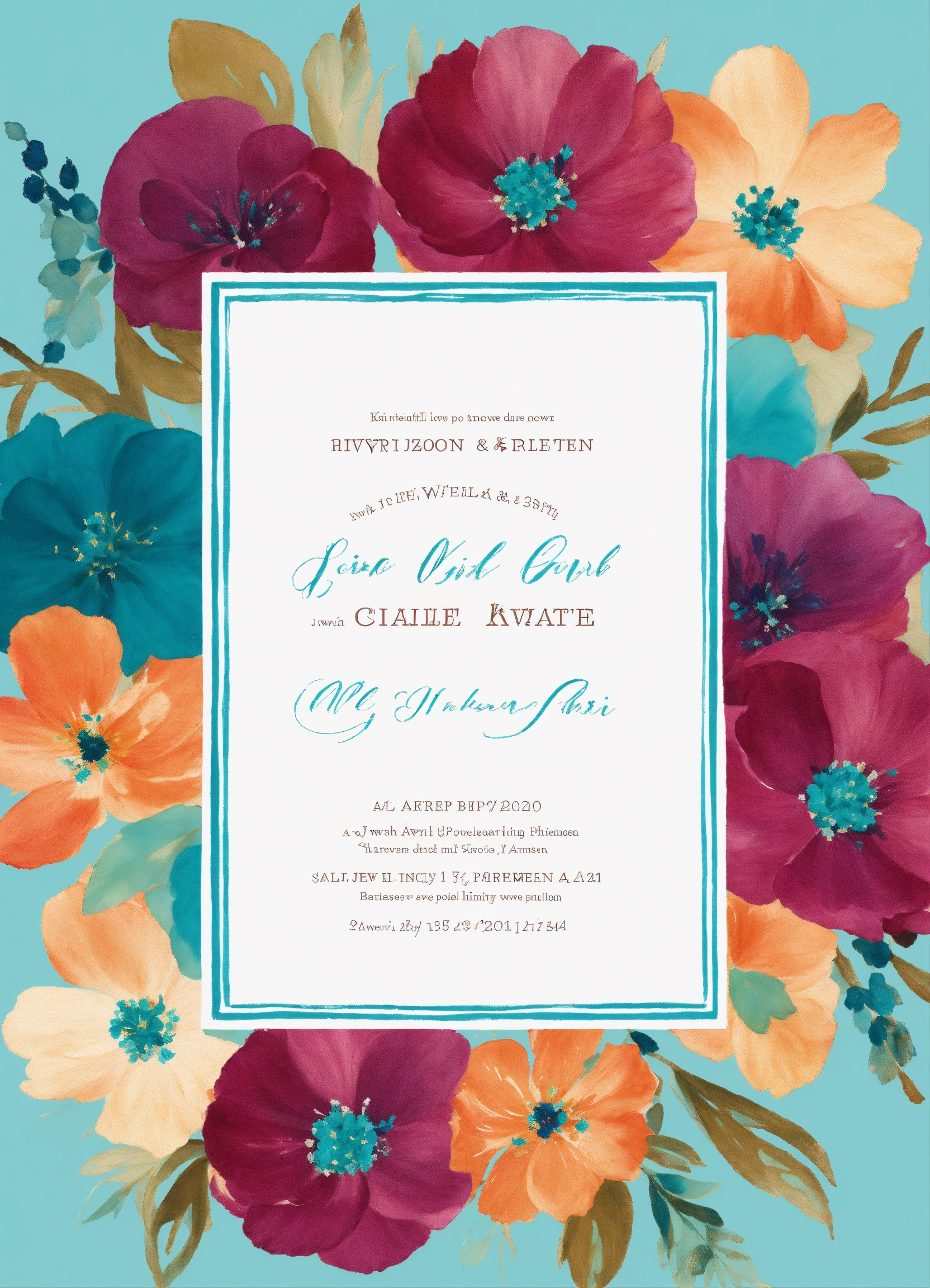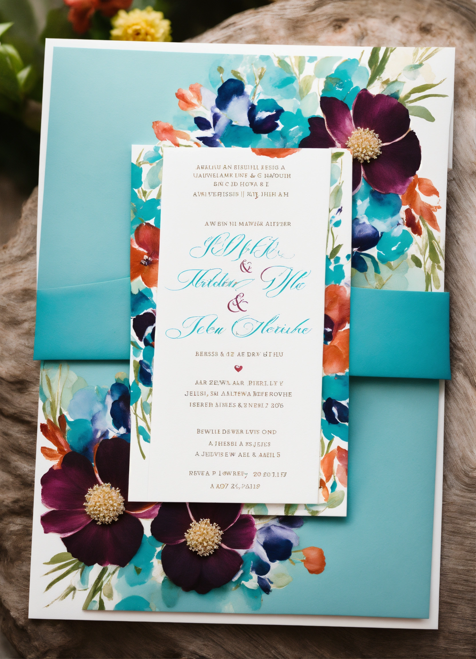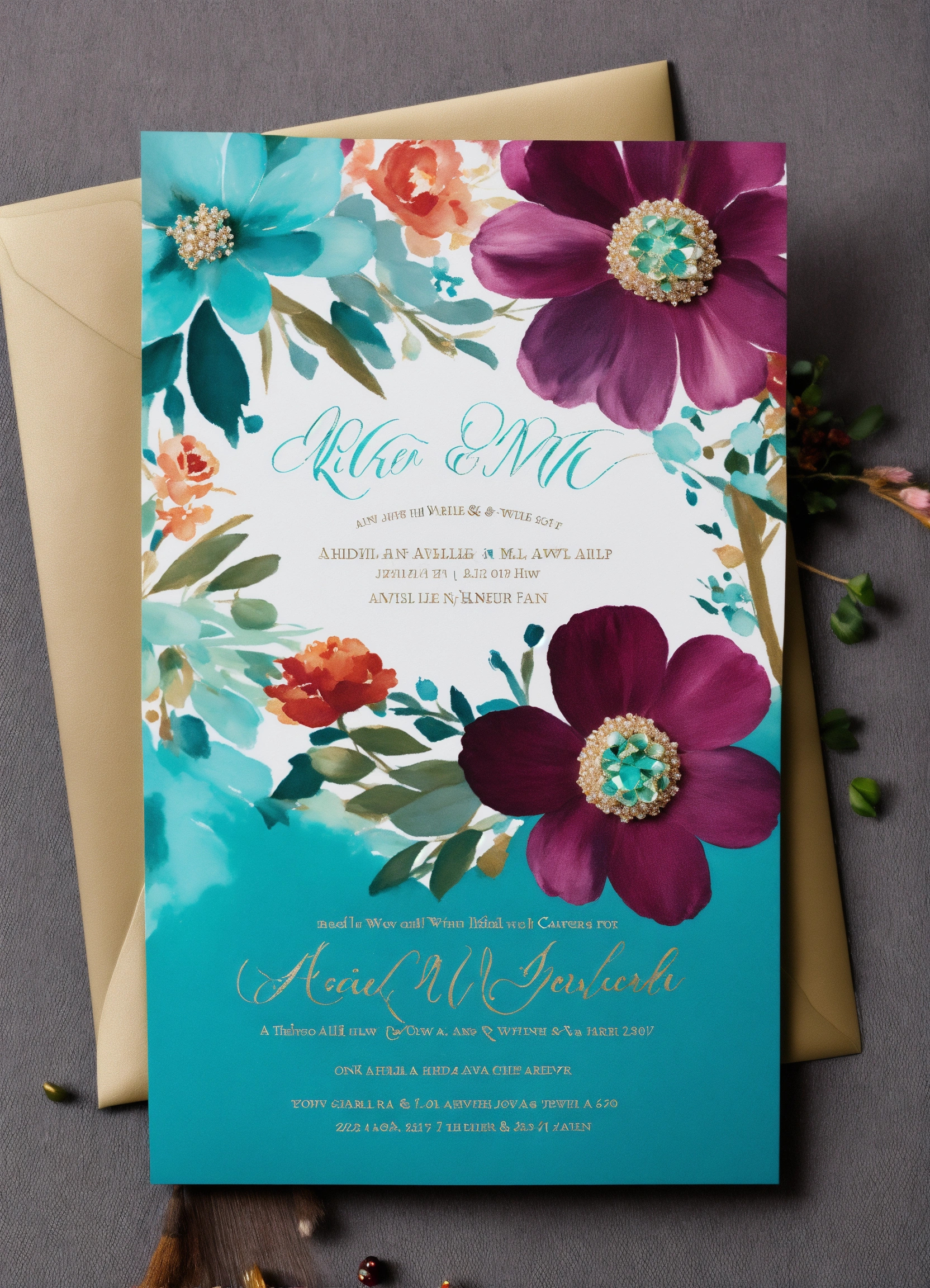 modern wedding invitation with turquoise and jewel tone painted flowers