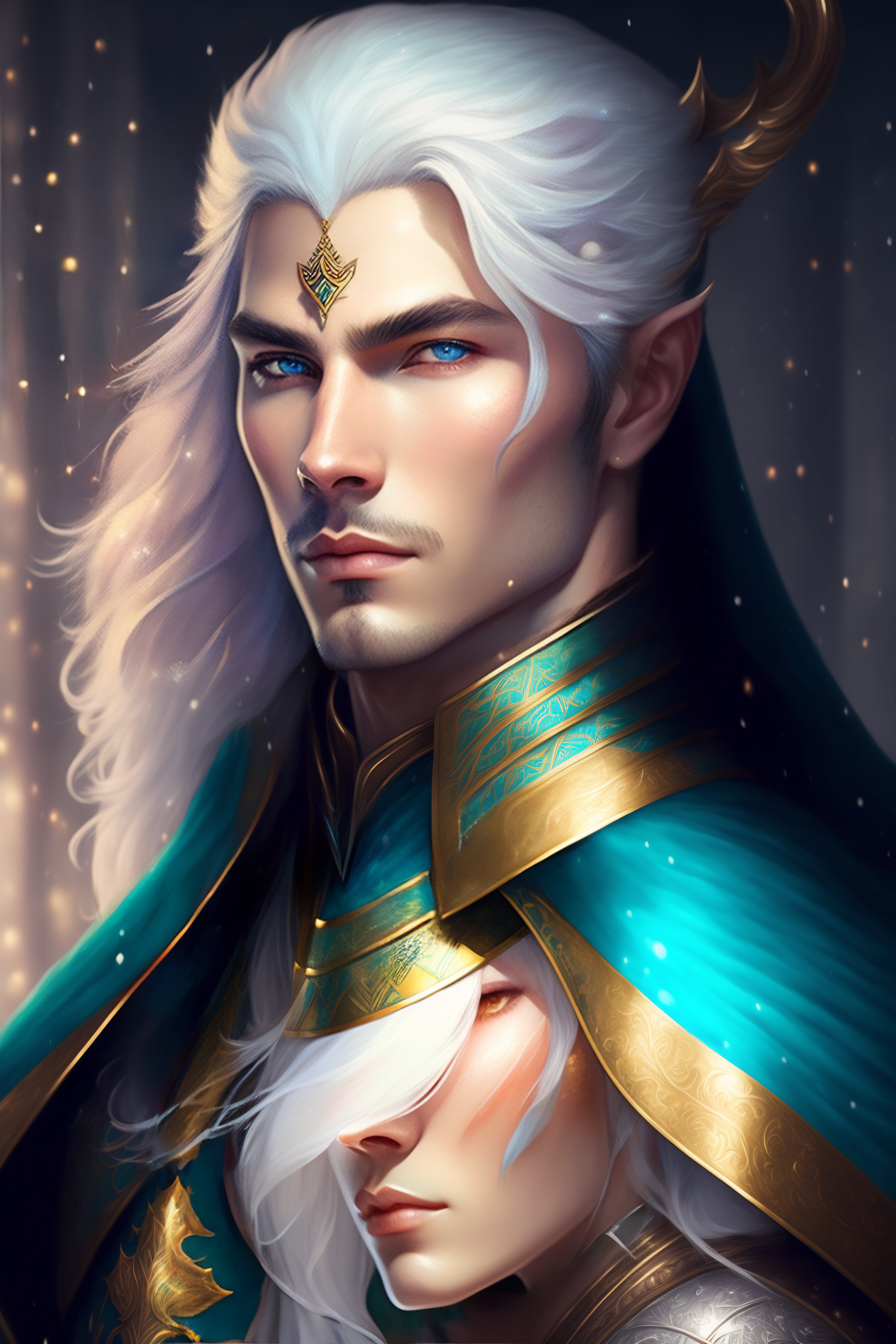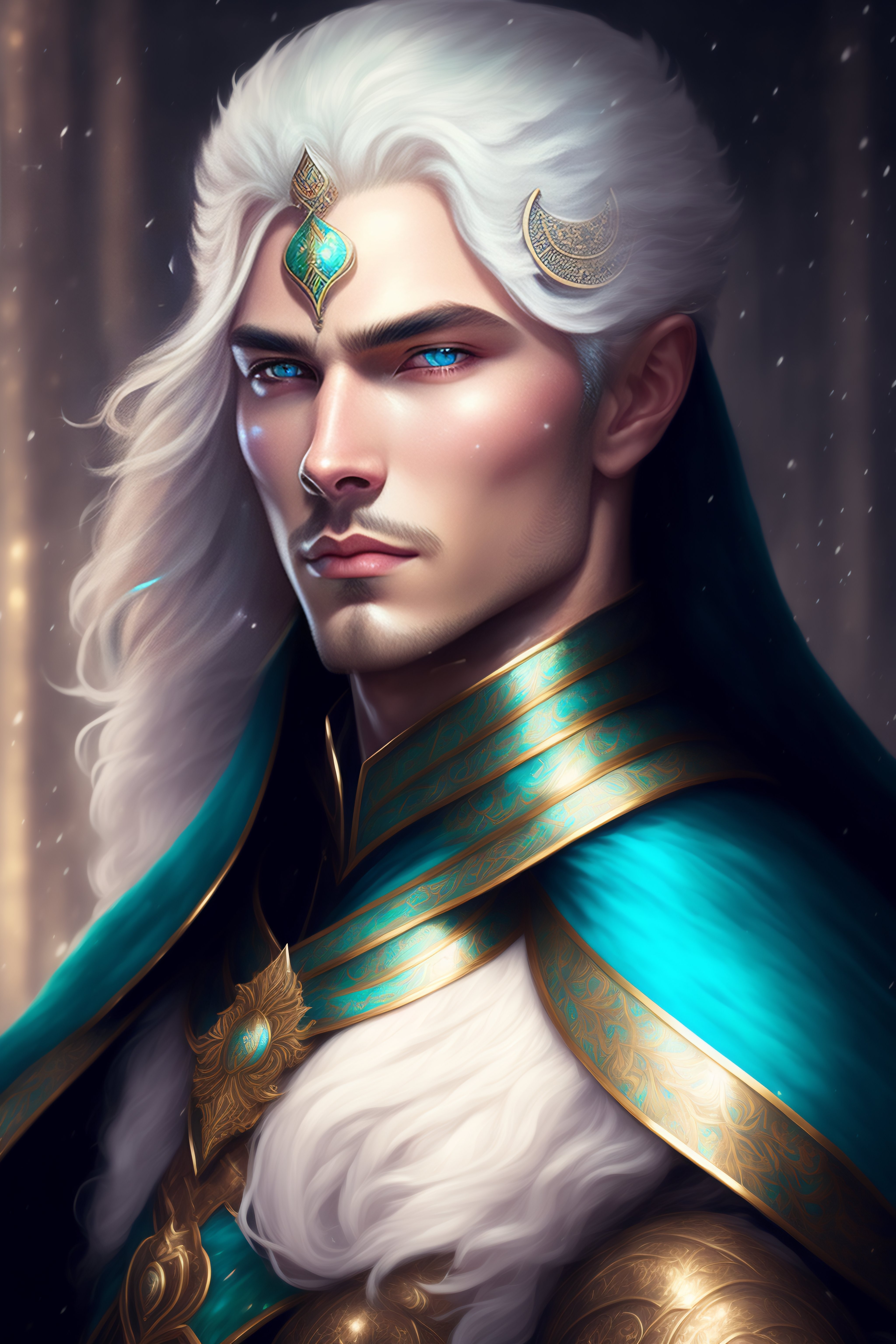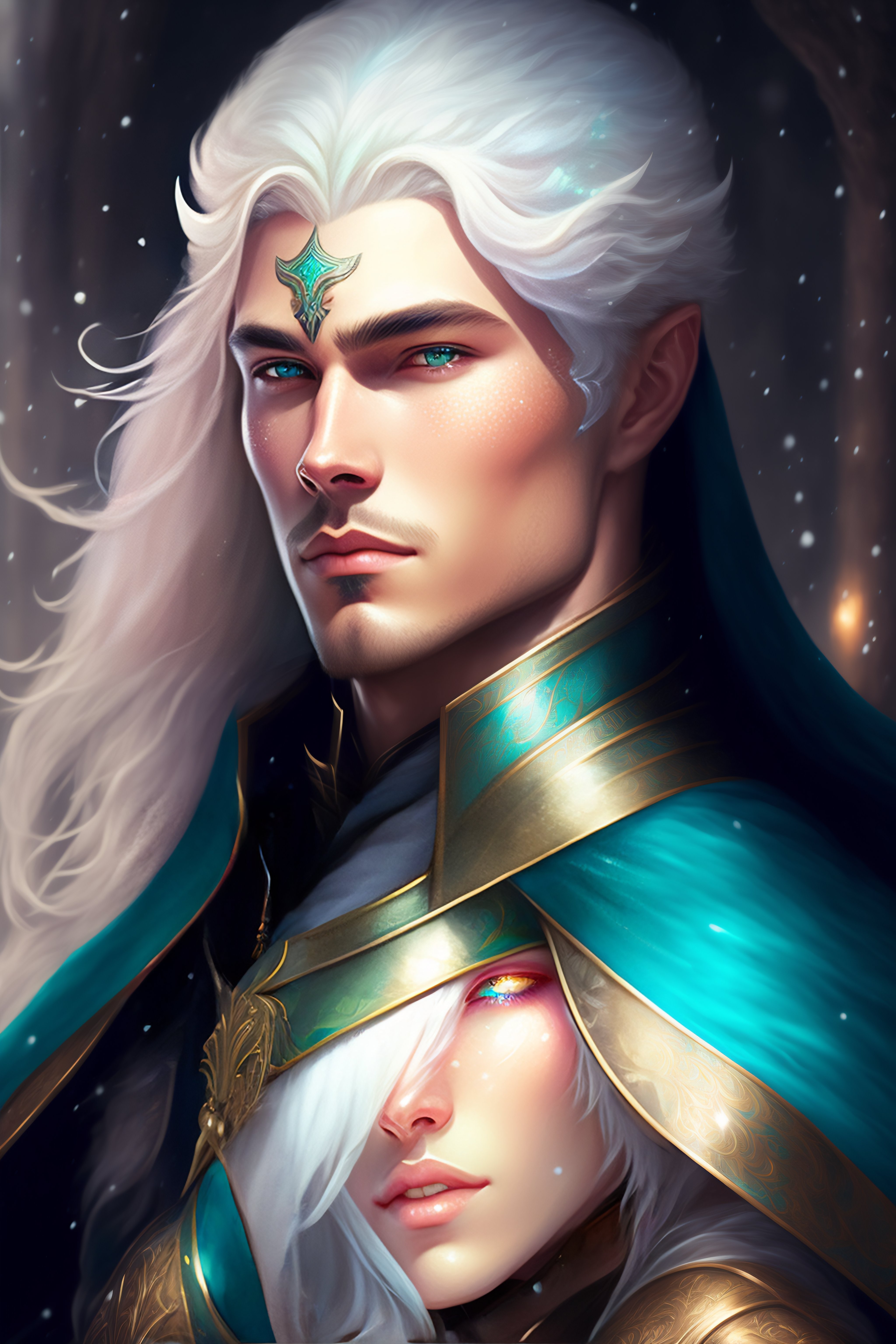 Half length portrait of a handsome male snow elf in a turquoise cape and silver ornate armour as an archer, albino skin, pale pointed ears, ethereal opalescent mist, moonlight snow, perfect face, elegant, very coherent symmetrical artwork, atmospheric lighting, rule of thirds, by wenjun lin, krenz cushart, charlie bowater, trending on artstation