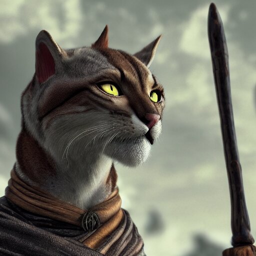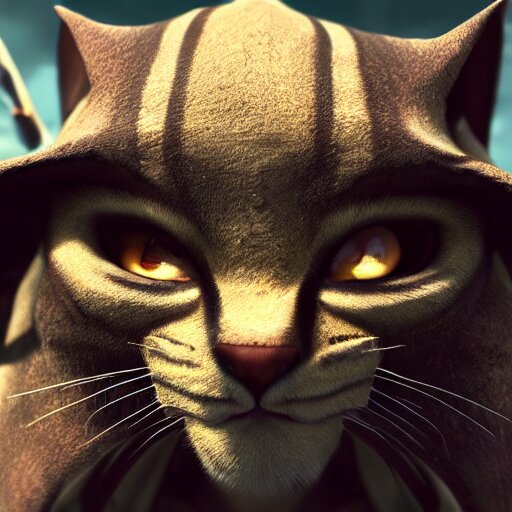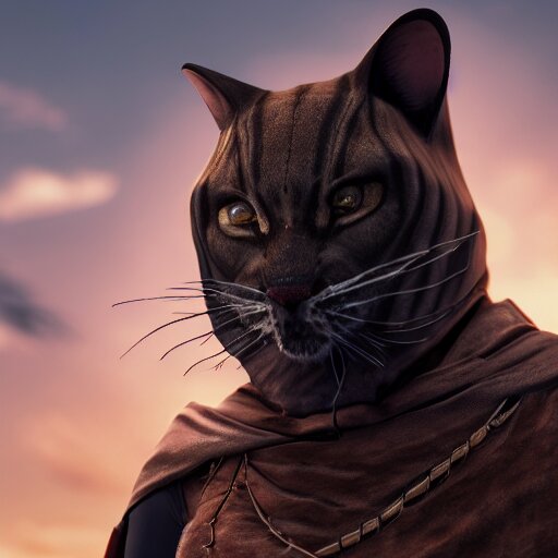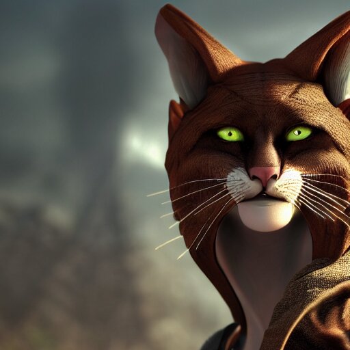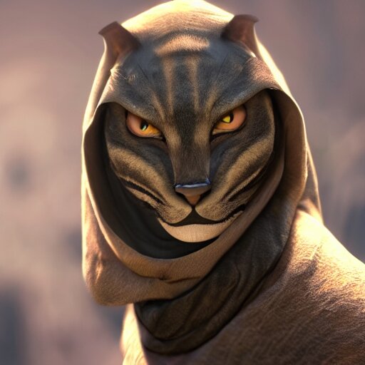 A brown khajiit with white mouth and ears wearing black assassin garb, high resolution film still, 8k, hdr colors