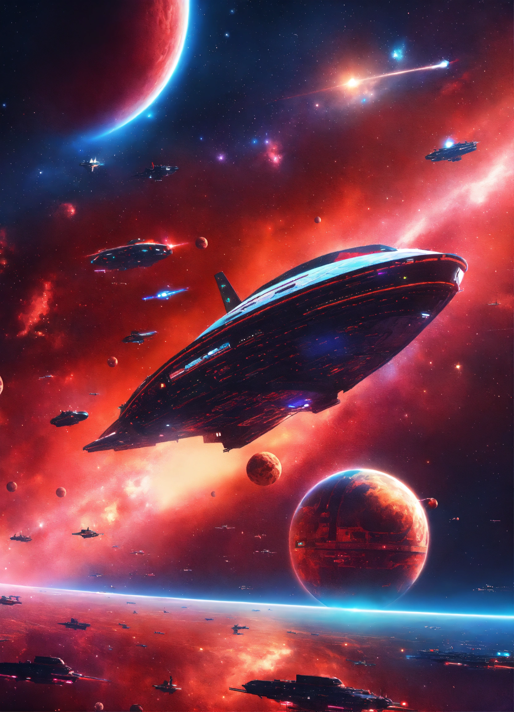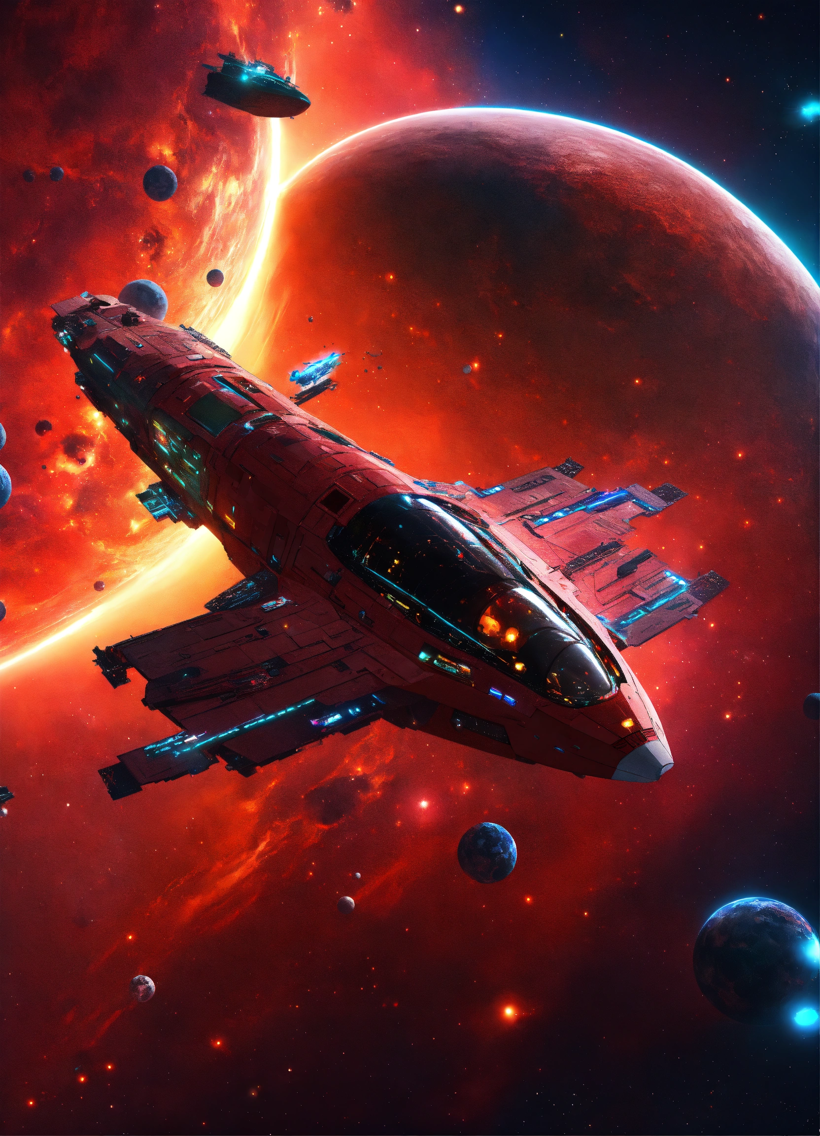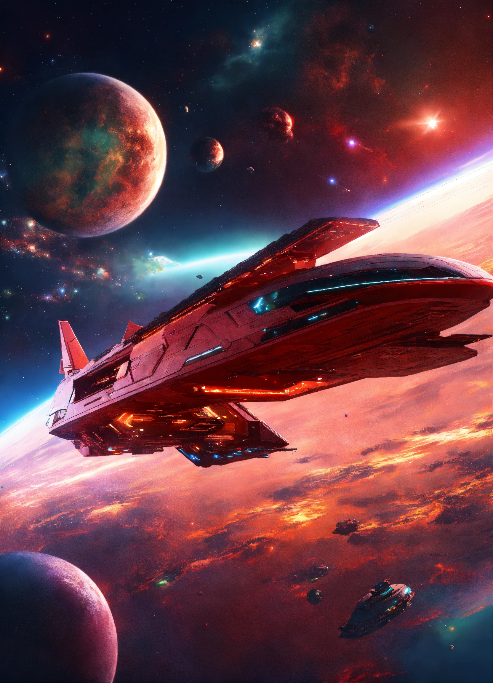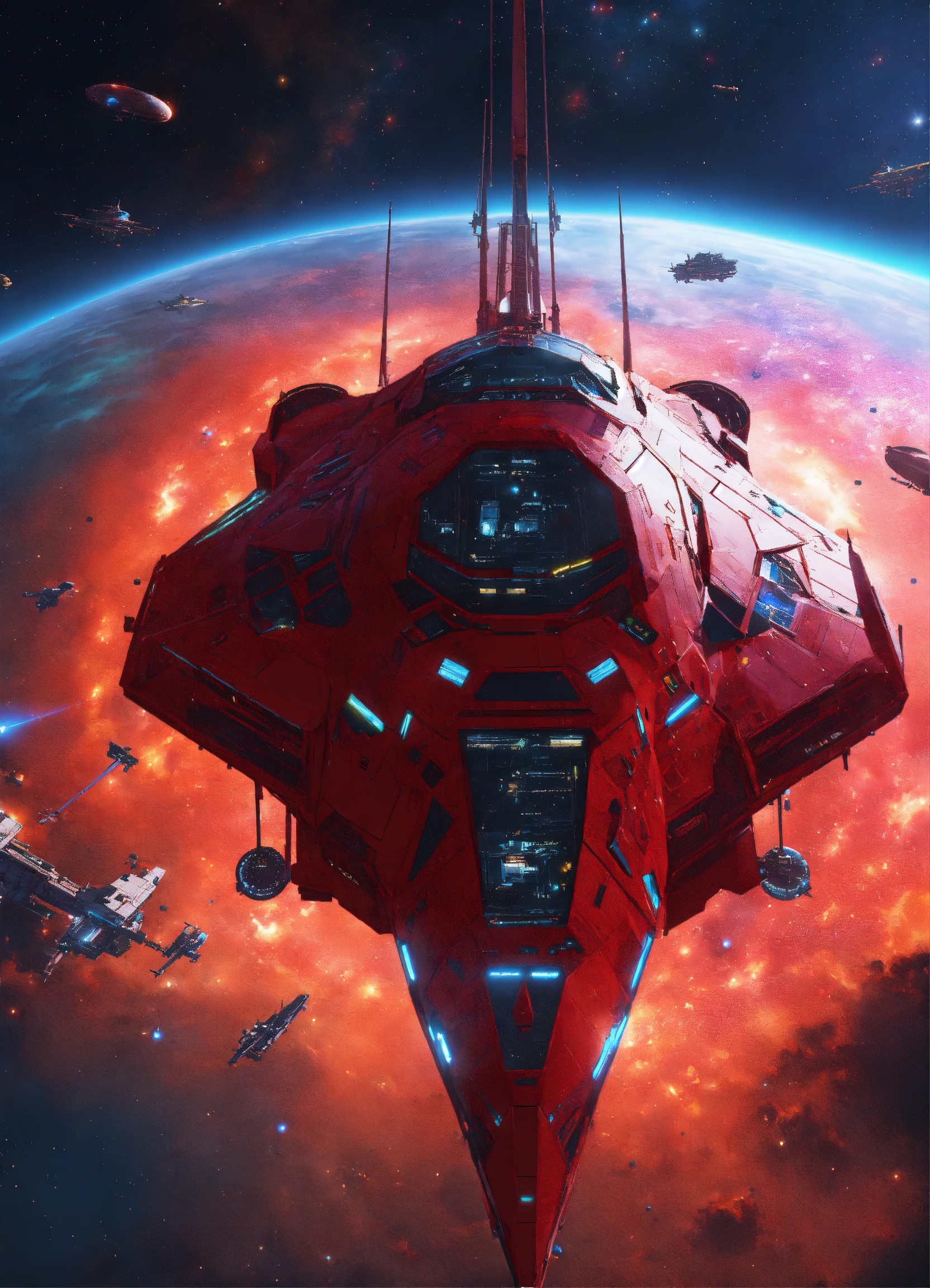 Star docks floating in space with many cool space yachts docked there, 8k, sporty red space yacht flying through a colorful star nebula, 9k, futuristic, realistic, sci-fi