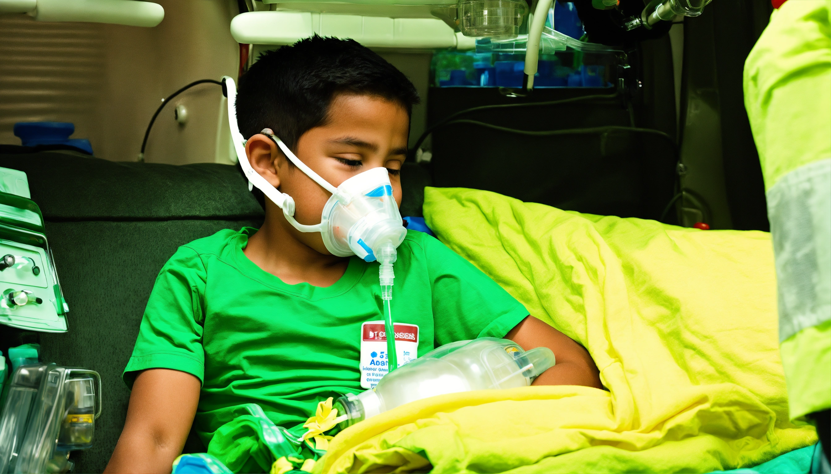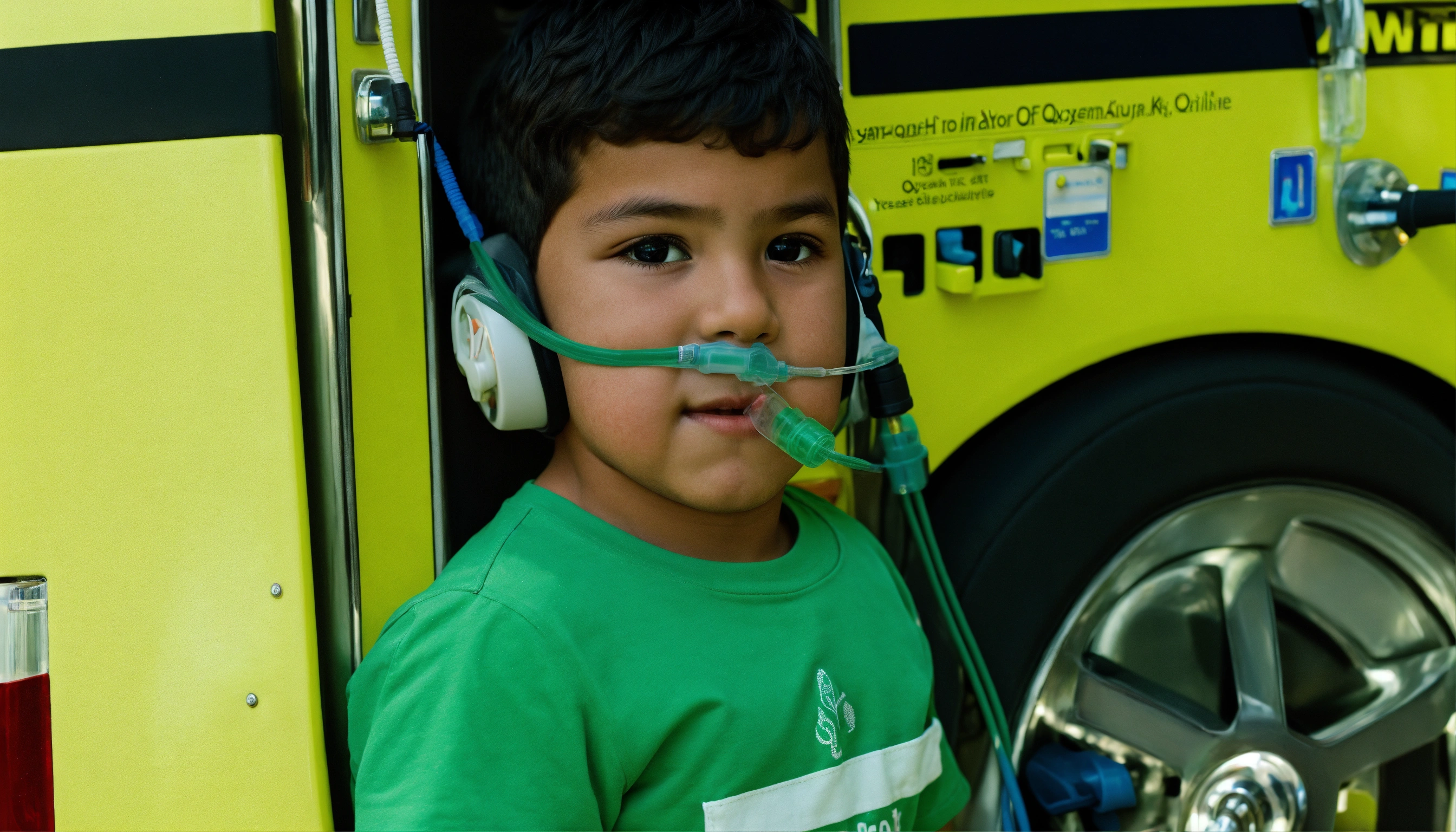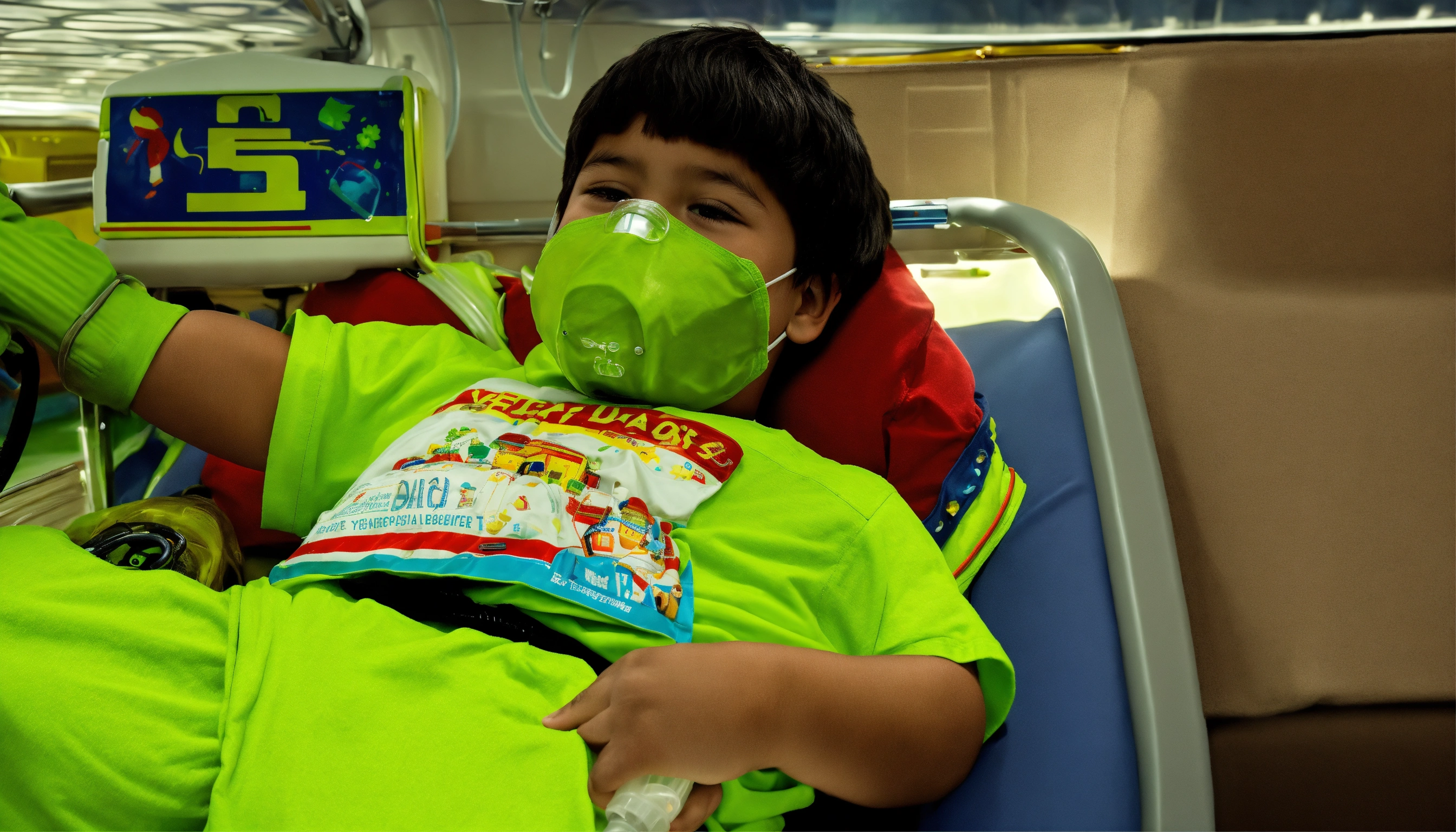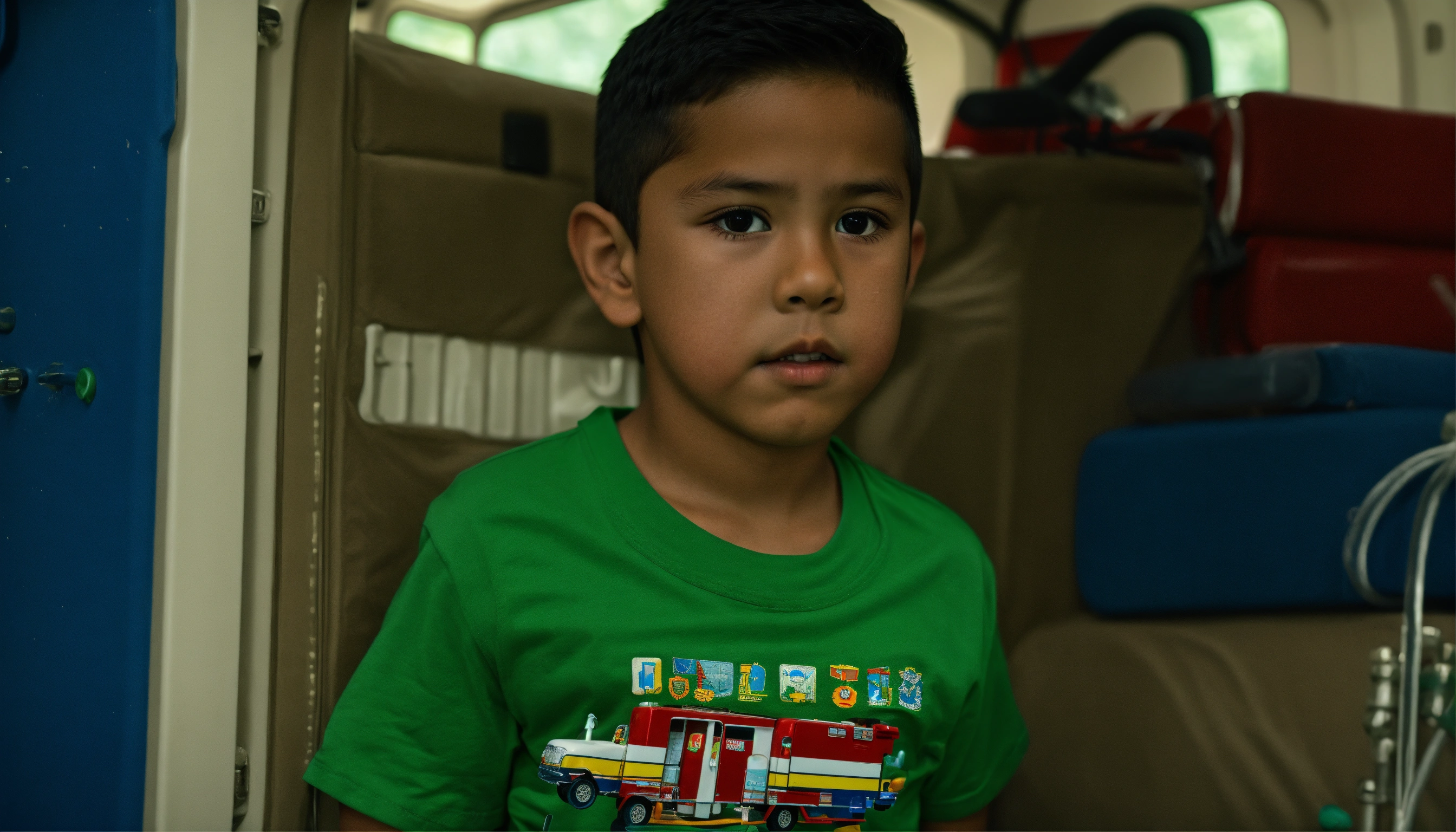 5 year old hispanic boy in a green tee shirt inside of an ambulance with an oxygen mask on