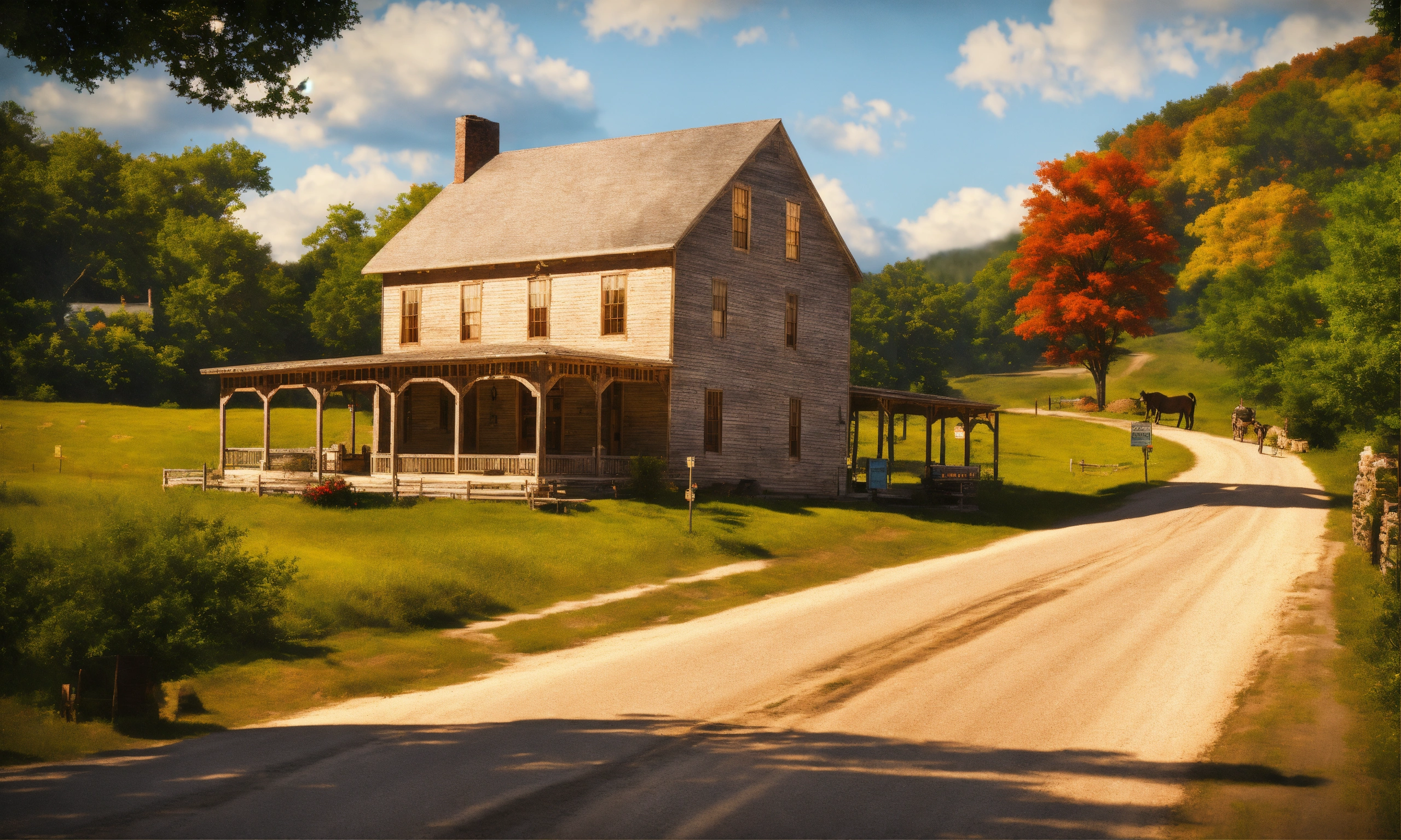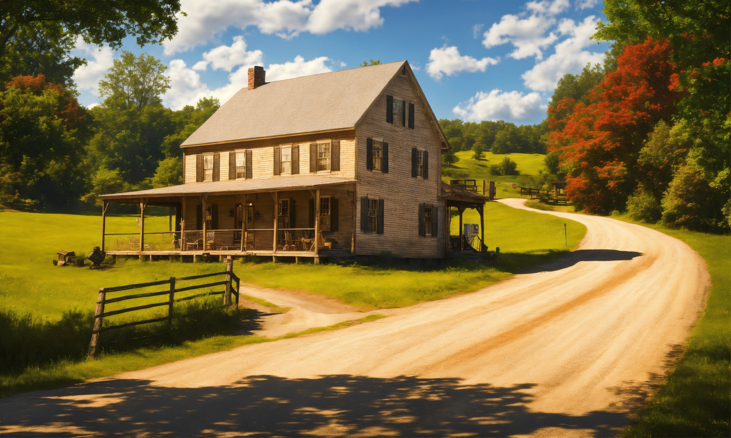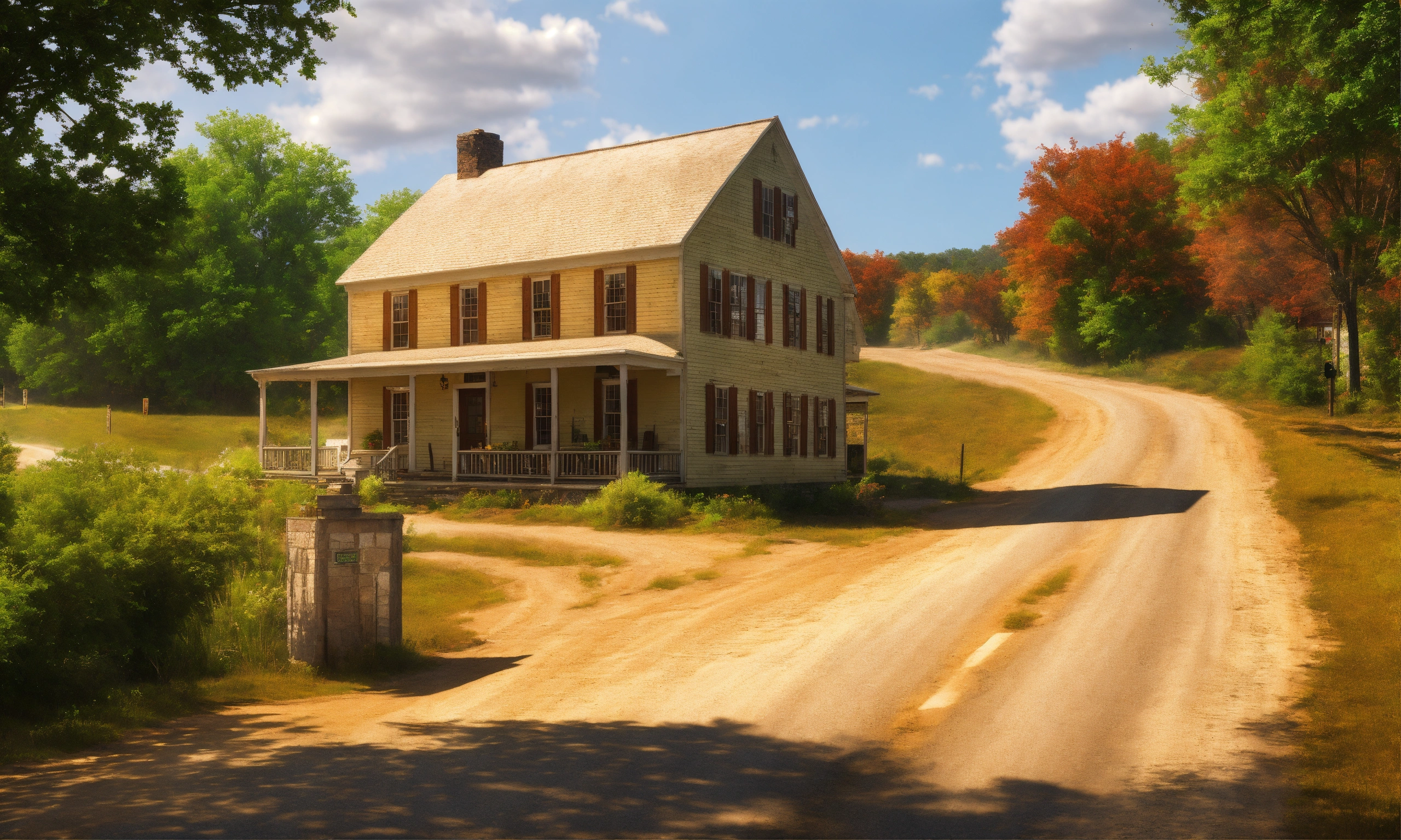 Picture a 1800 colonial inn at the end of a road, mid day with a dirt road leading up to it, photorealistic, magazine-quality