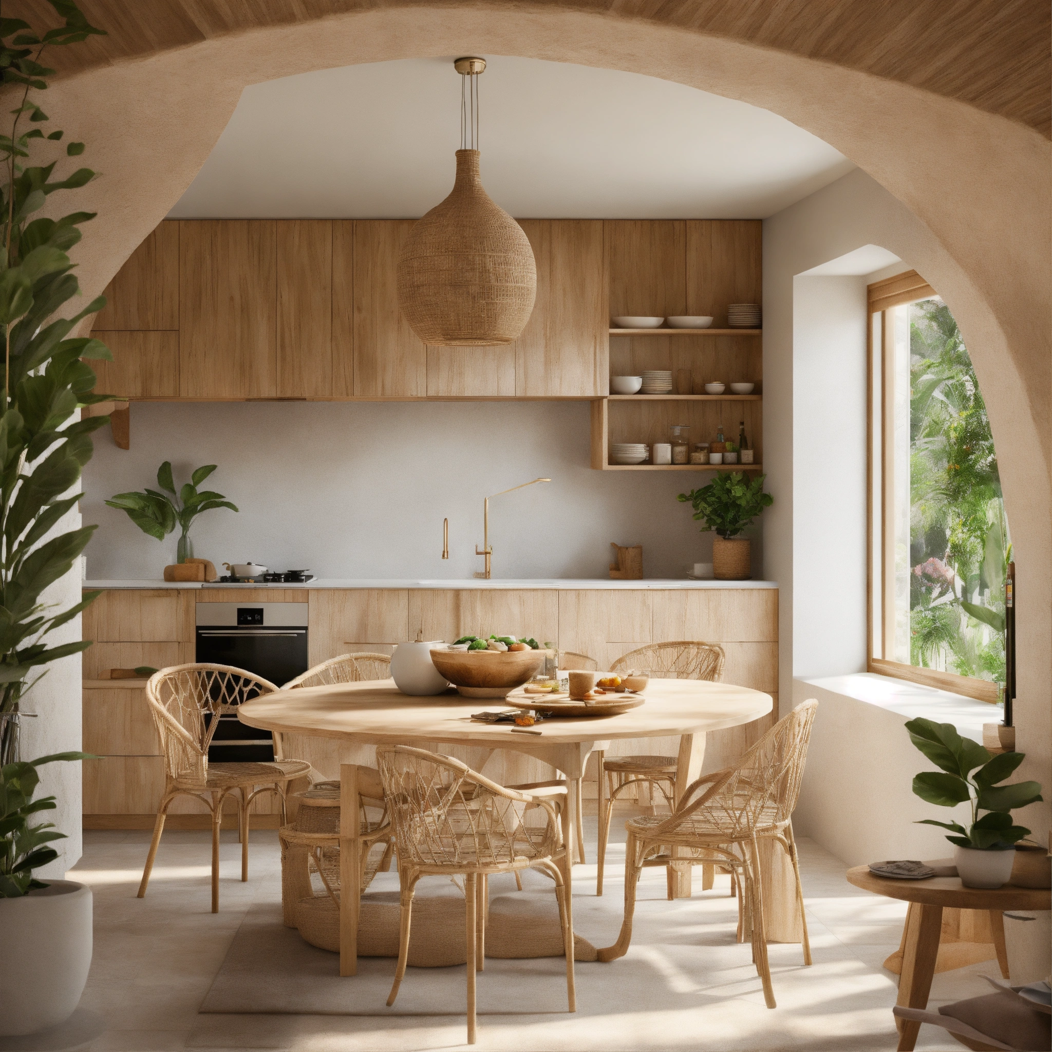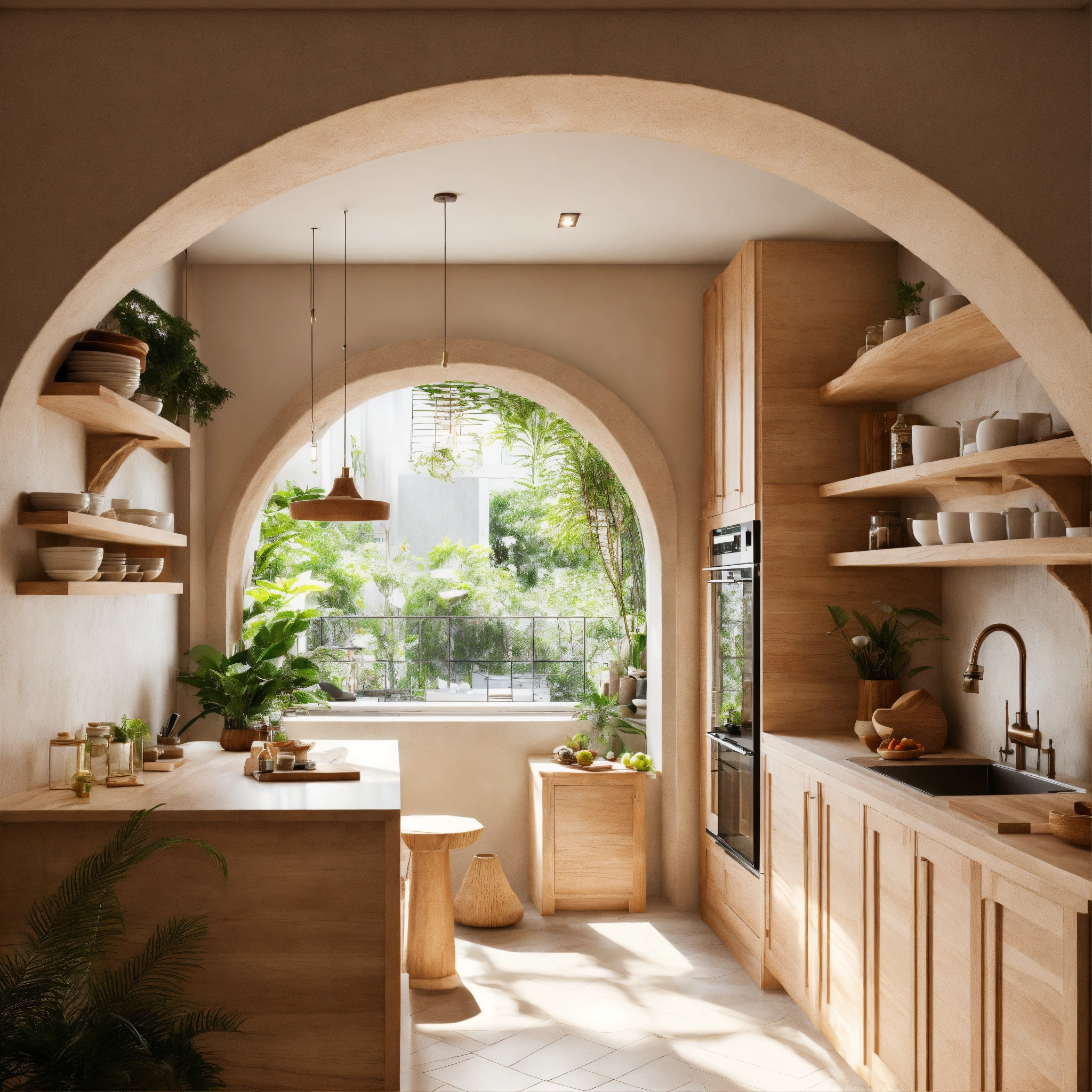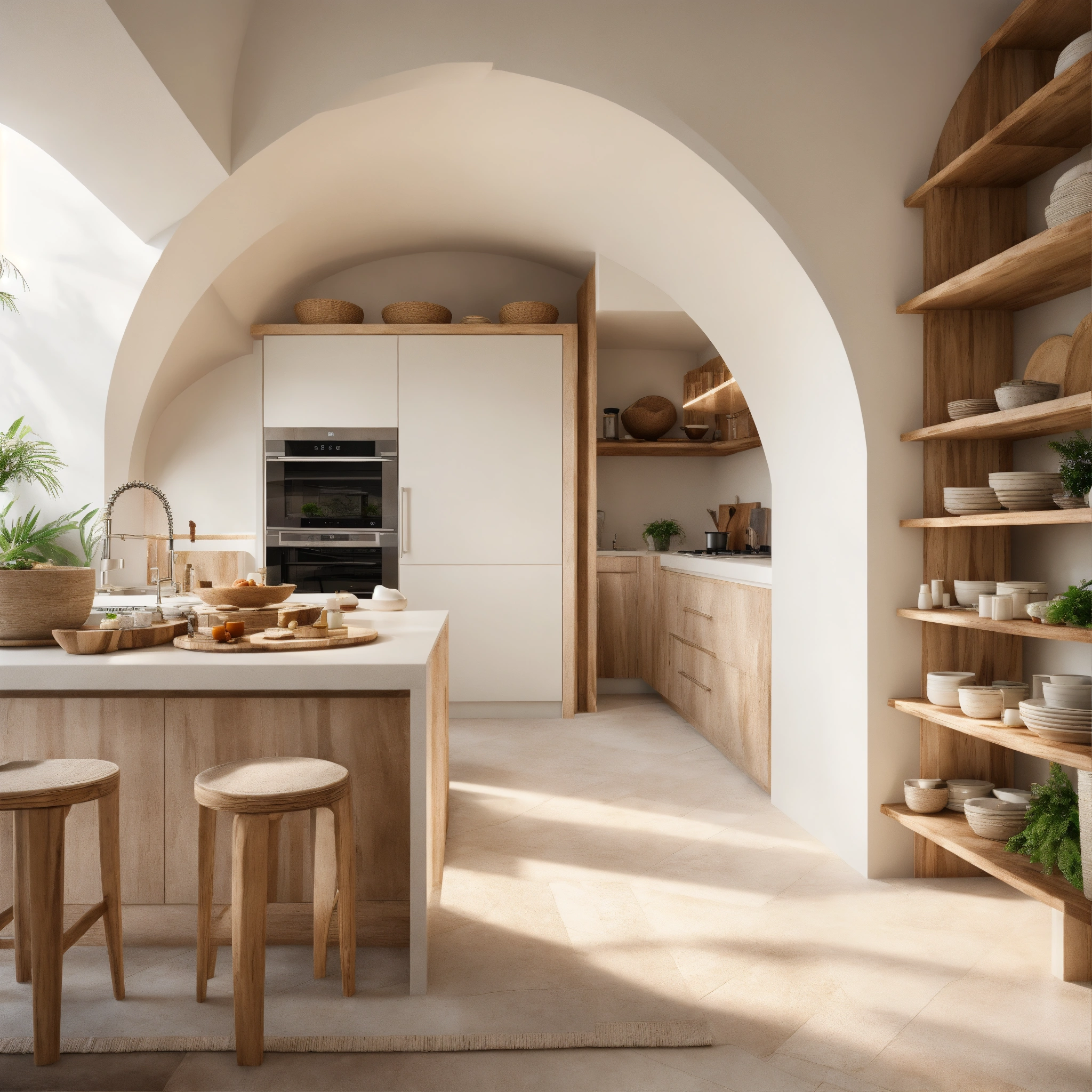 Ultra realistic photo of modern take on bali inspired low ceiling small apartment white cream stone, light wood round arches interor view of kitchen with shelving