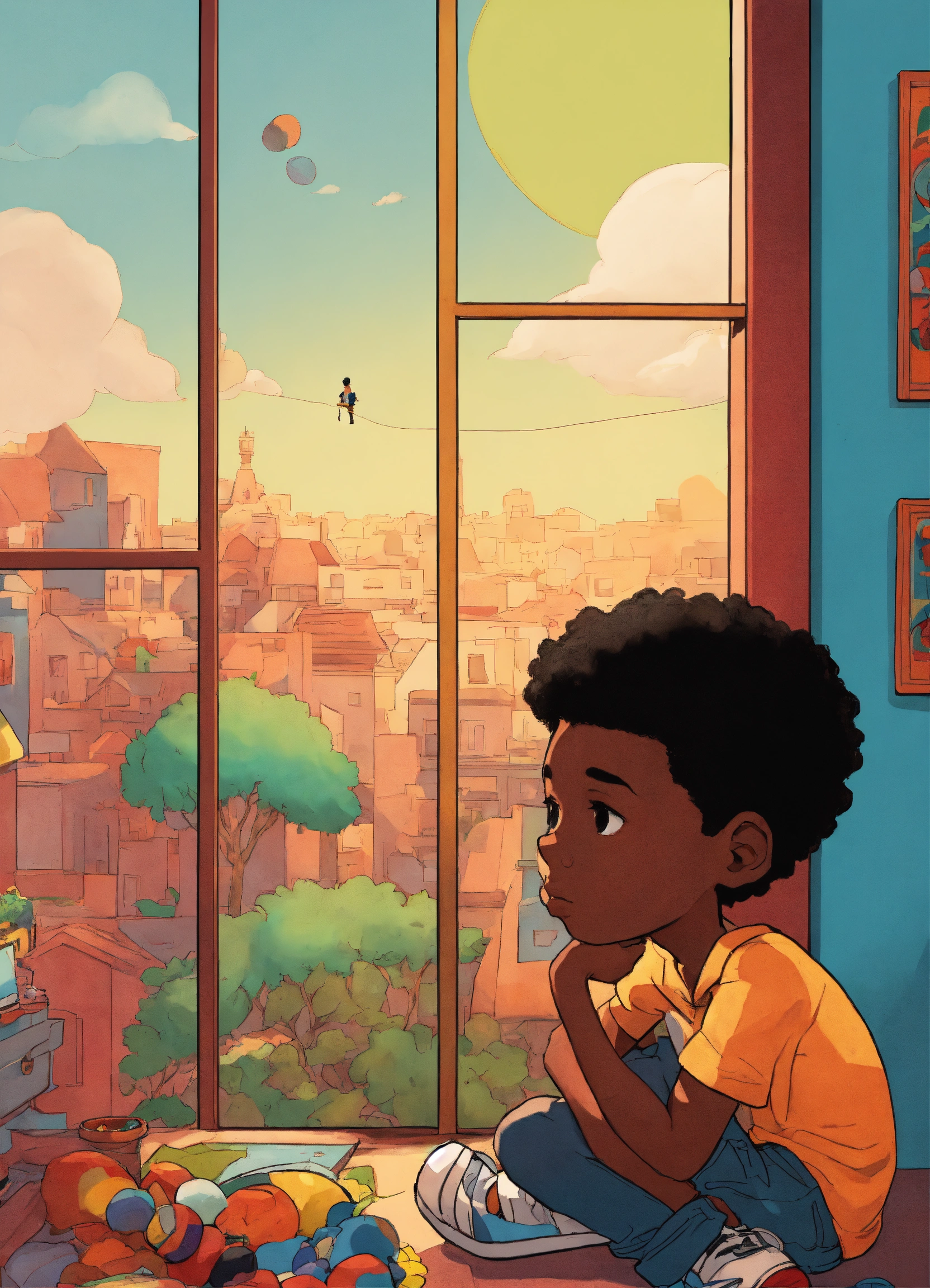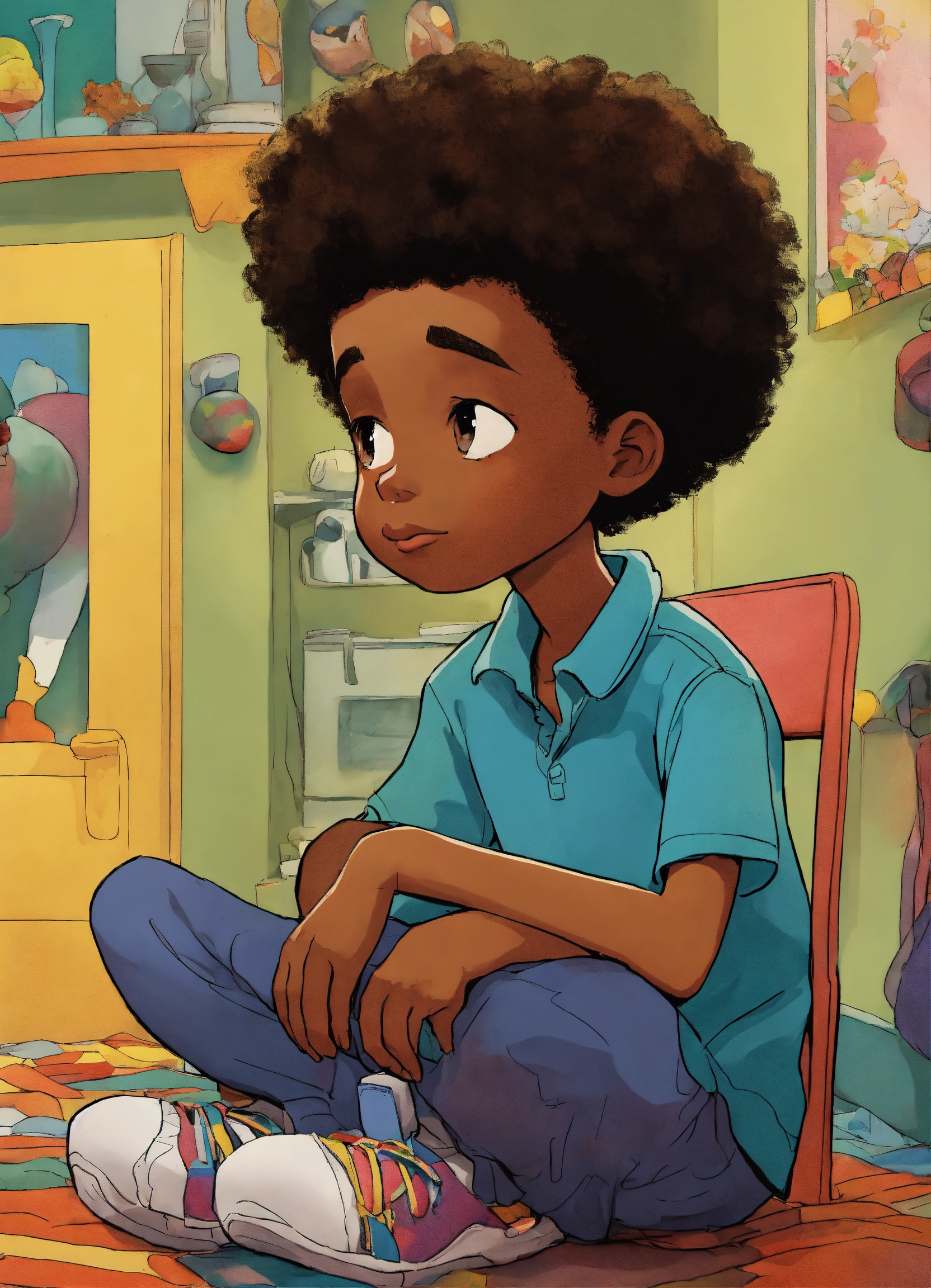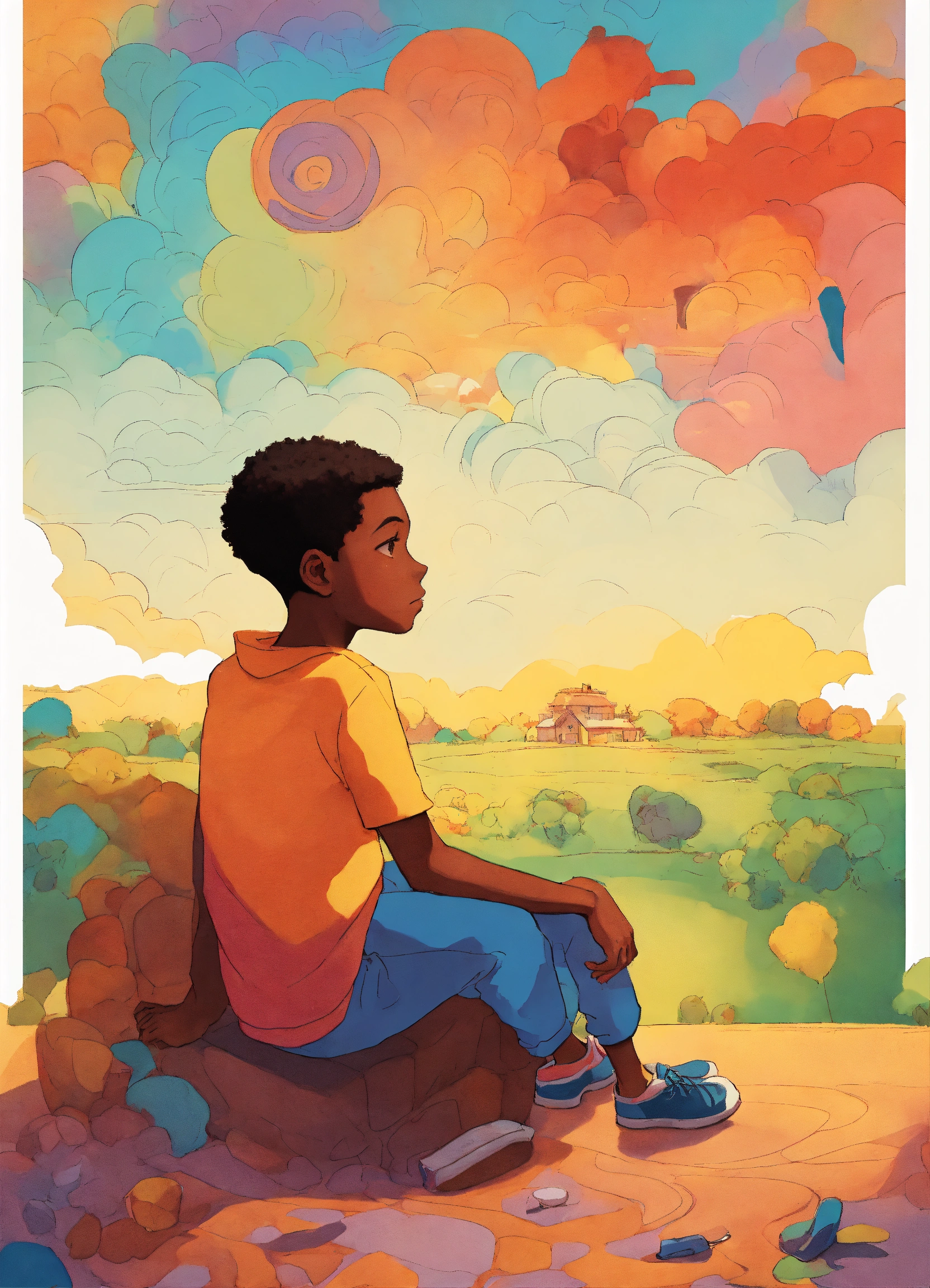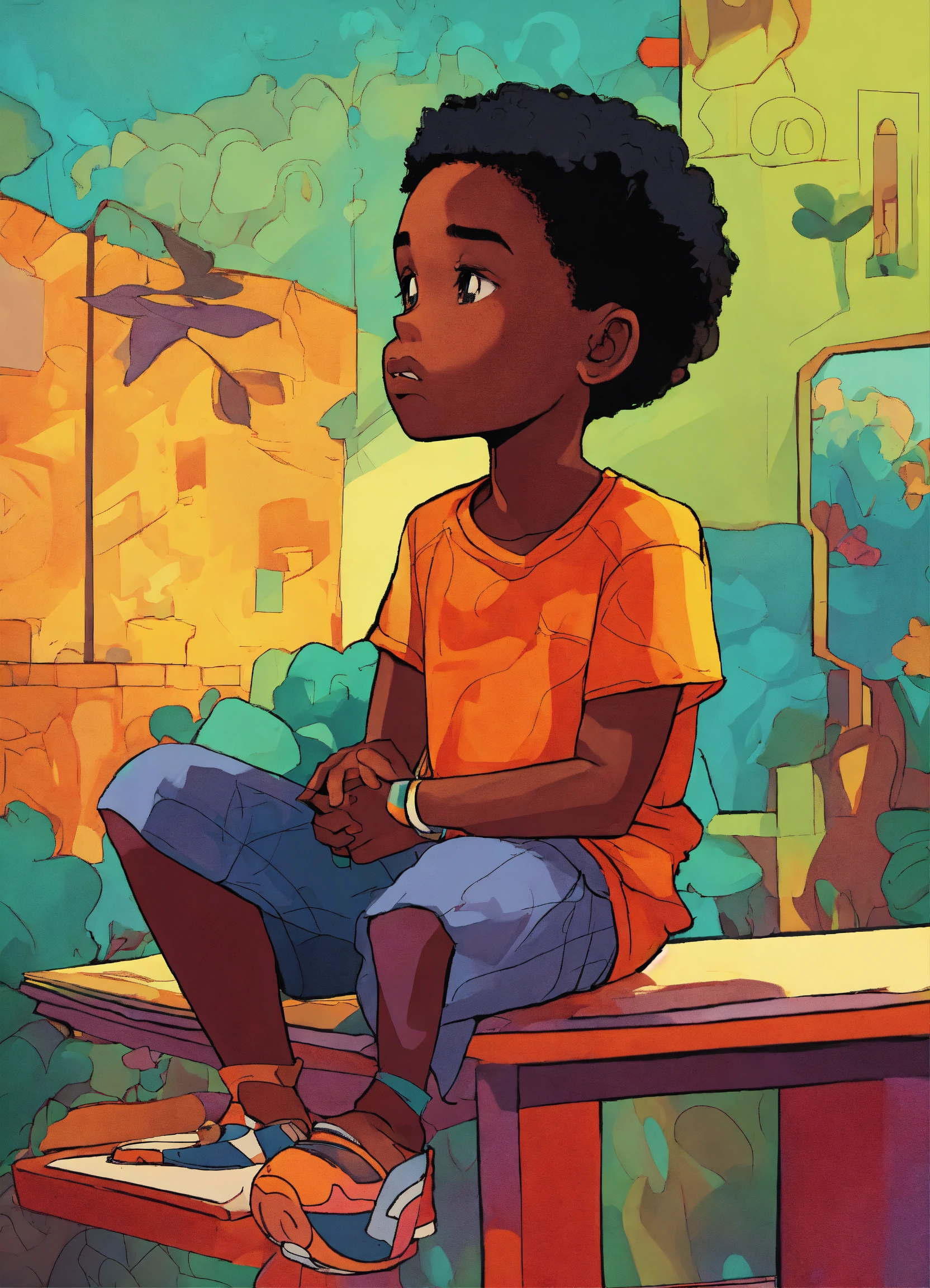 Colorful, cartoon, illustrate a black boy in deep thought, show the world around him in various colors and shapes to emphasize his unique perspective. his special mom can be seen in the background, watching over him