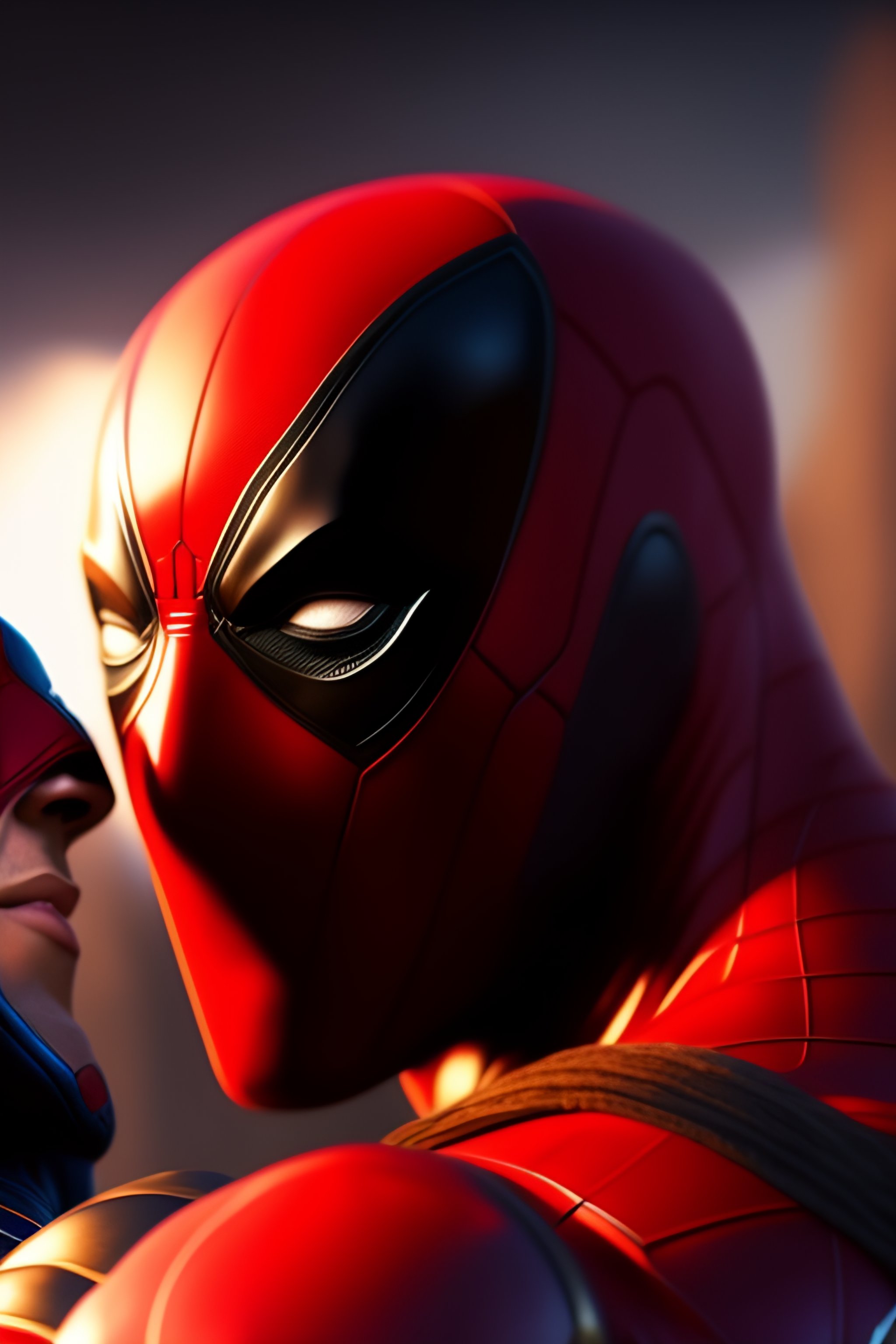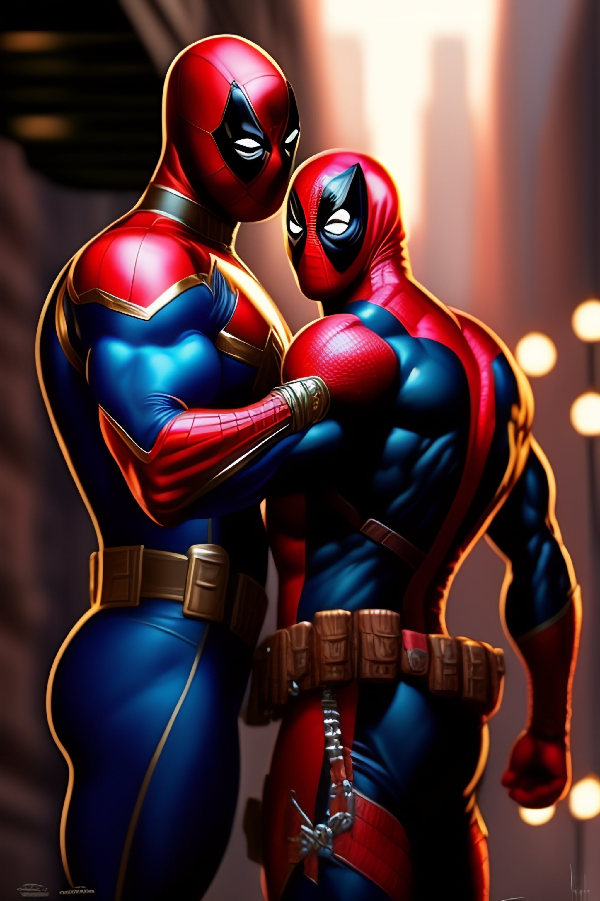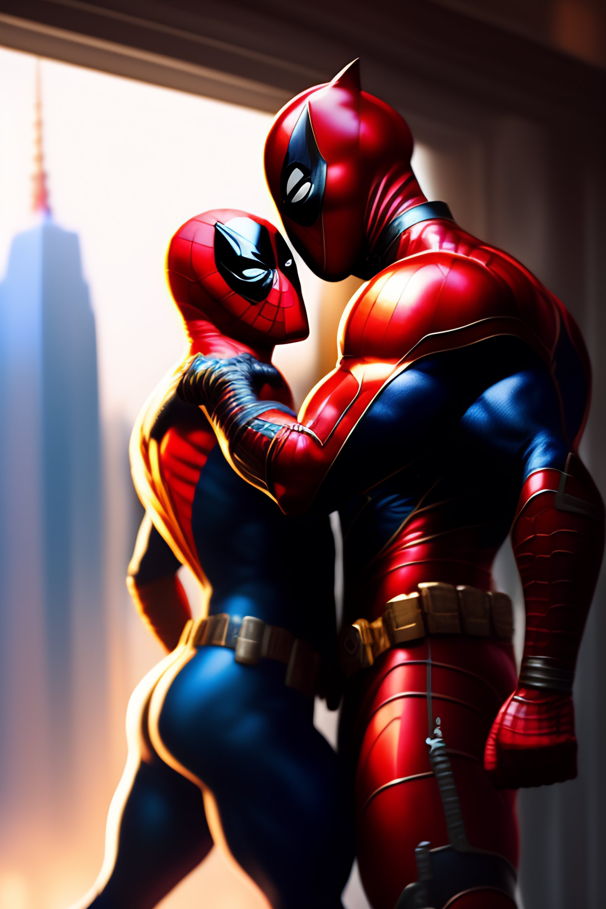 Thin muscular spiderman kissing deadpool, lighting, cinematic, establishing shot, extremely high detail, photo realistic, lighting, post processed, concept art, artstation, matte painting, style by eddie mendoza, raphael lacoste, alex ross