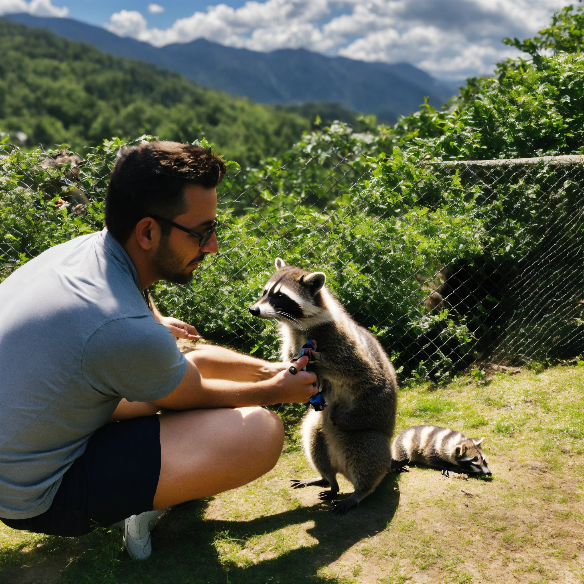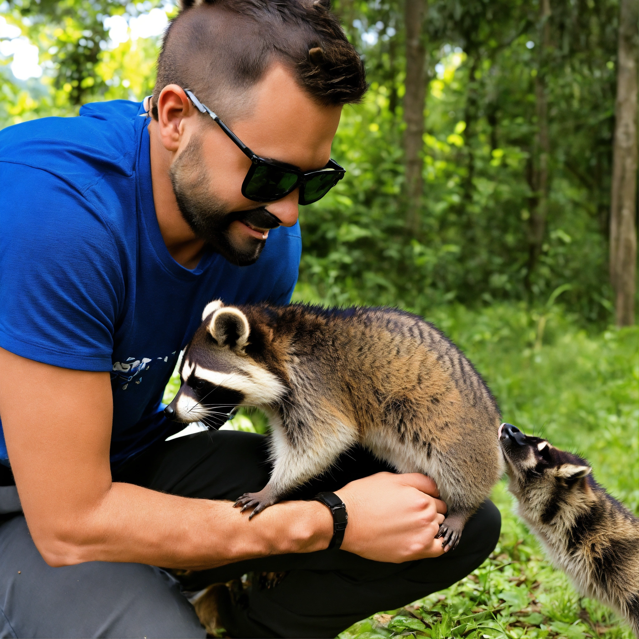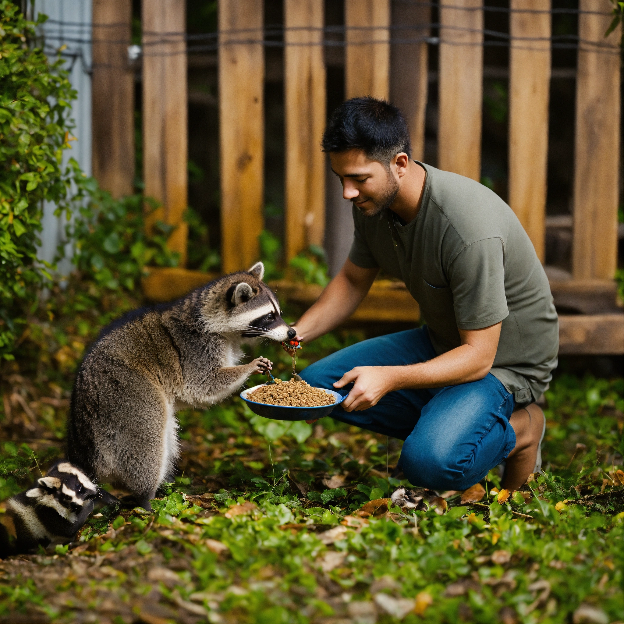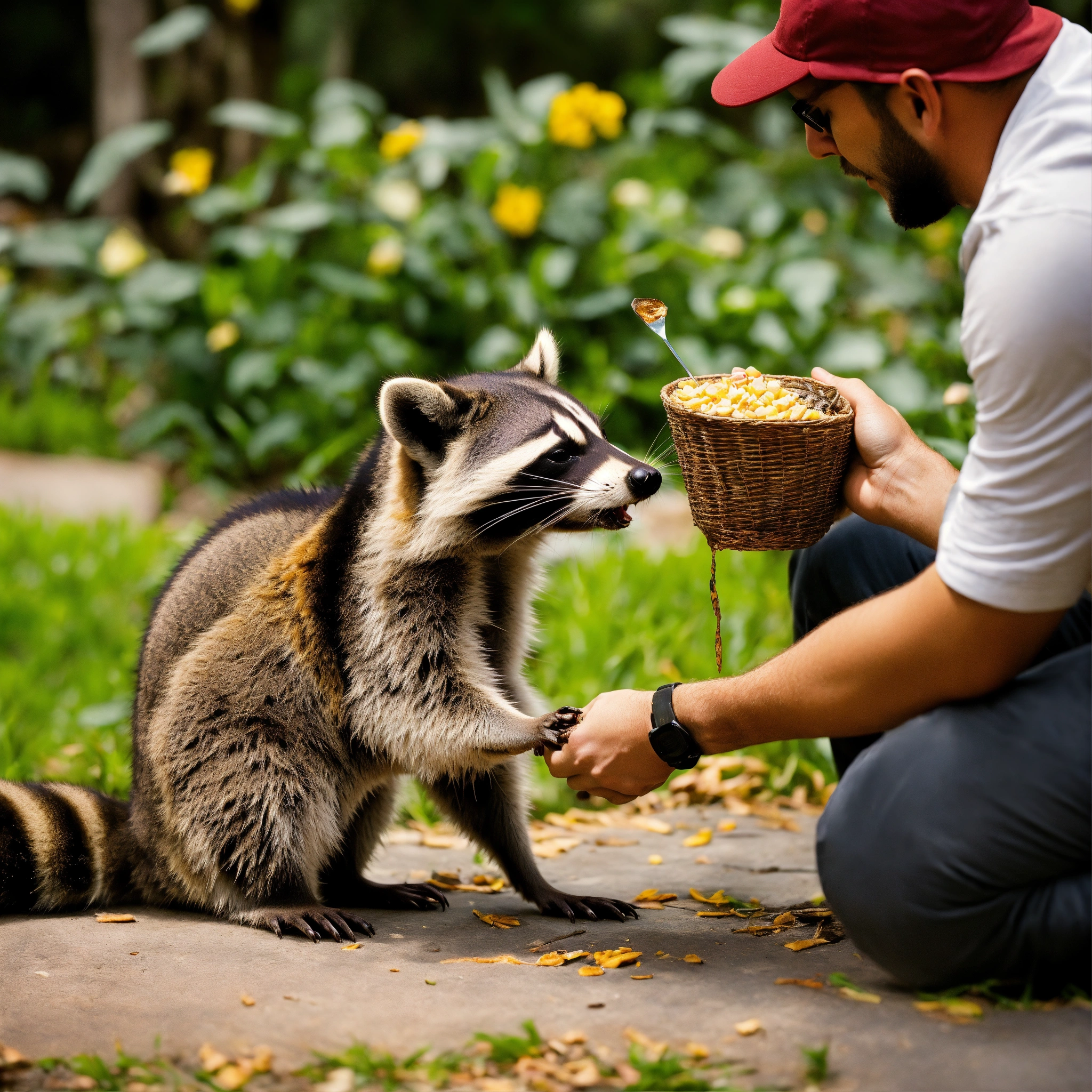 A man feeding a raccoon while petting for it