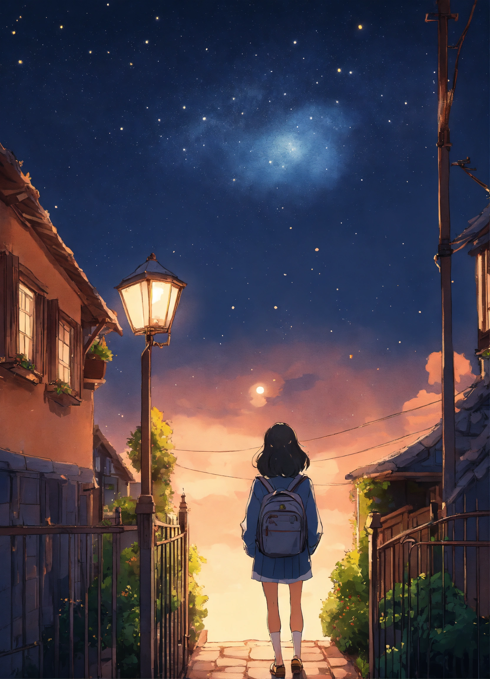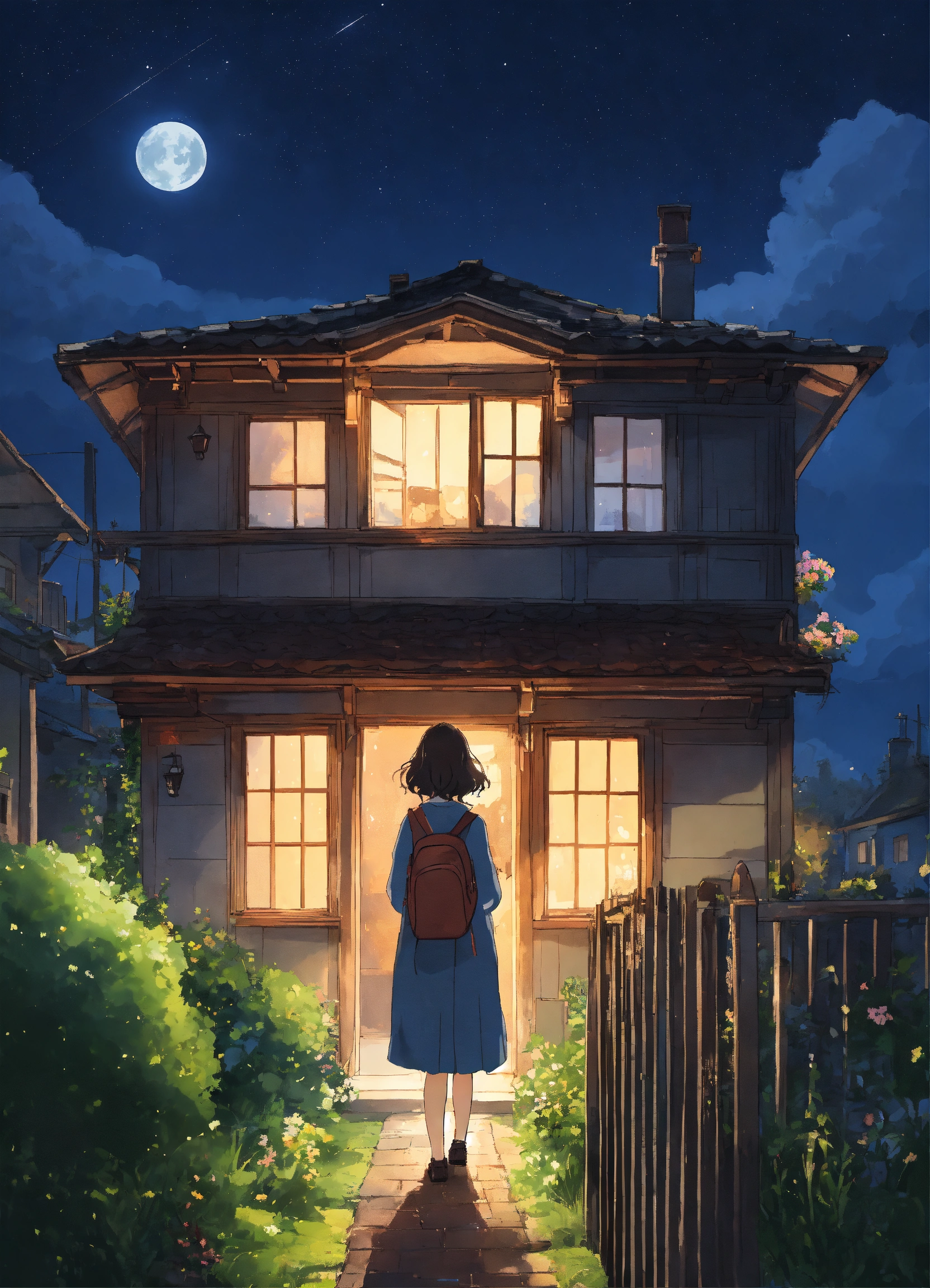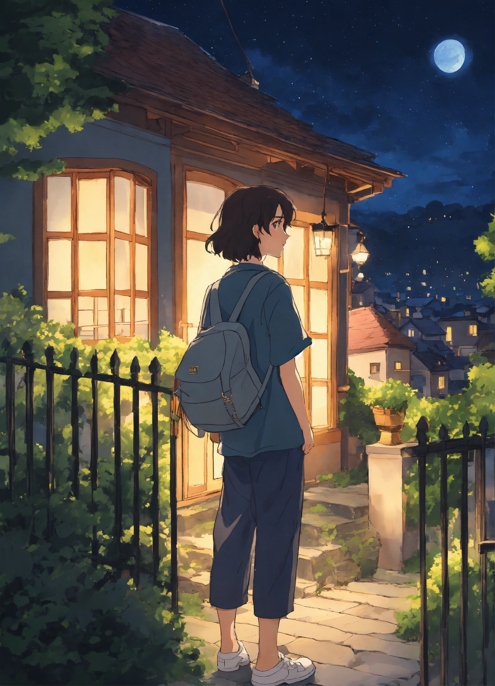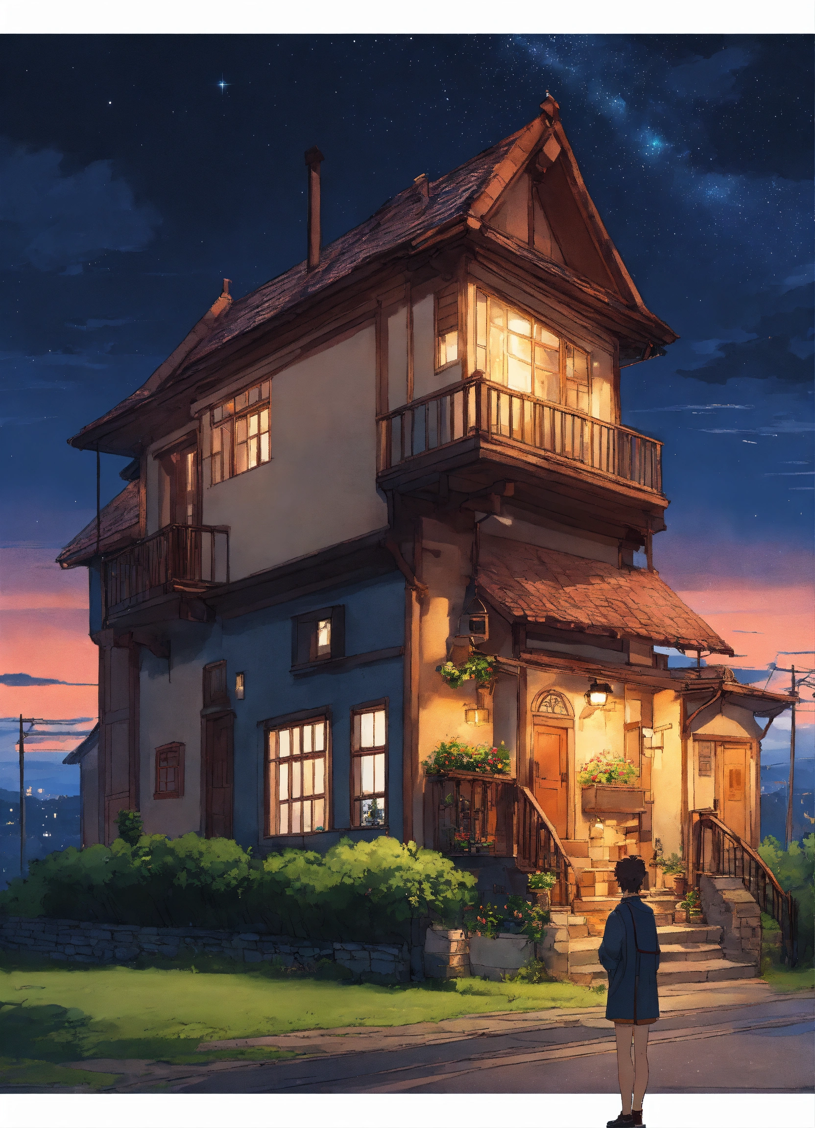 1 man, 20 years old, permed hair, good looking, good style, background is a small house in europe, one house, night, starry sky, woman looking at the building, studio ghibli style illustration, wide angle