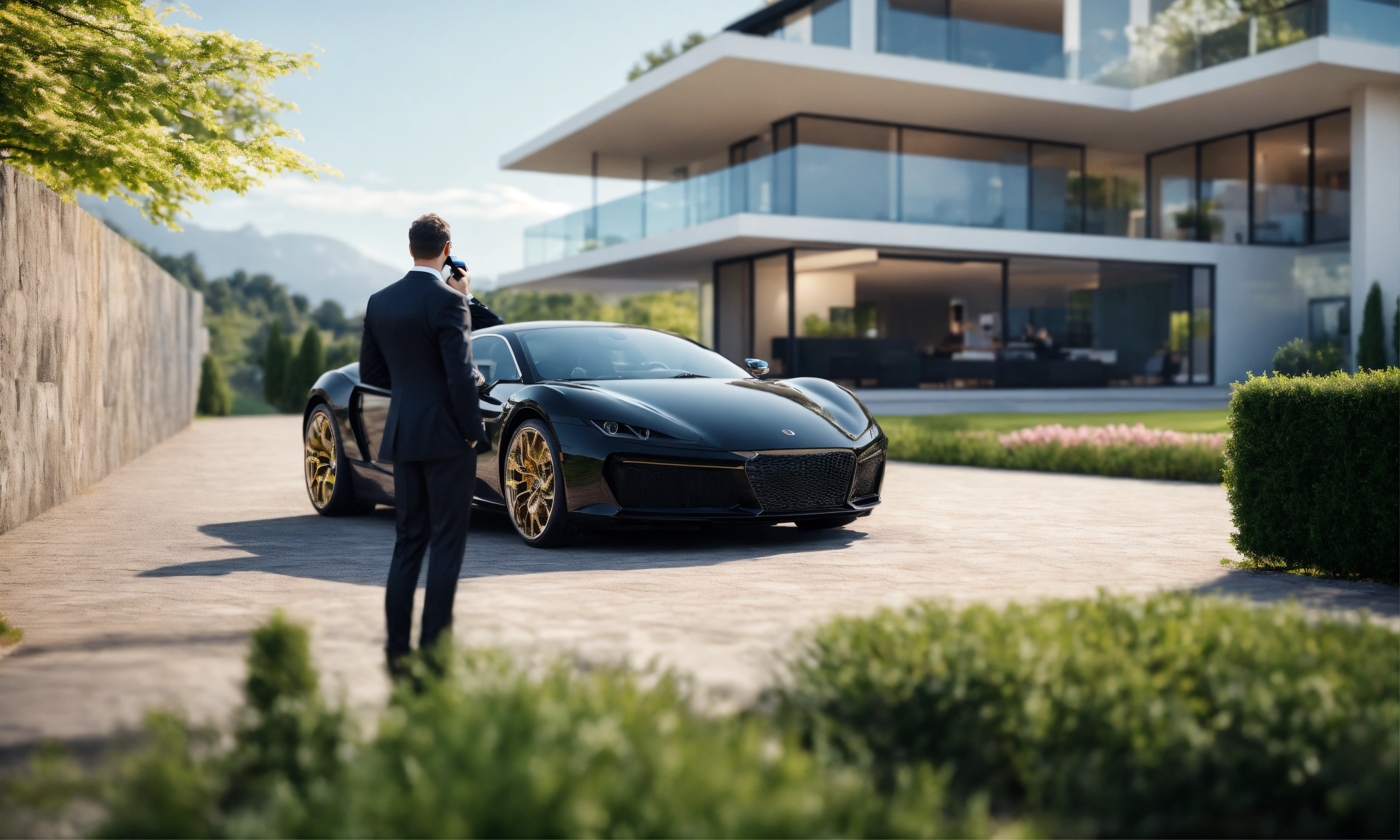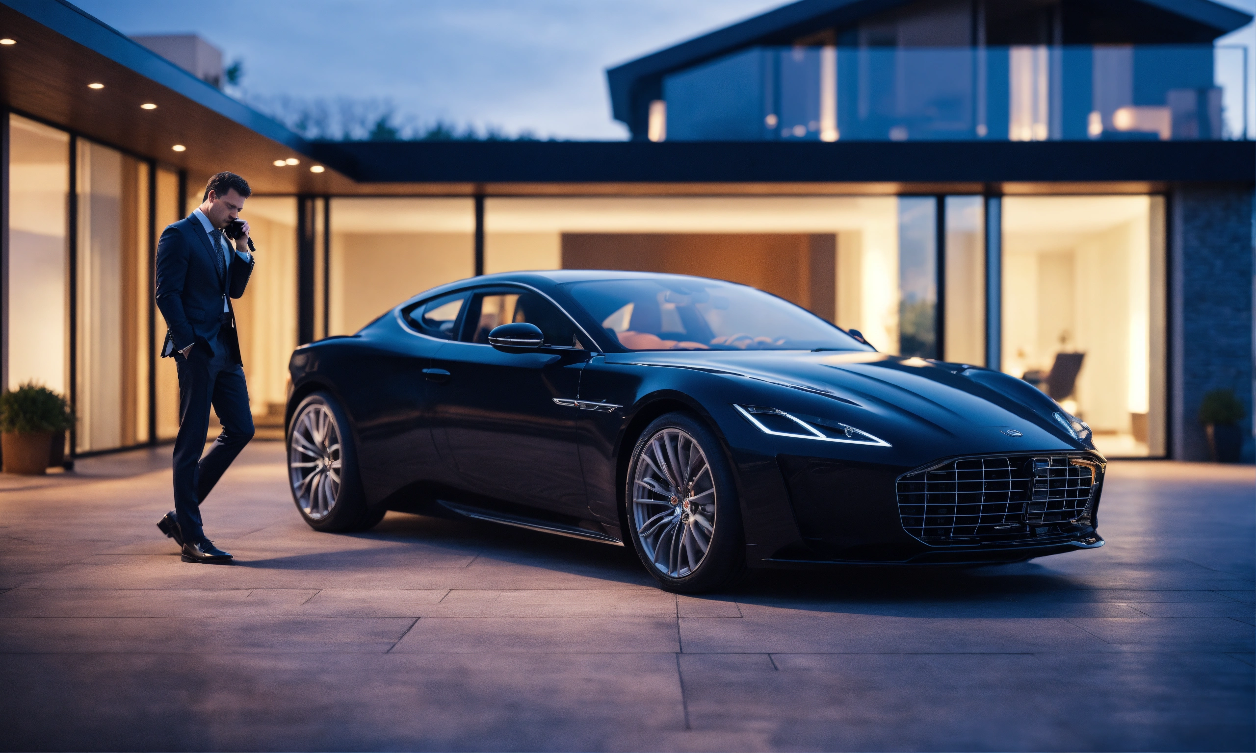 Businessman made a call phone, the other hand in the pants, behind defocus very modern luxus villa, on the side is the black sportcar, 8k realistic, high quality, high resolution
