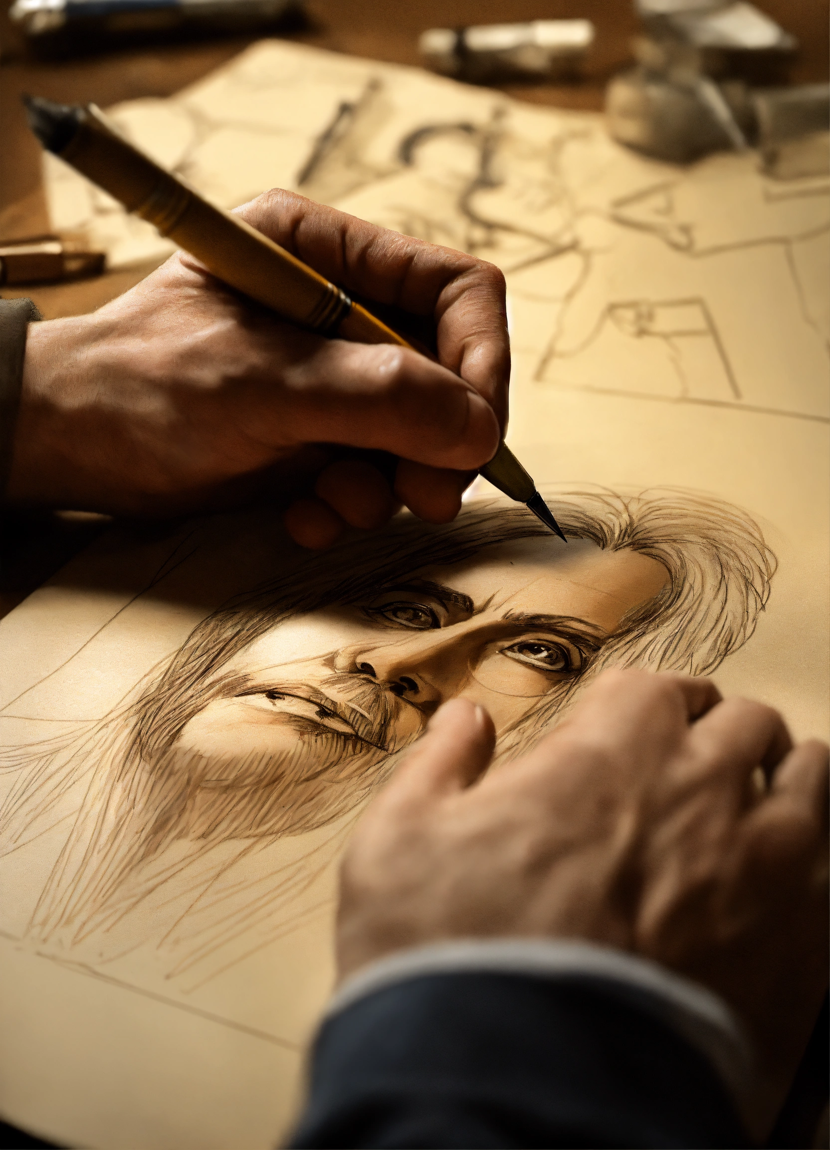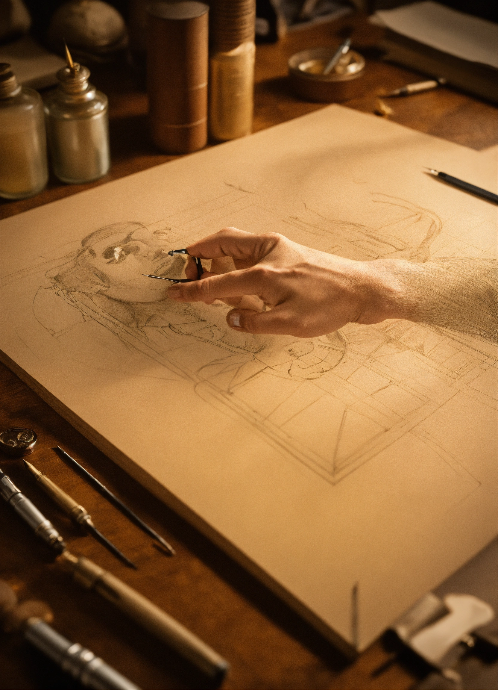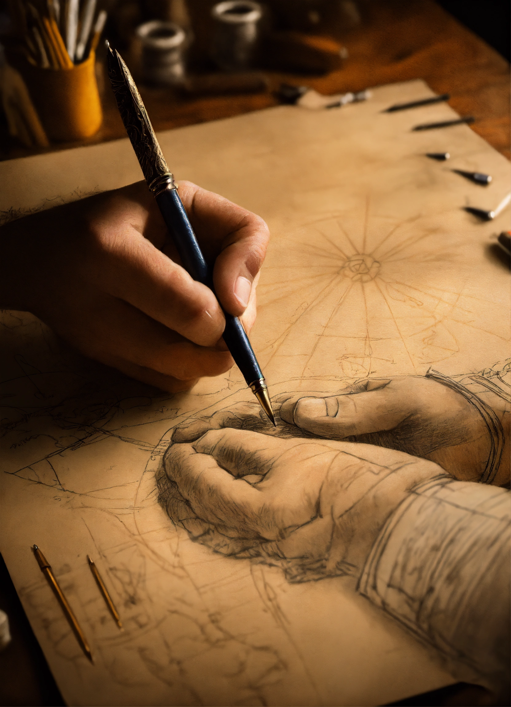 Realistic image with photograph technique, of the hand of a draftsman, with a quill pen in his hand, tracing the sketch of the vetruvian man, in a florentine environment