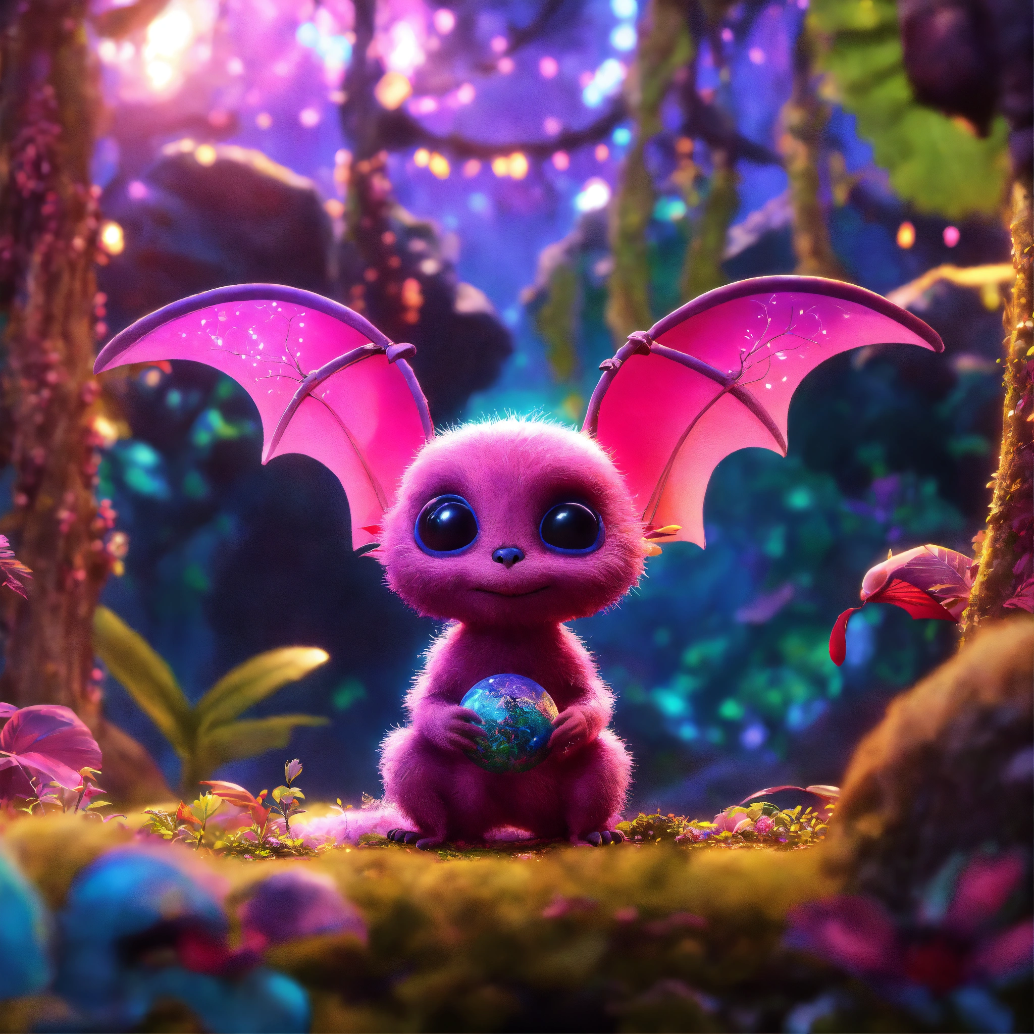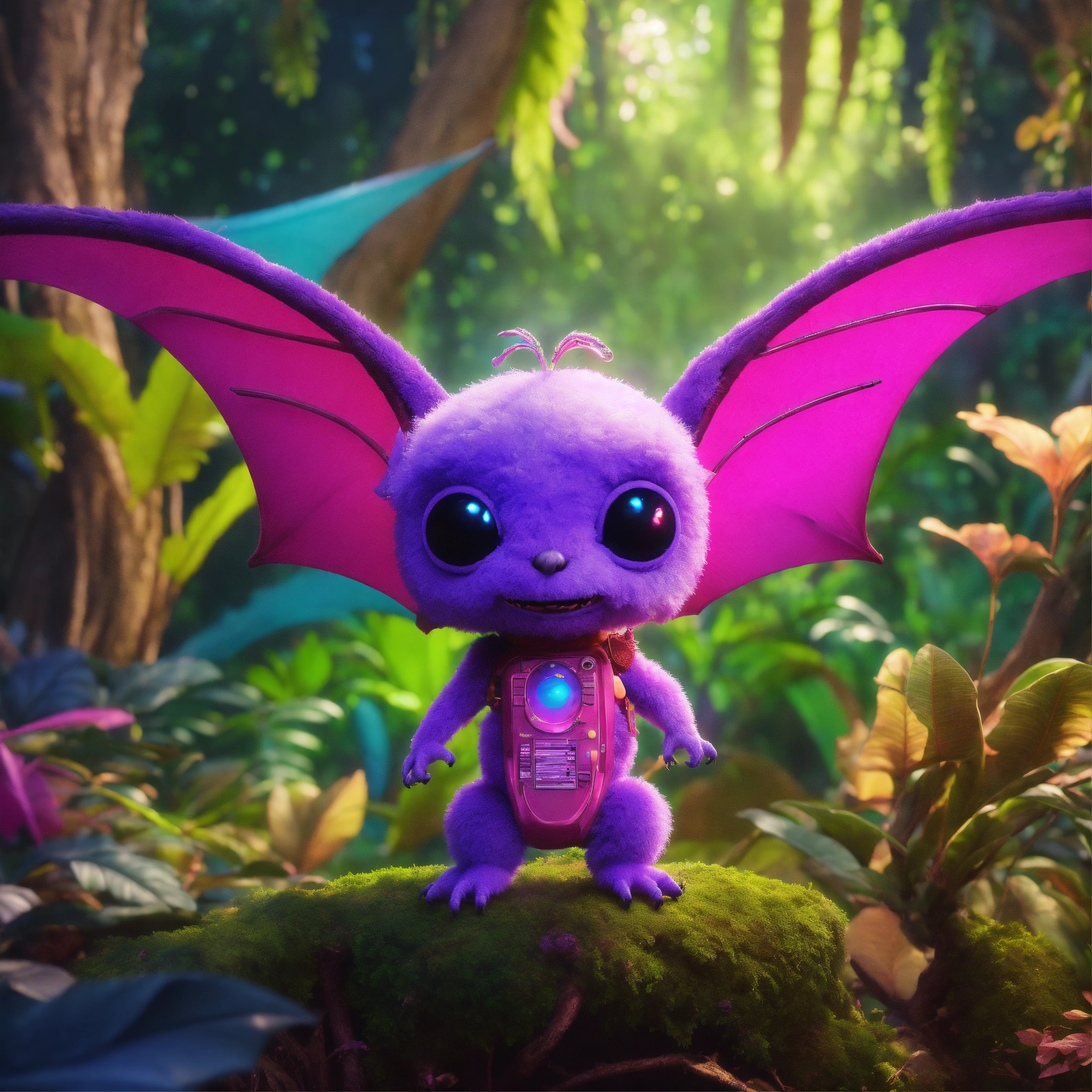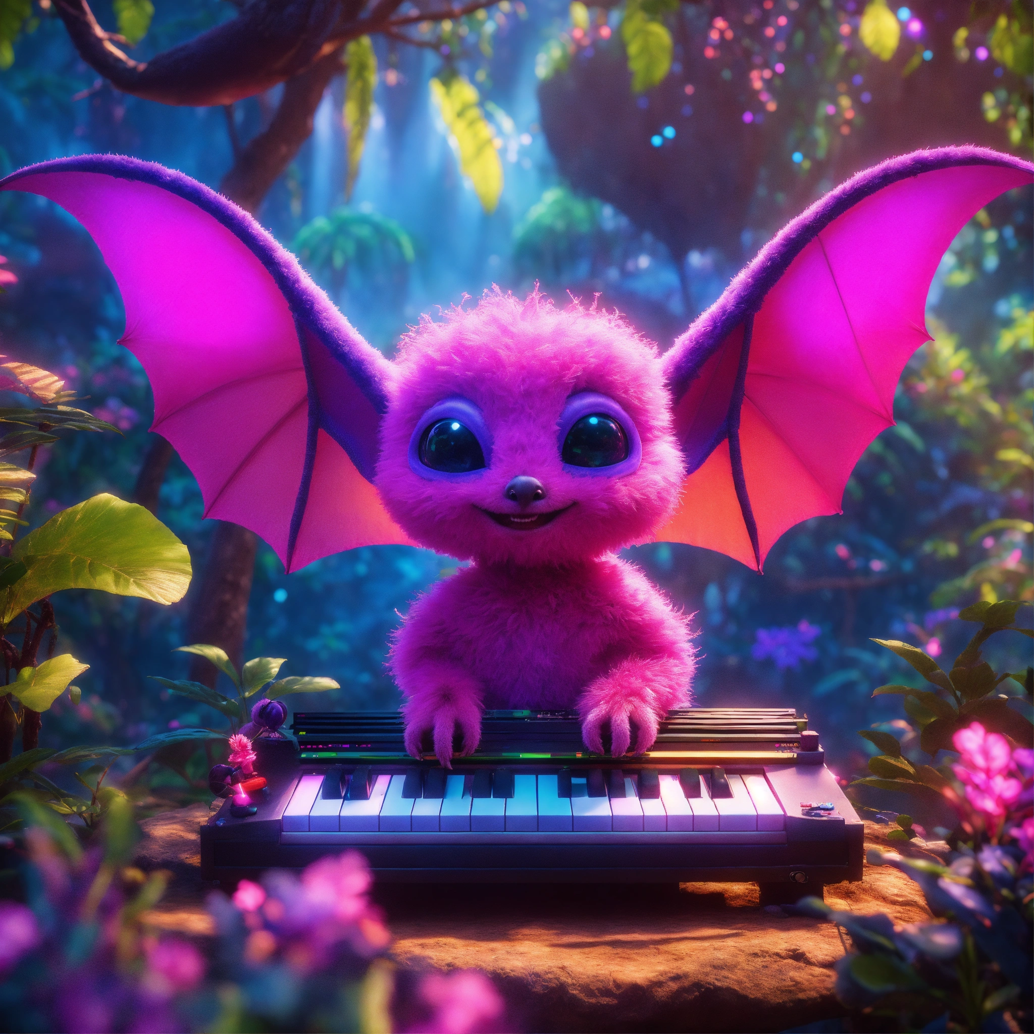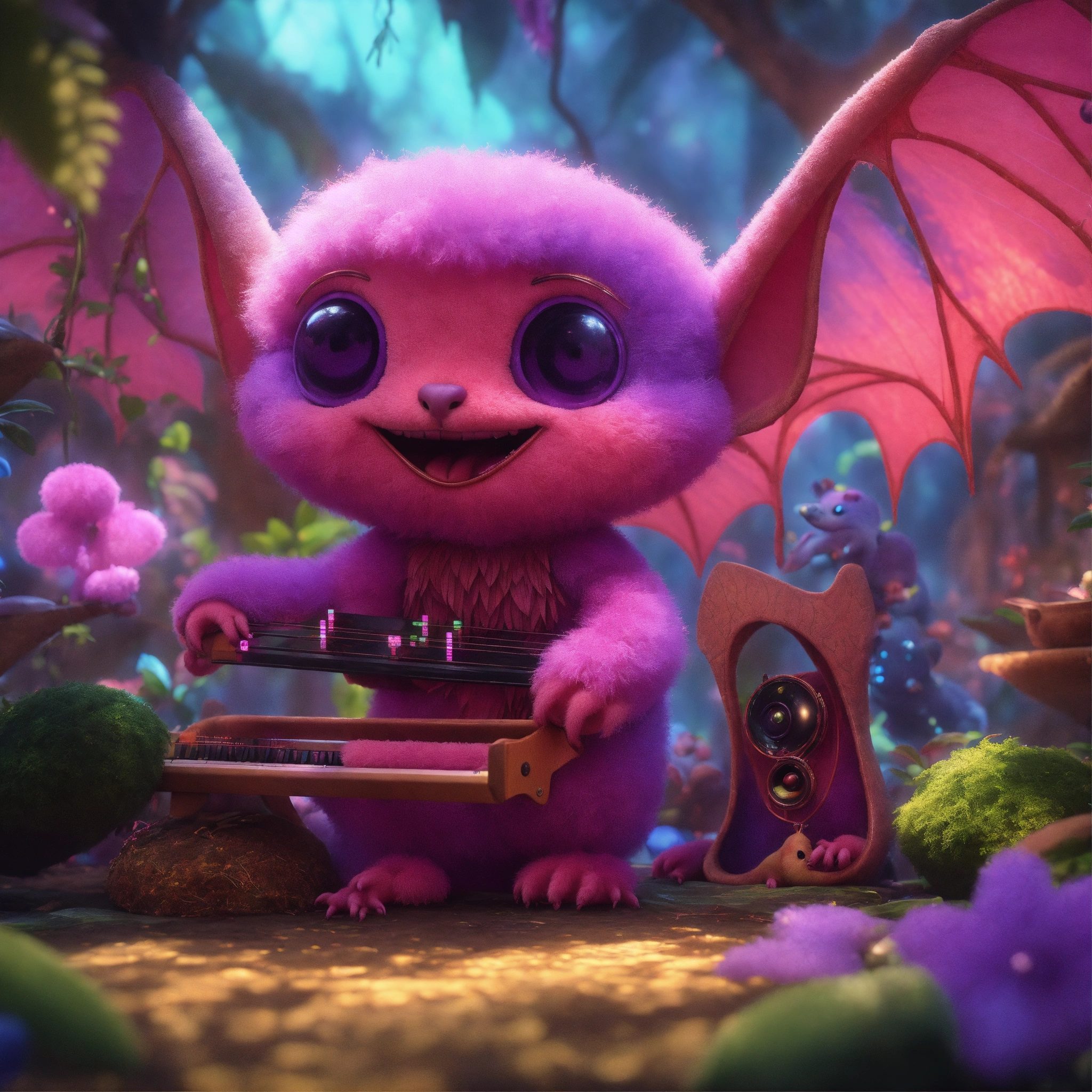 Village of 3 cute fuzzy pink and purple alien fruitbats with big ears, bat wings, in an exotic alien jungle with translucent psychedelic plants and tree huts, playing a toy synthesizer harp, cosmic, musical, disney, pixar, realistic, 8k, unreal engine