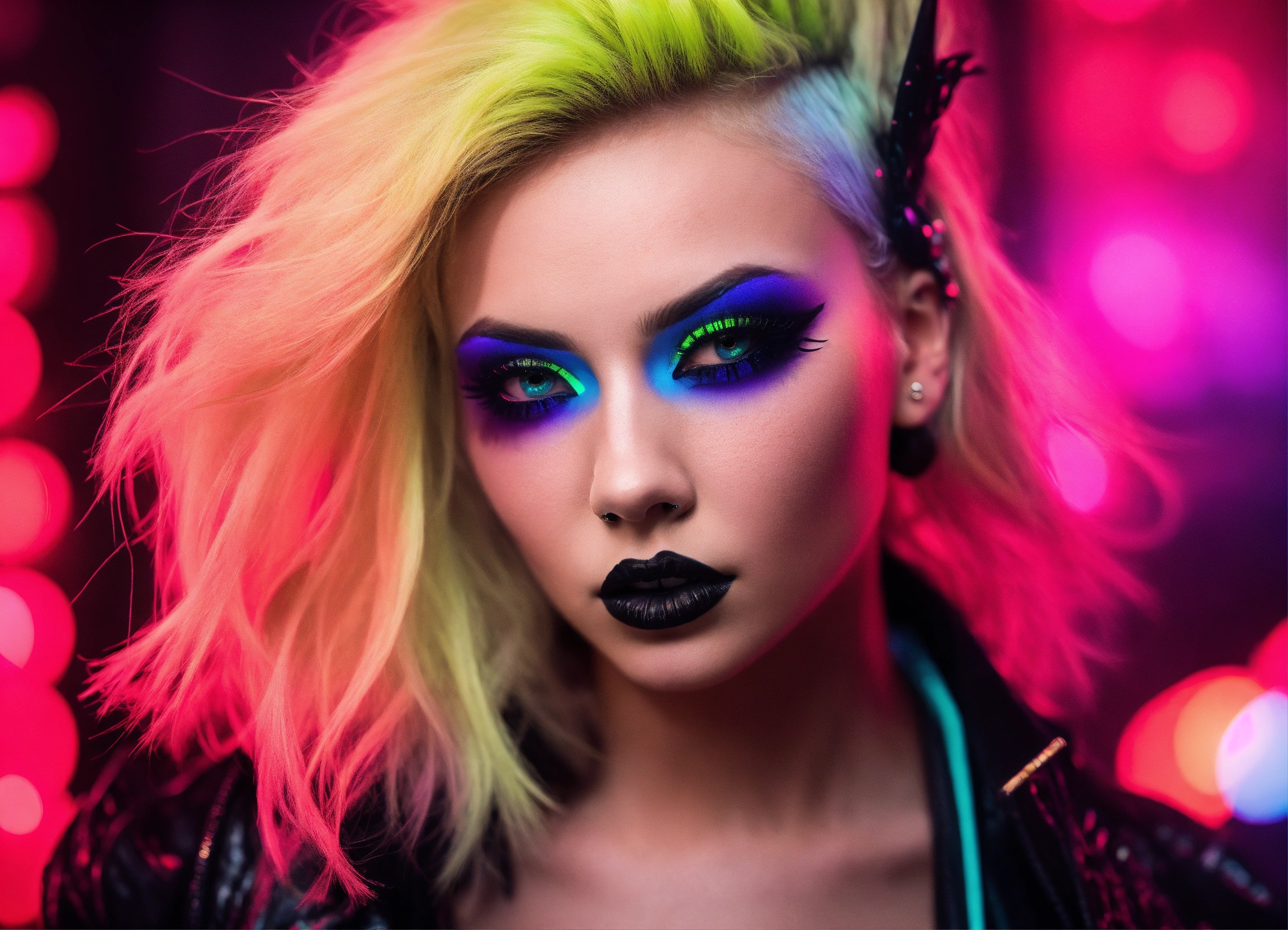 A beautiful blonde female pop artist punk in avant-garde avant-goth attire dramatic smokey eyes, with depth of field, fantastical edgy and regal themed outfit, captured in neon fluorescent shades, embodying the essence of fantasy, minimalist.