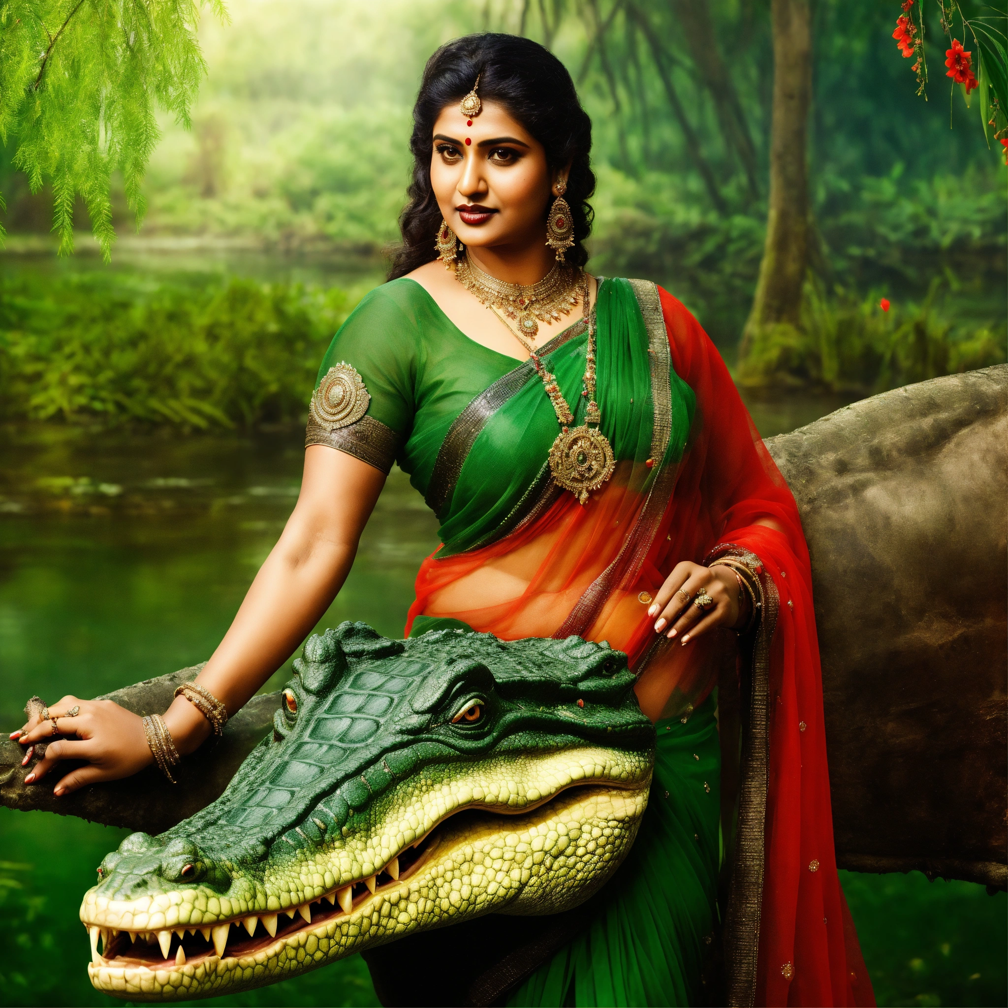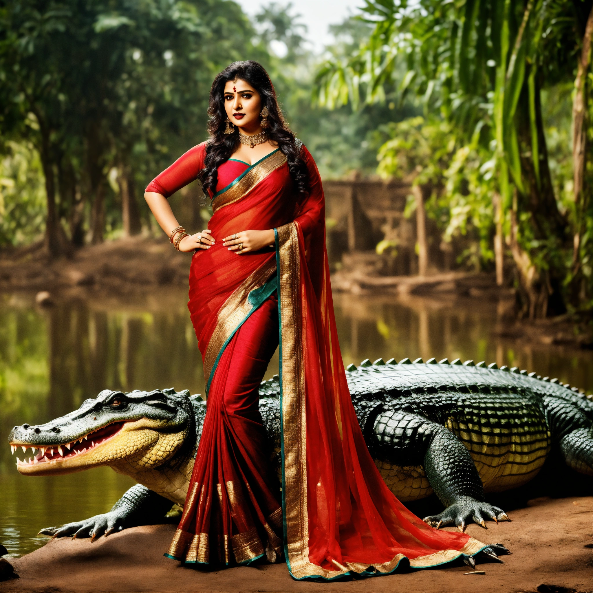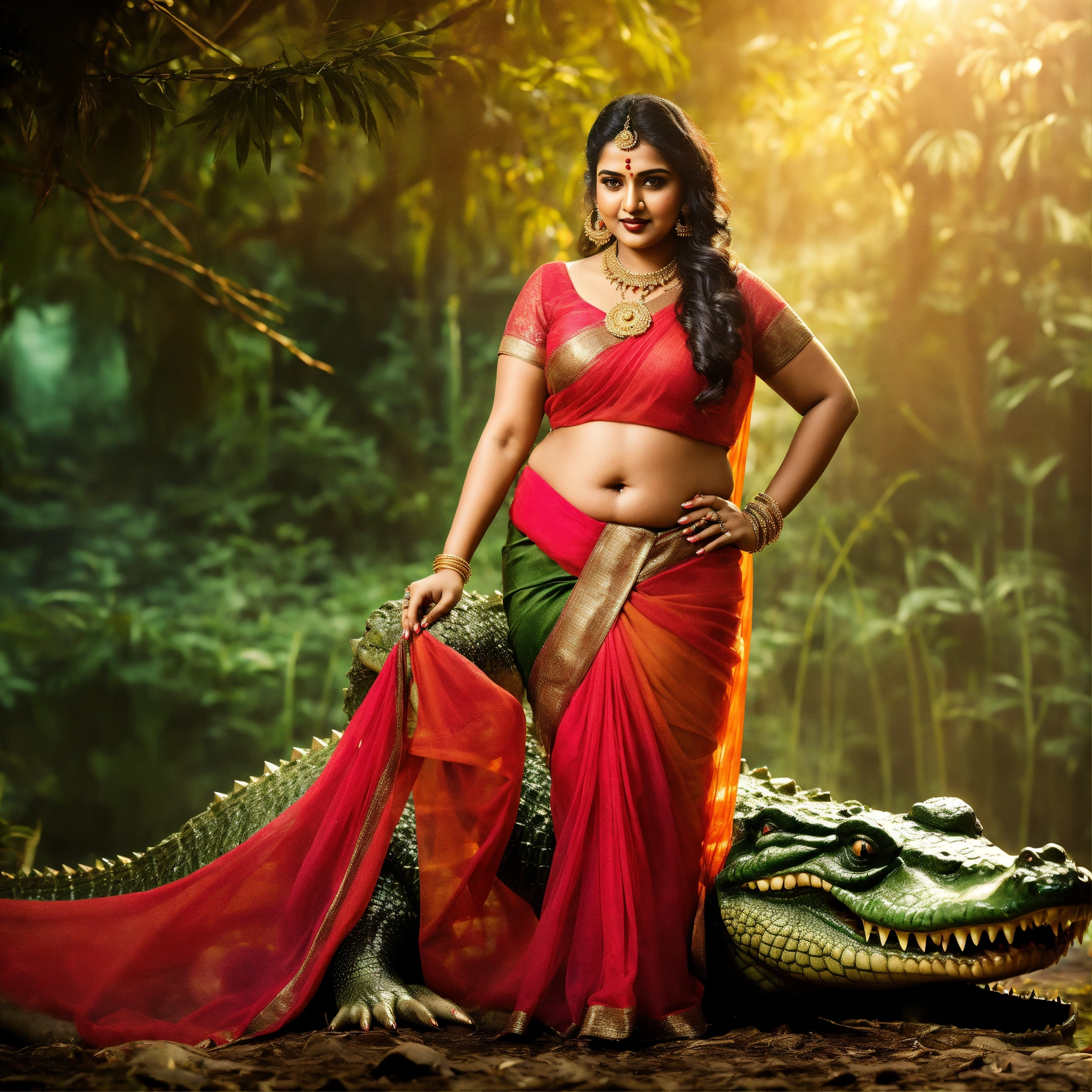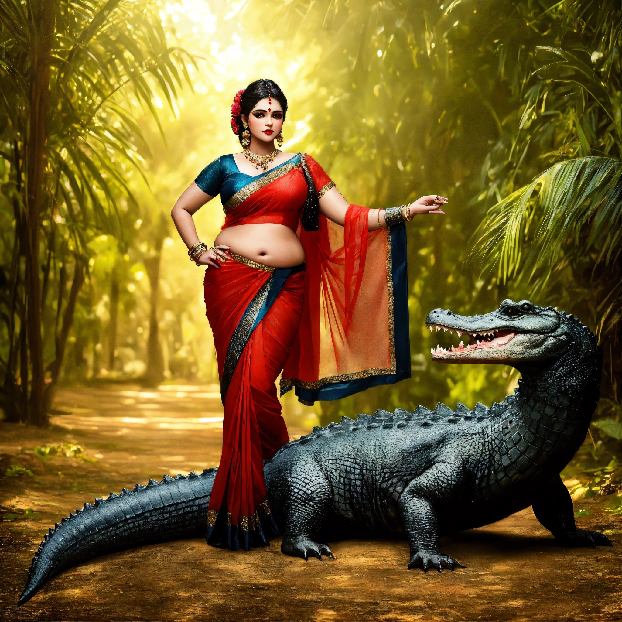 Realistic gothic digital photography woman portrait romancing crocodile lord, plus size with short transparent saree, rambha as indian goddess, full body
