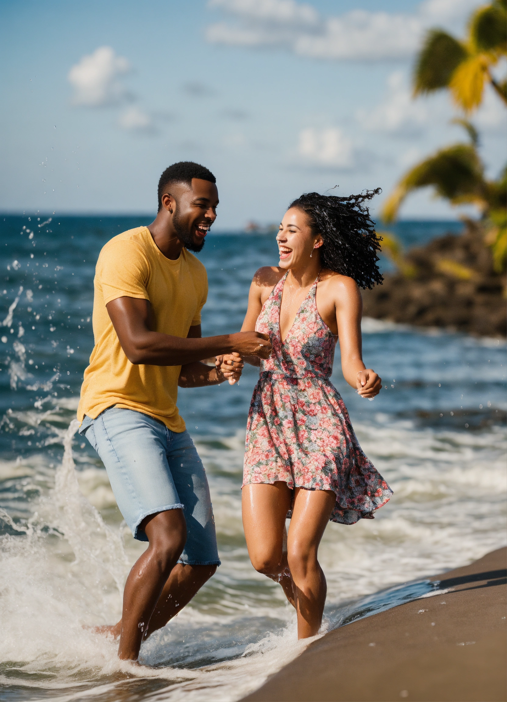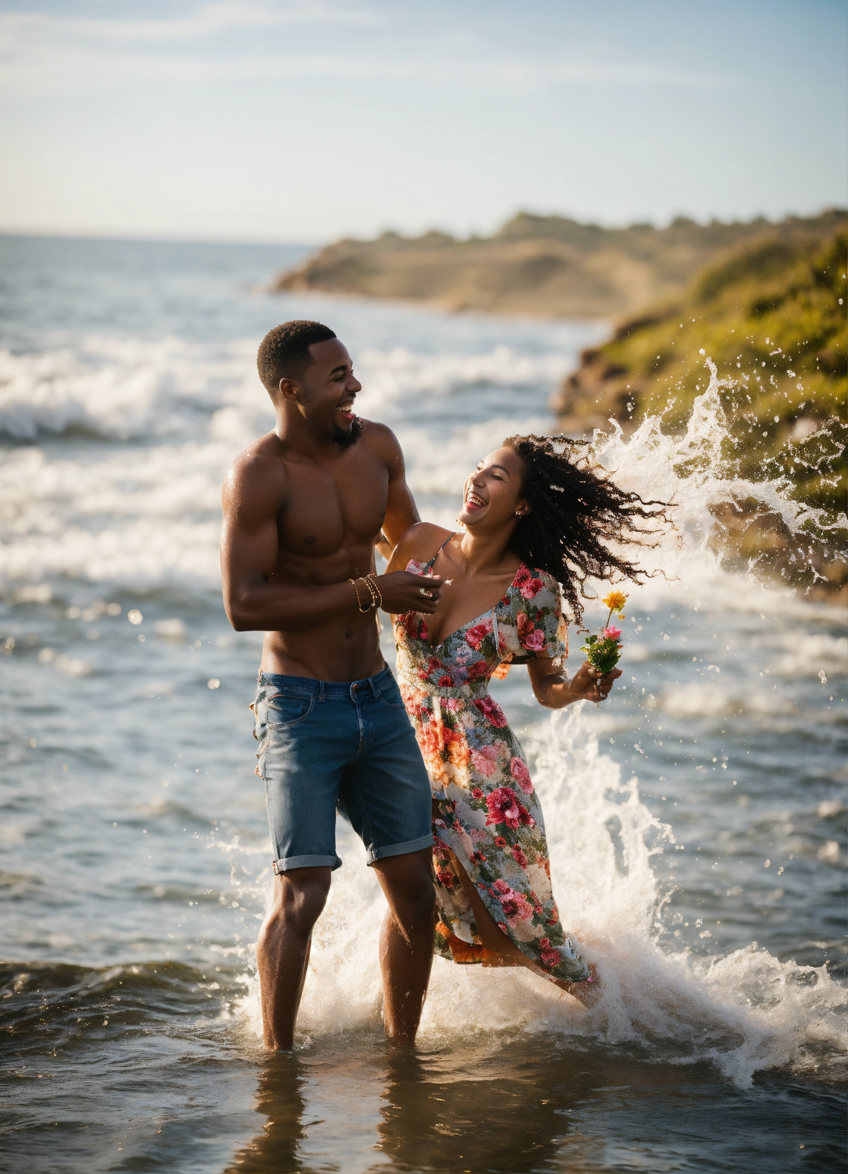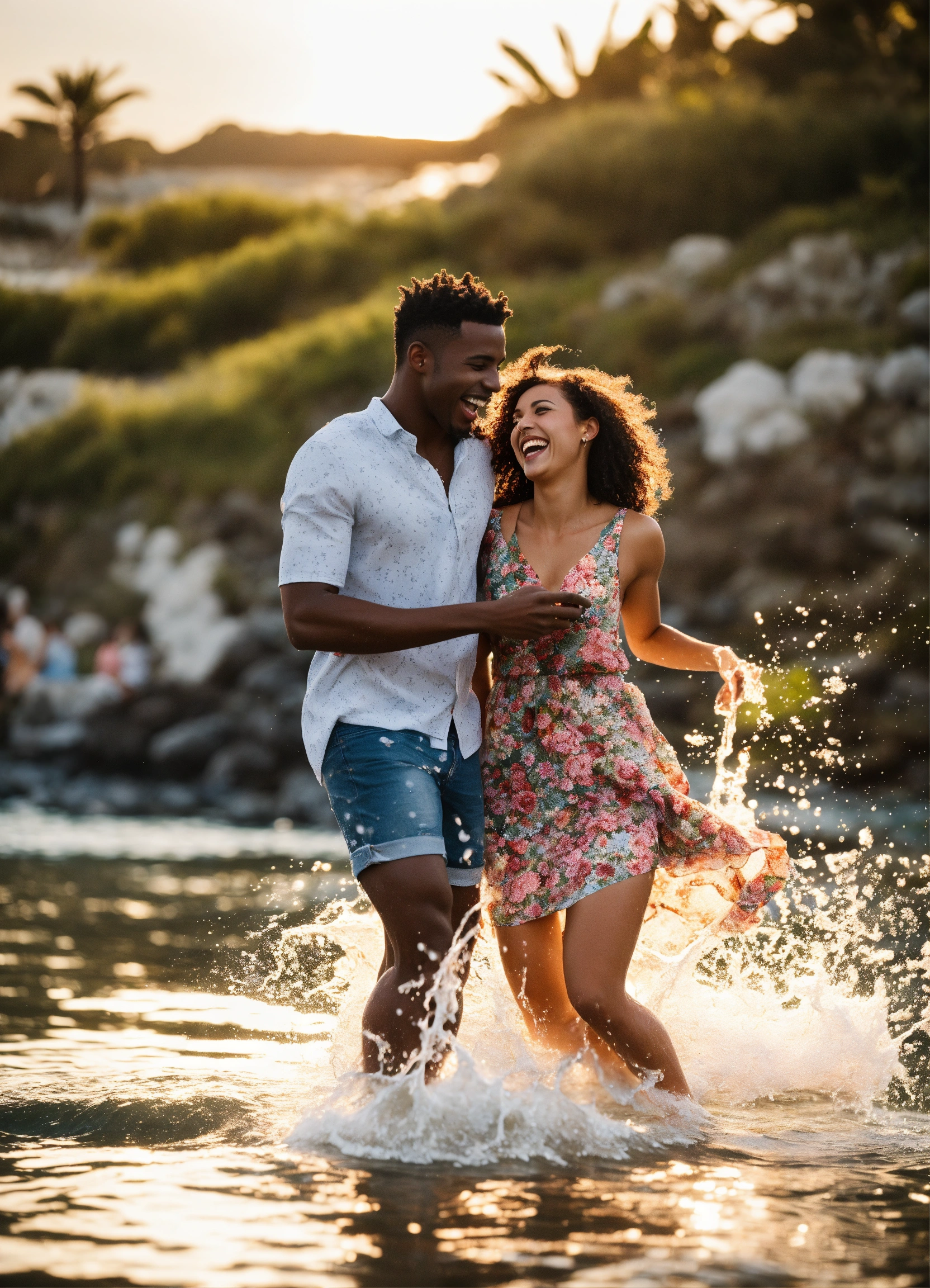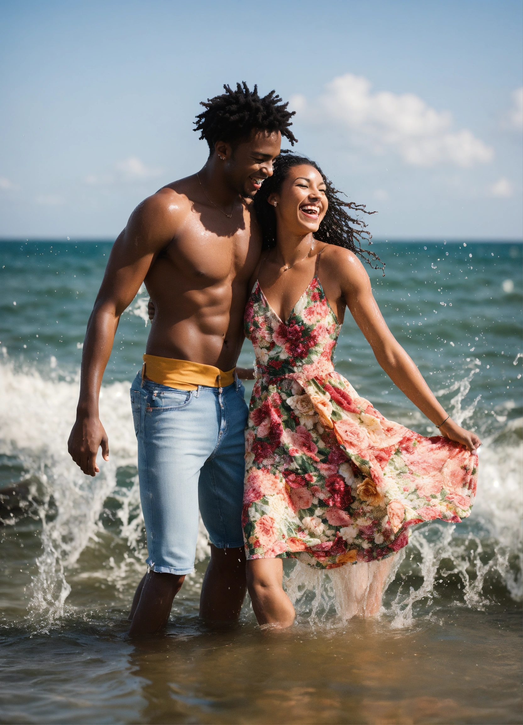 A young black man with a jean short and a young white-mixed race woman with a floral dress by the sea, splashing each other and playing with the water. they are laughing.