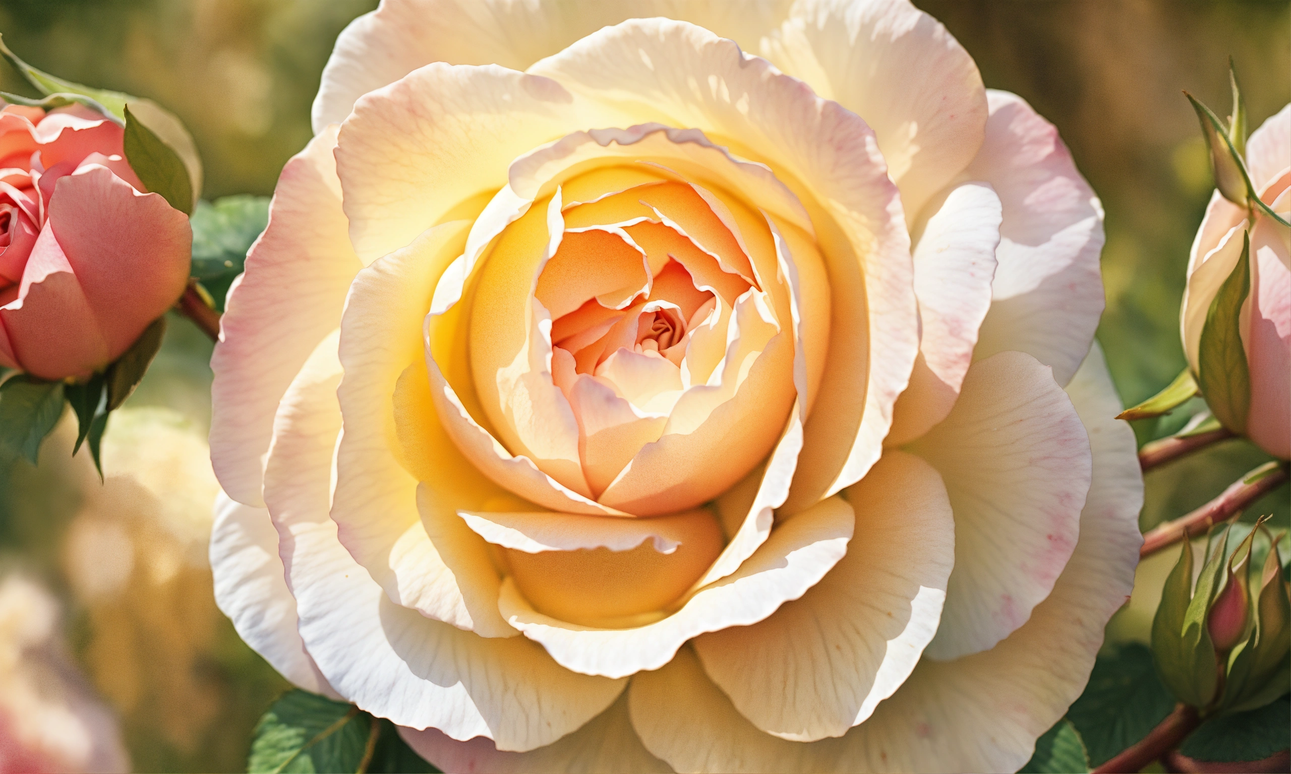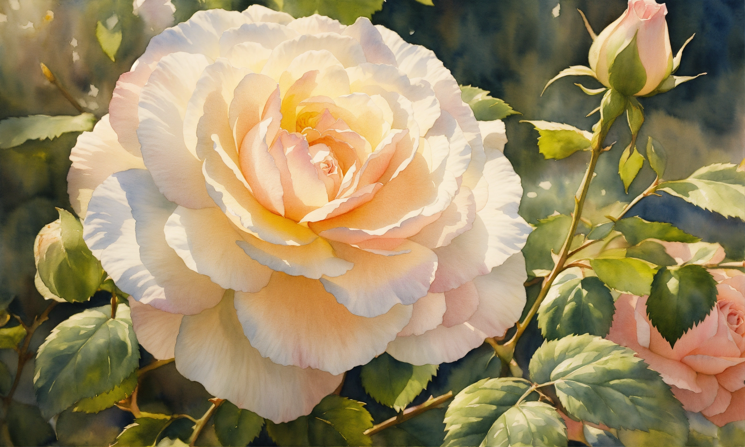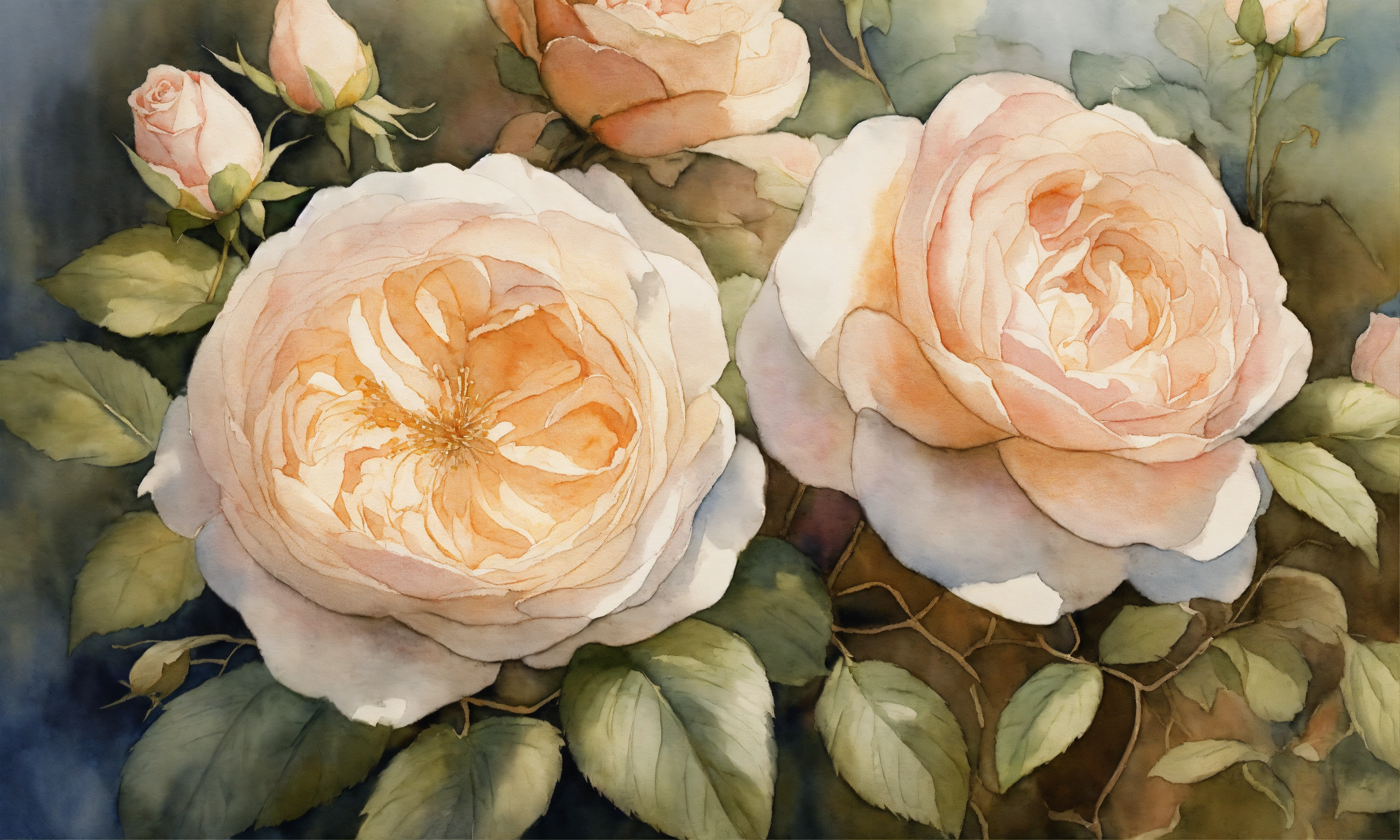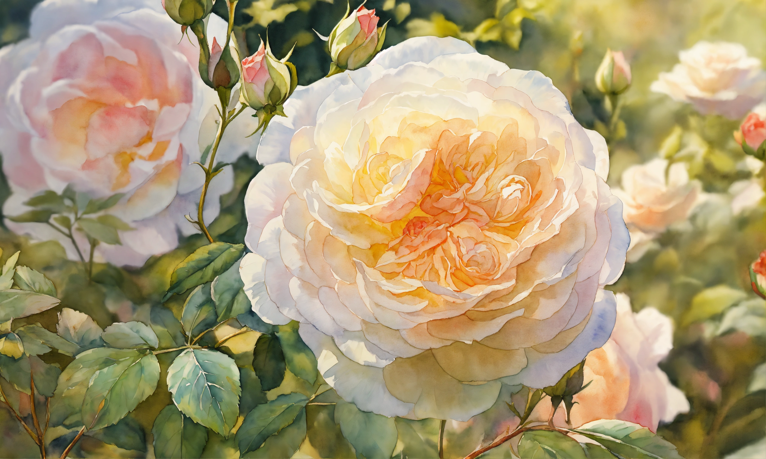 Watercolour painting, white french rose garden, warm light, intricate and detailed, 8k, ultra-detailed, sharp focus