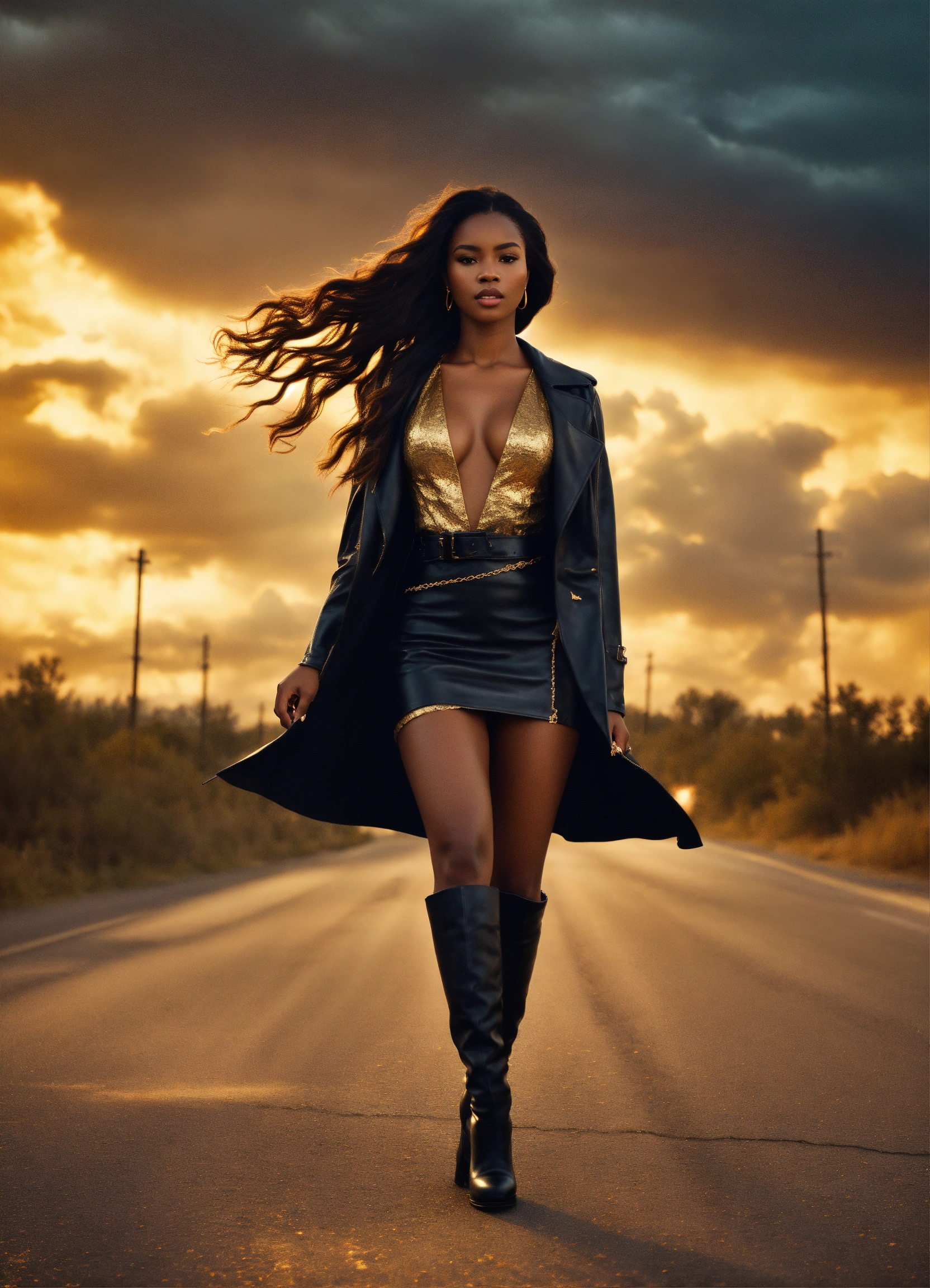 Full body stunning woman beautiful black perfect woman with dark brown skin, beautiful gorgeous classy ideal woman with dark brown skin, beautiful perfect face, shapely hour-glass figure long flowing hair, fully clothed in a stylish mid length leather form fitting white dress and boots, with gold jewelry she's walking down a lonely road behind her is the sky with gold lightning and dark clouds behind her, high detail, realistic photo, high detail, digital painting, cinematic, stunning, hyper-realistic, sharp focus, high resolution 8k, insanely detailed