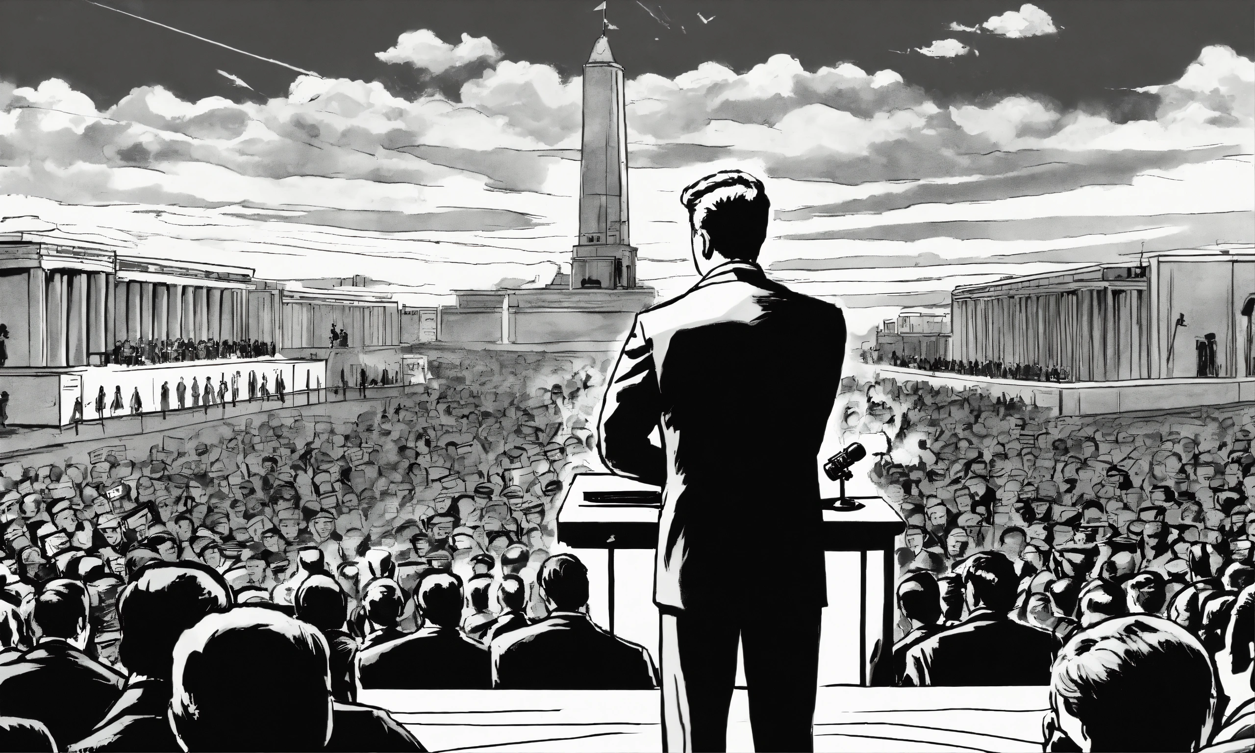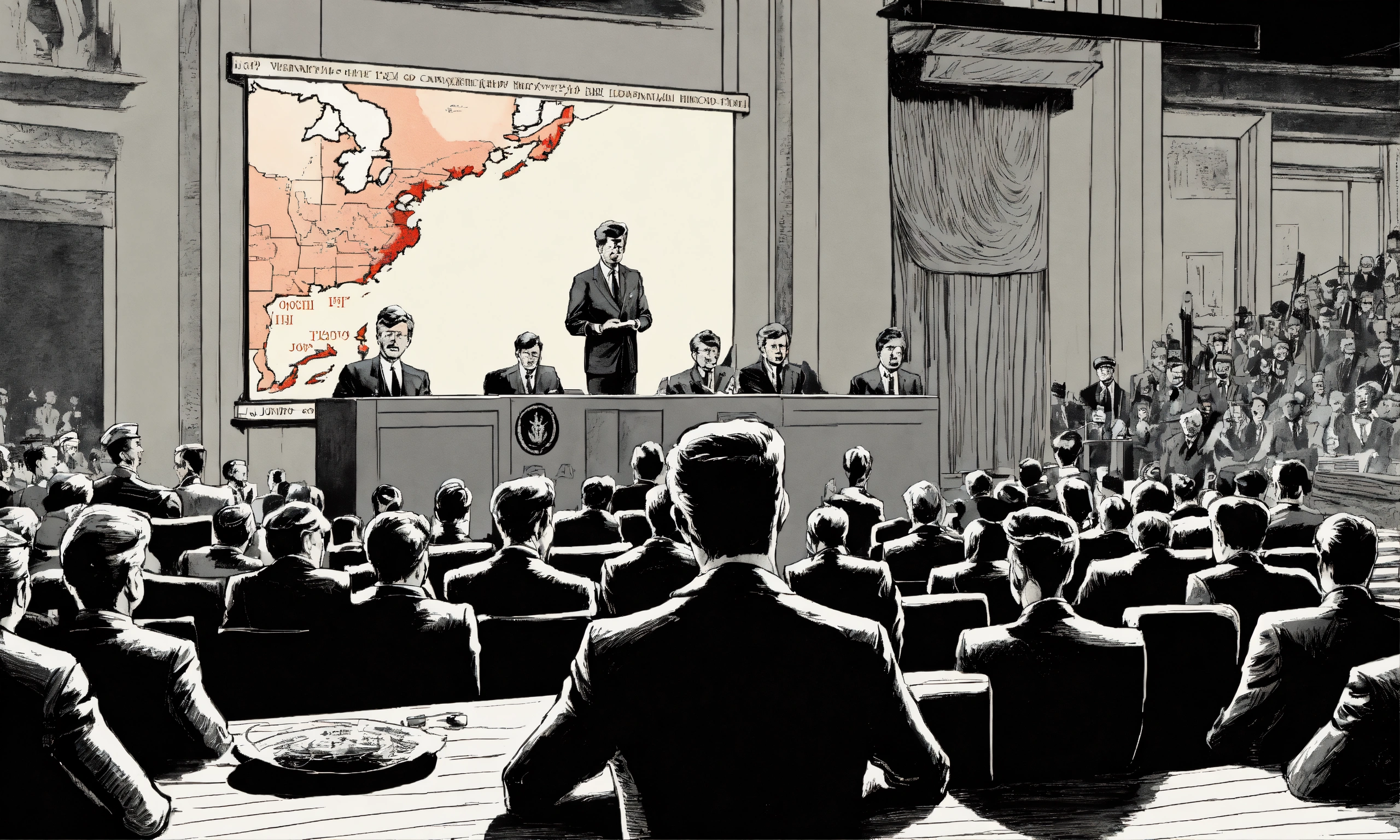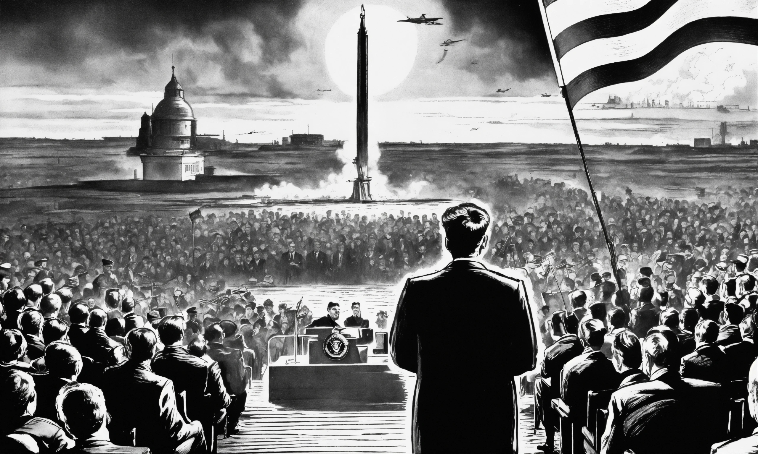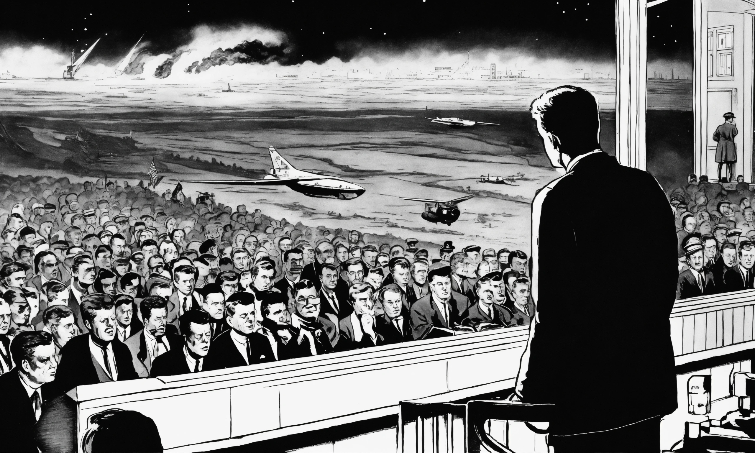 John f kennedy giving speech with united states and ussr fighting cold war in background, surrealism, retro comic, black and white