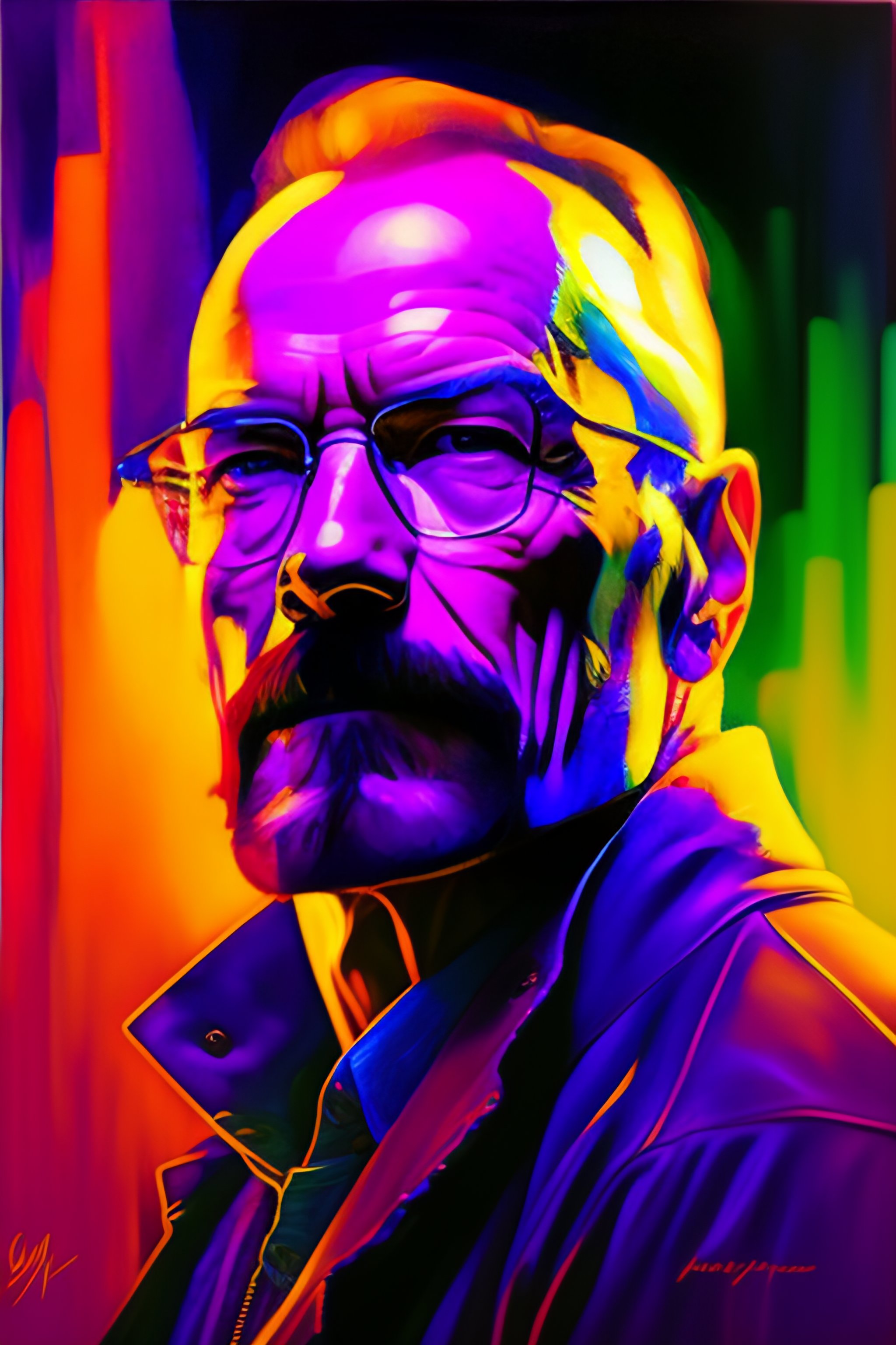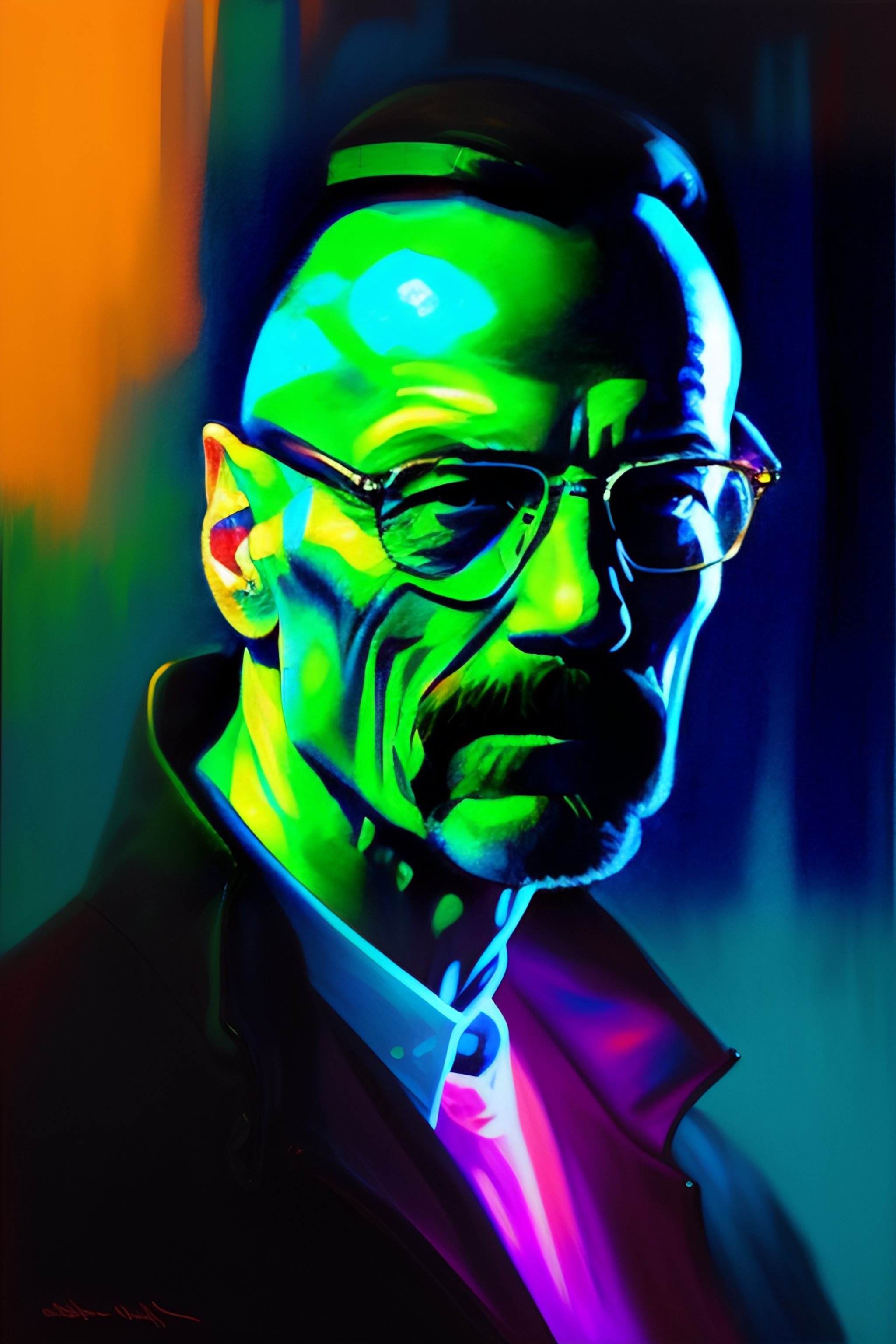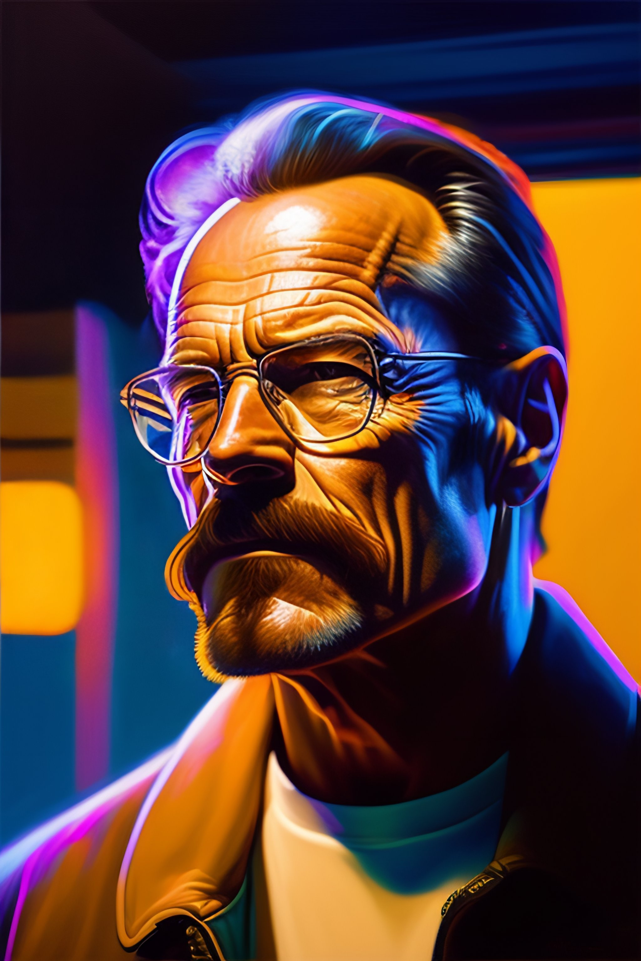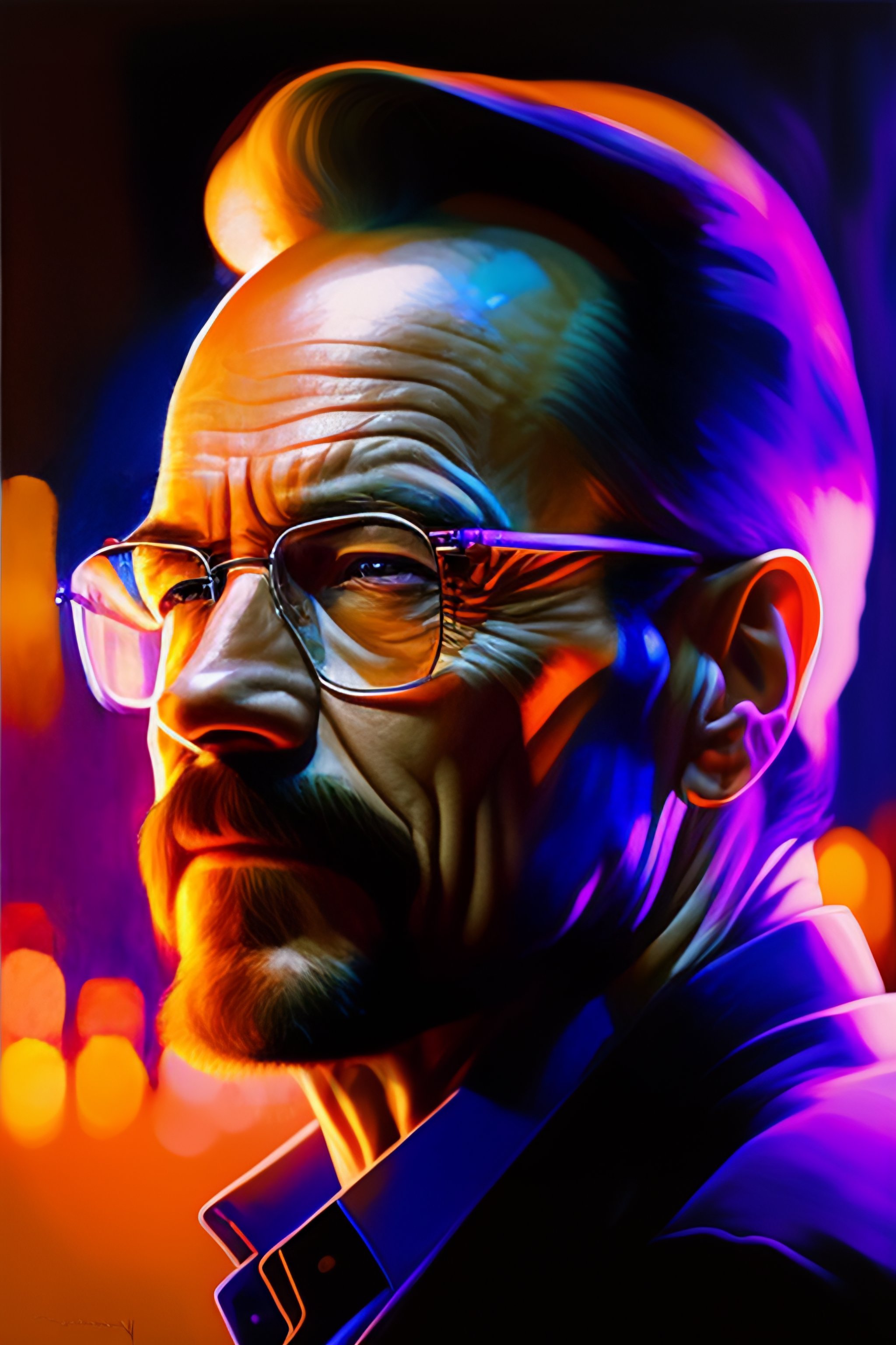 A highly detailed beautiful portrait of walter white, neon lights, by gregory manchess, james gurney, james jean