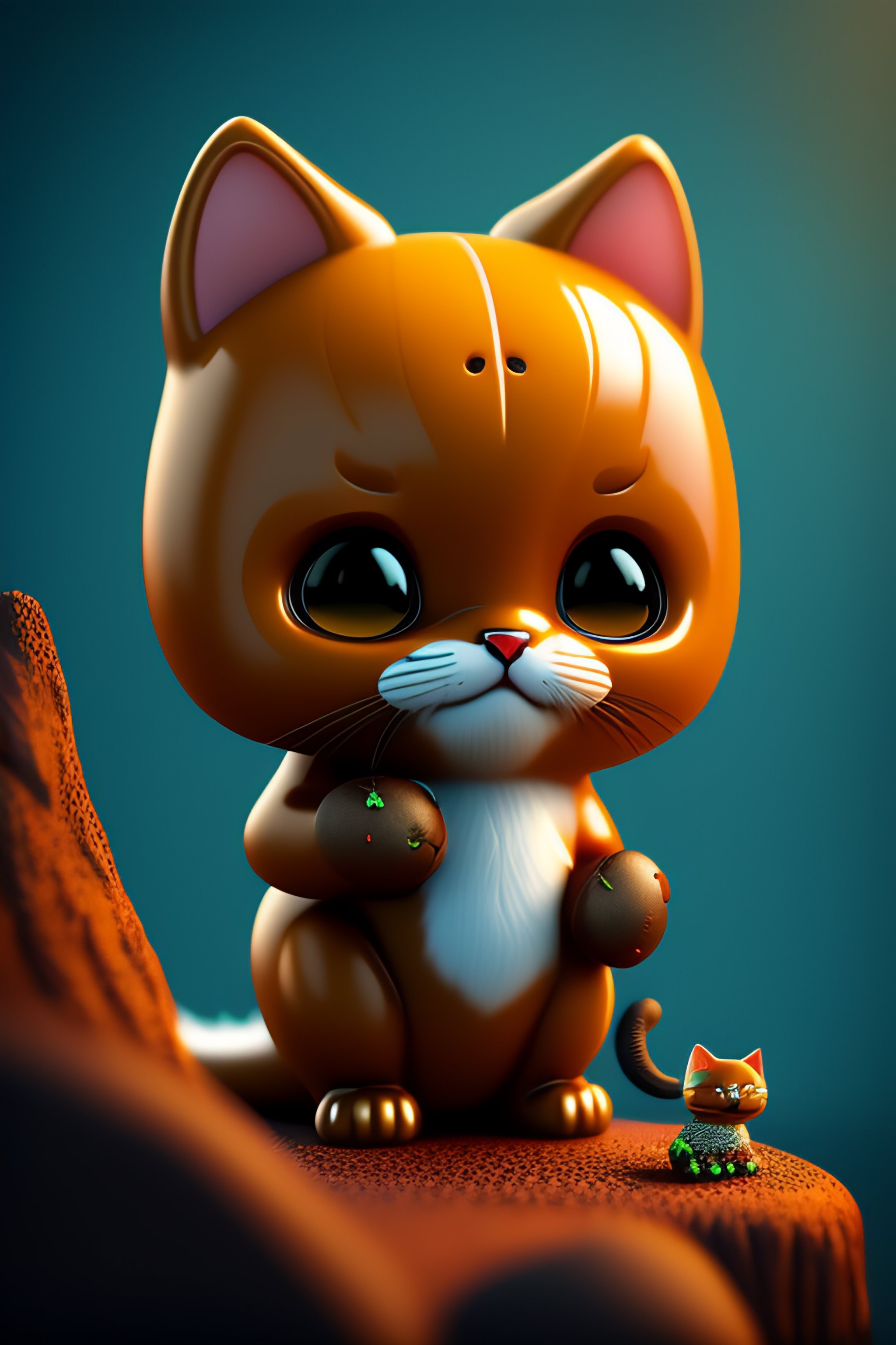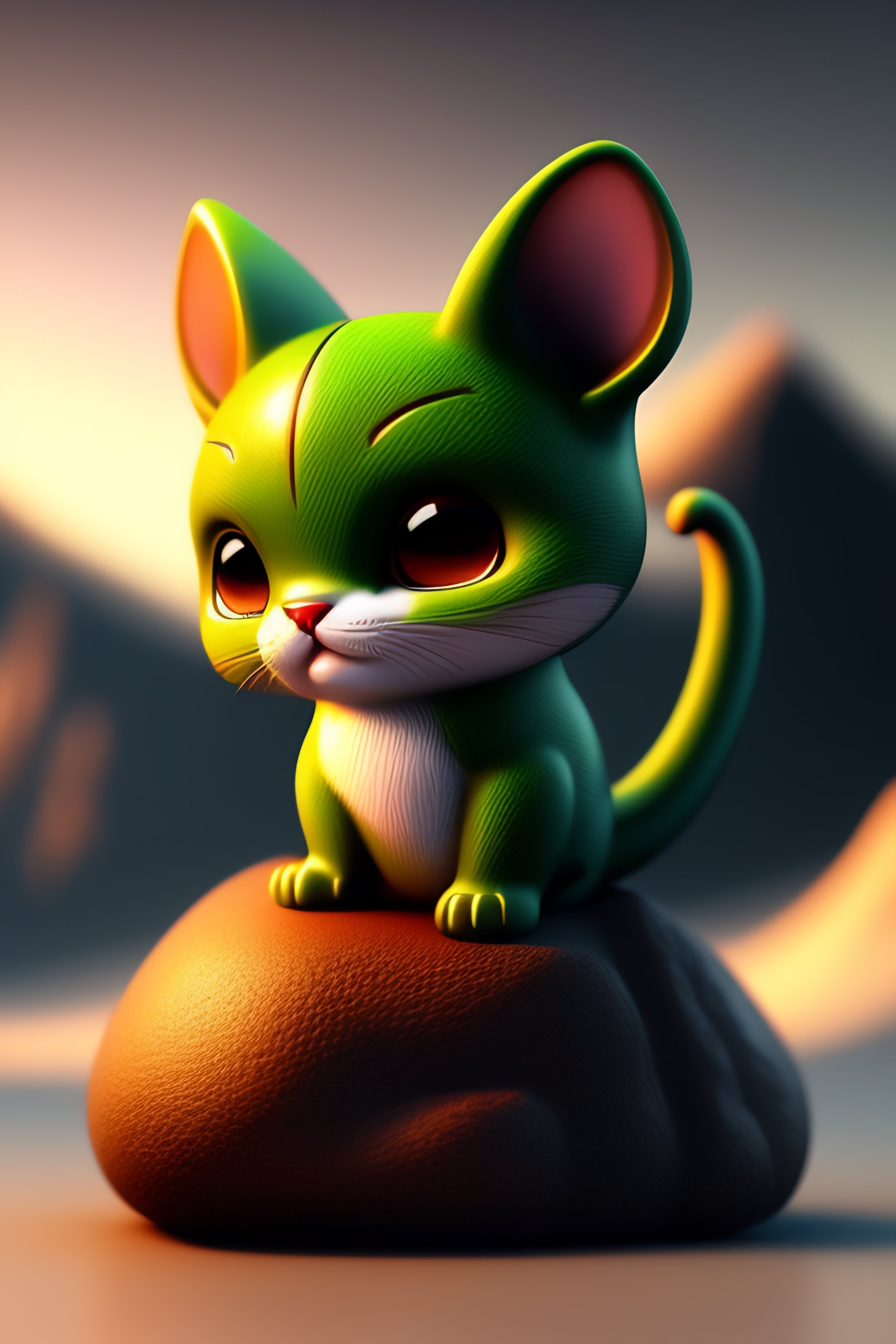 Creepy chibi kitten with crocodile body in the mountain