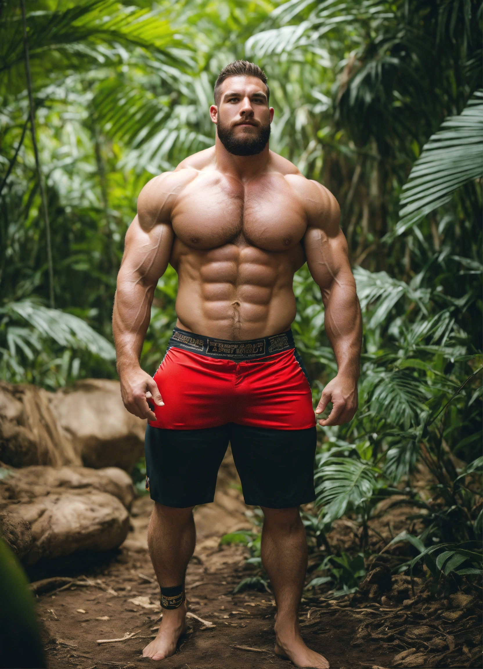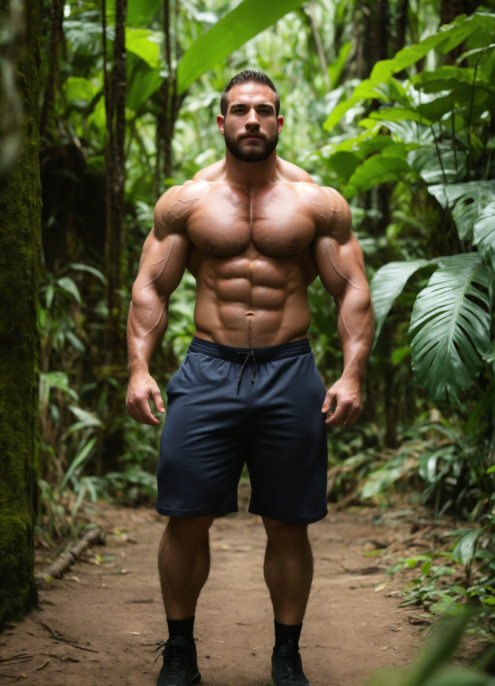 30-year-old man with big muscles, big bodybuilder, american, hairy torso, body like a wrestler, in a jungle