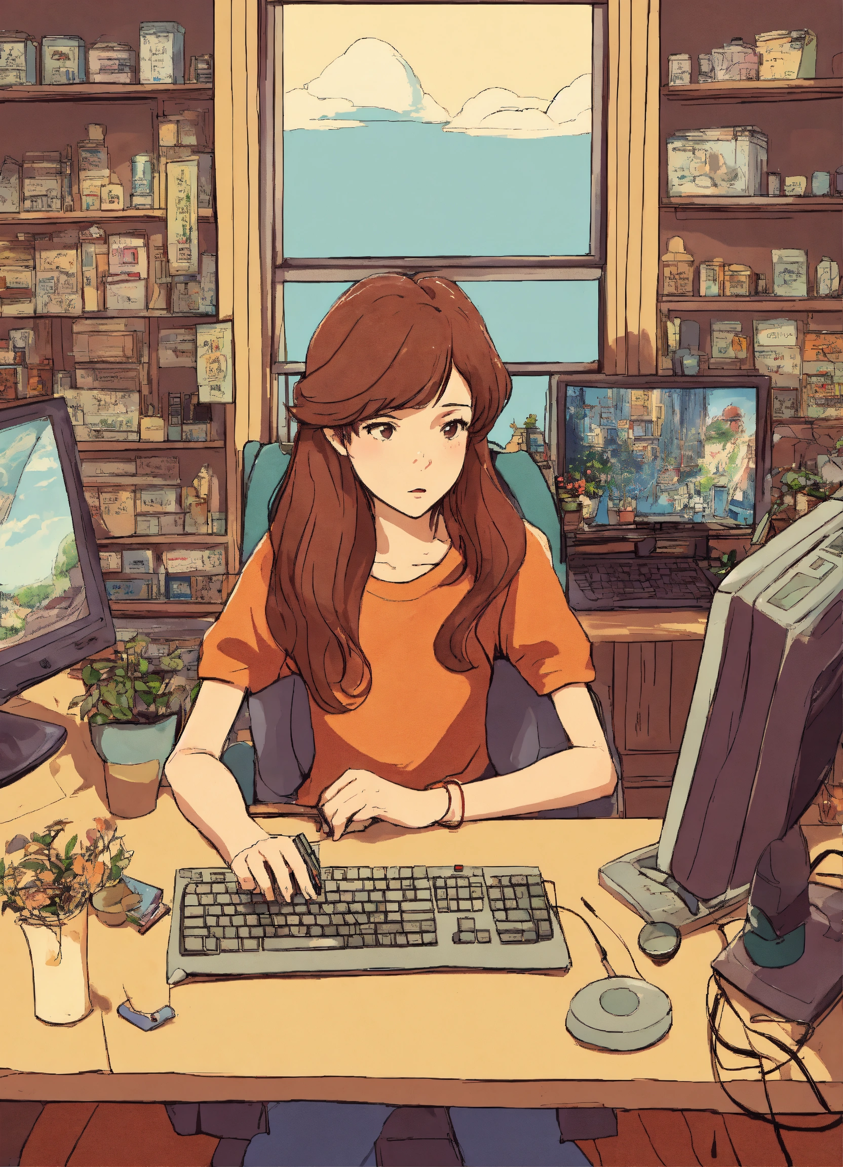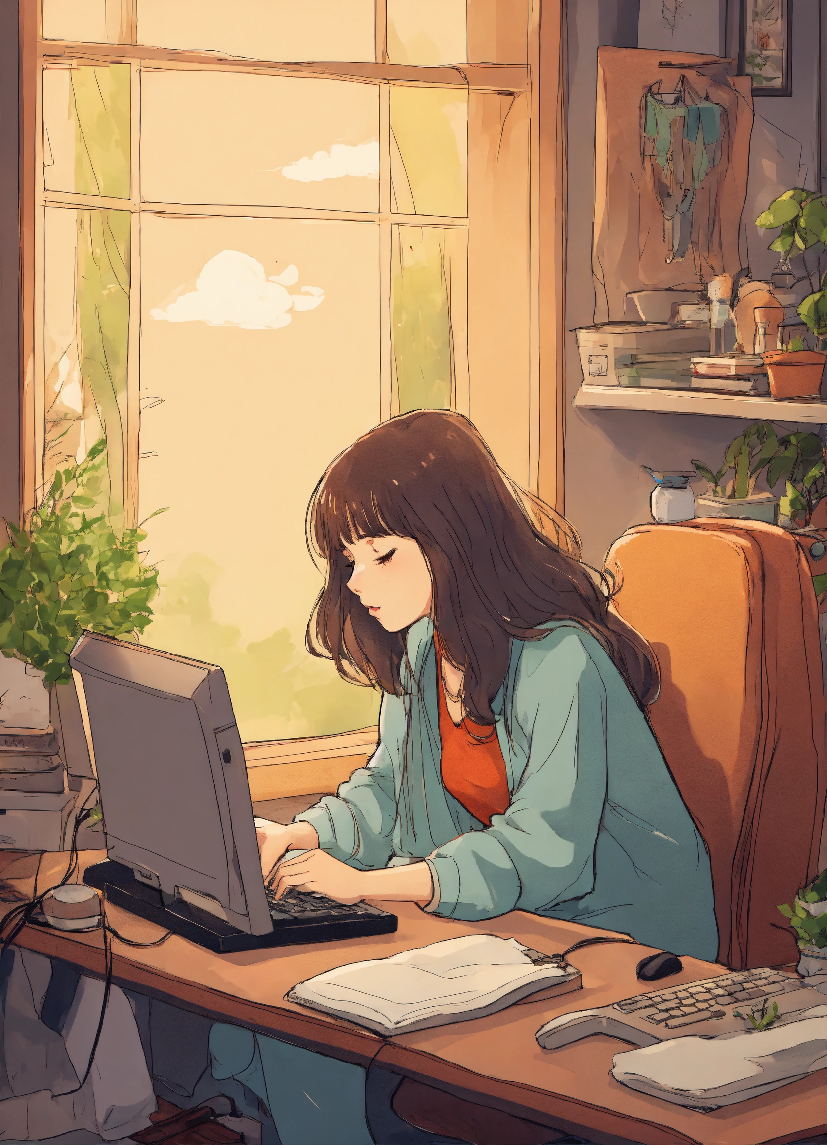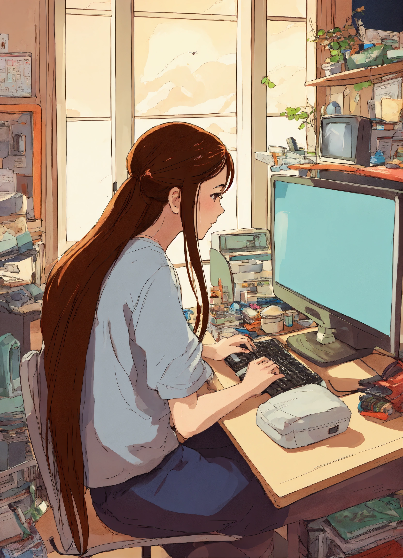 One woman, 20 years old, working on a computer, long hair studio ghibli style illustration, wide angle