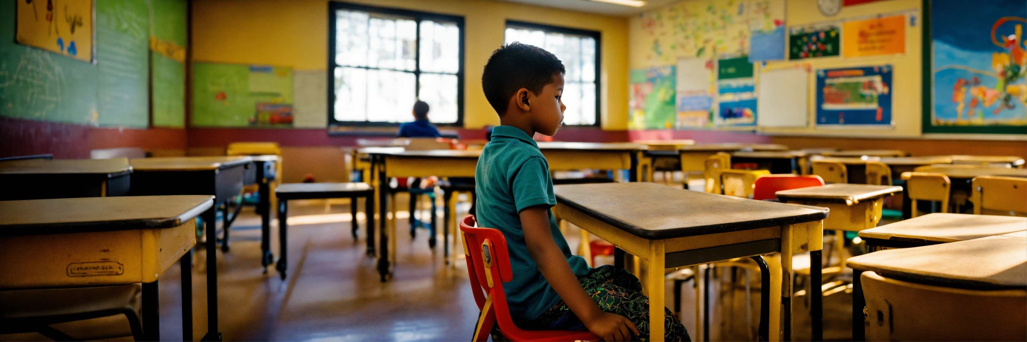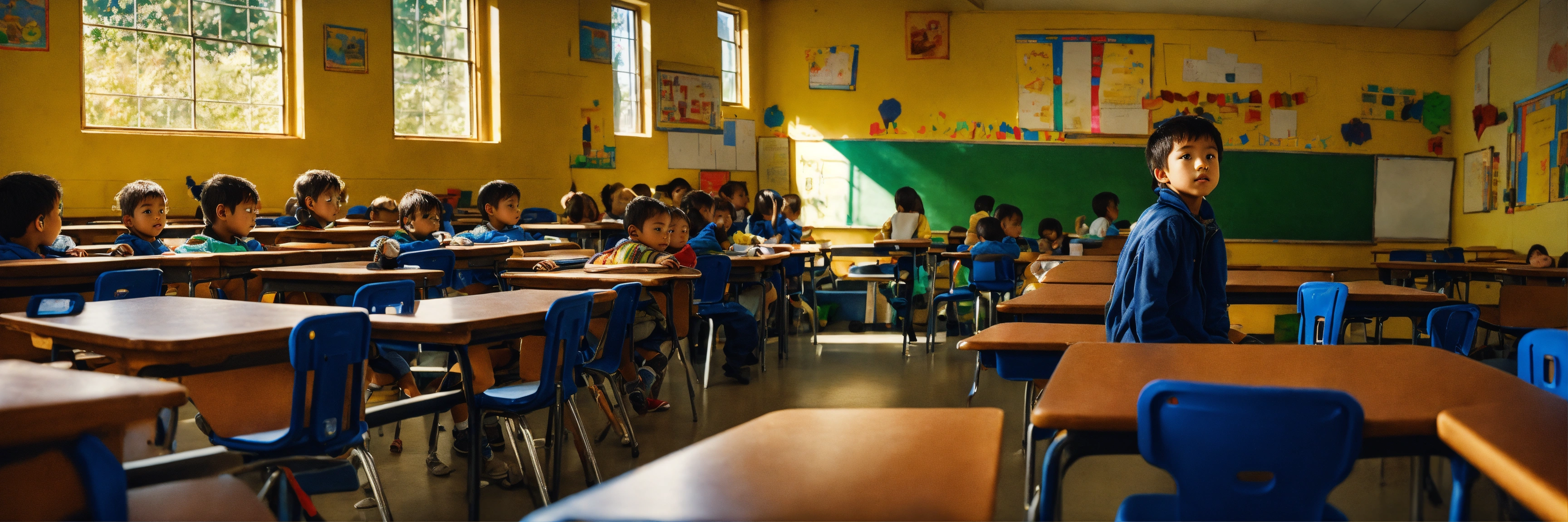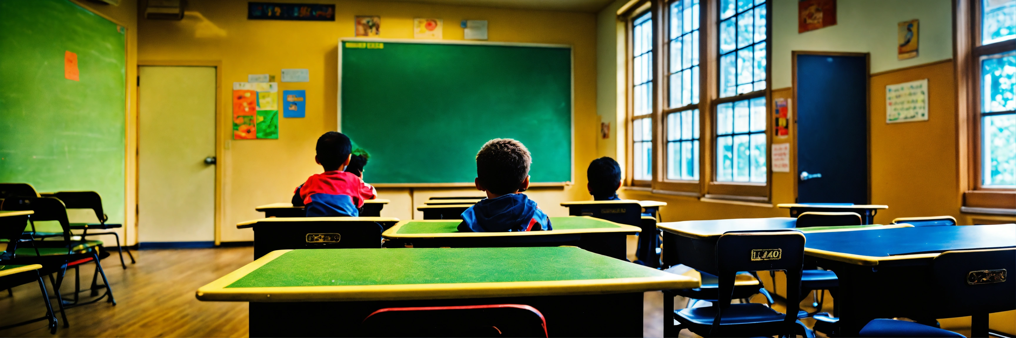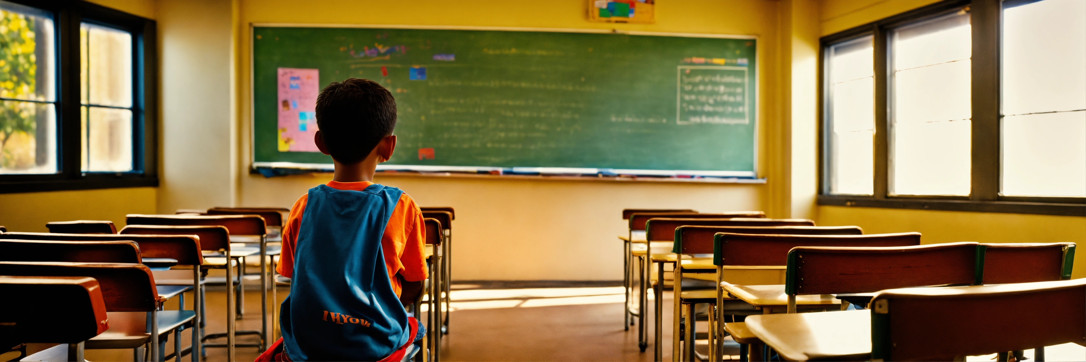 Child sitting with his back in a classroom, fresh perspective in the style of photo real, hyper-realistic, high dynamic range, rich colors, lifelike textures, 8k uhd, high color depth, nikon d 850, kodak portra 400, fujifilm xt