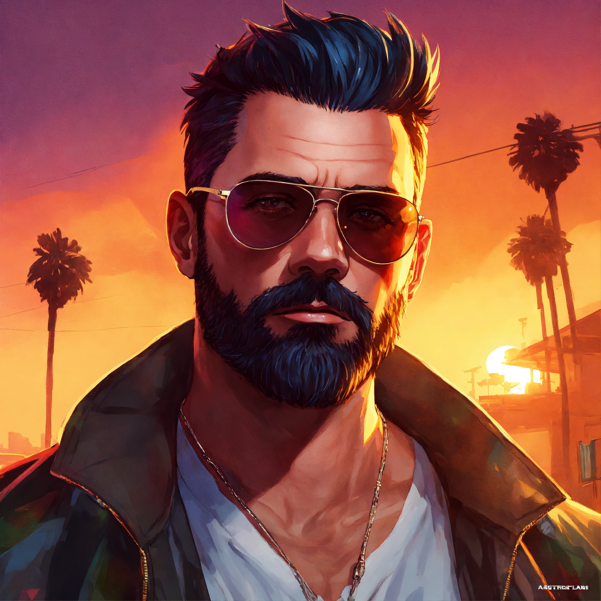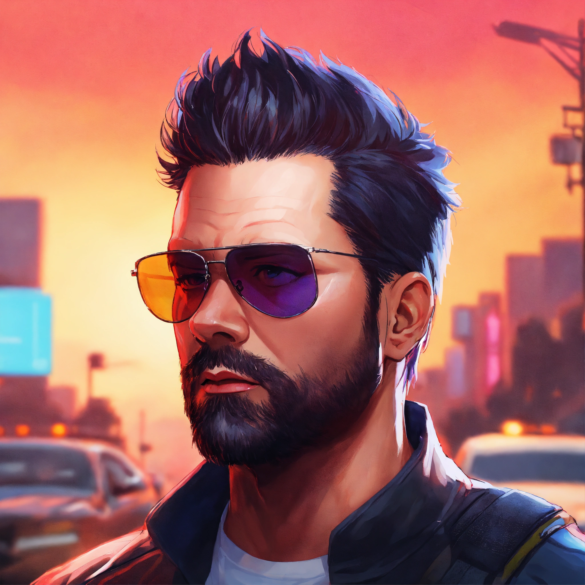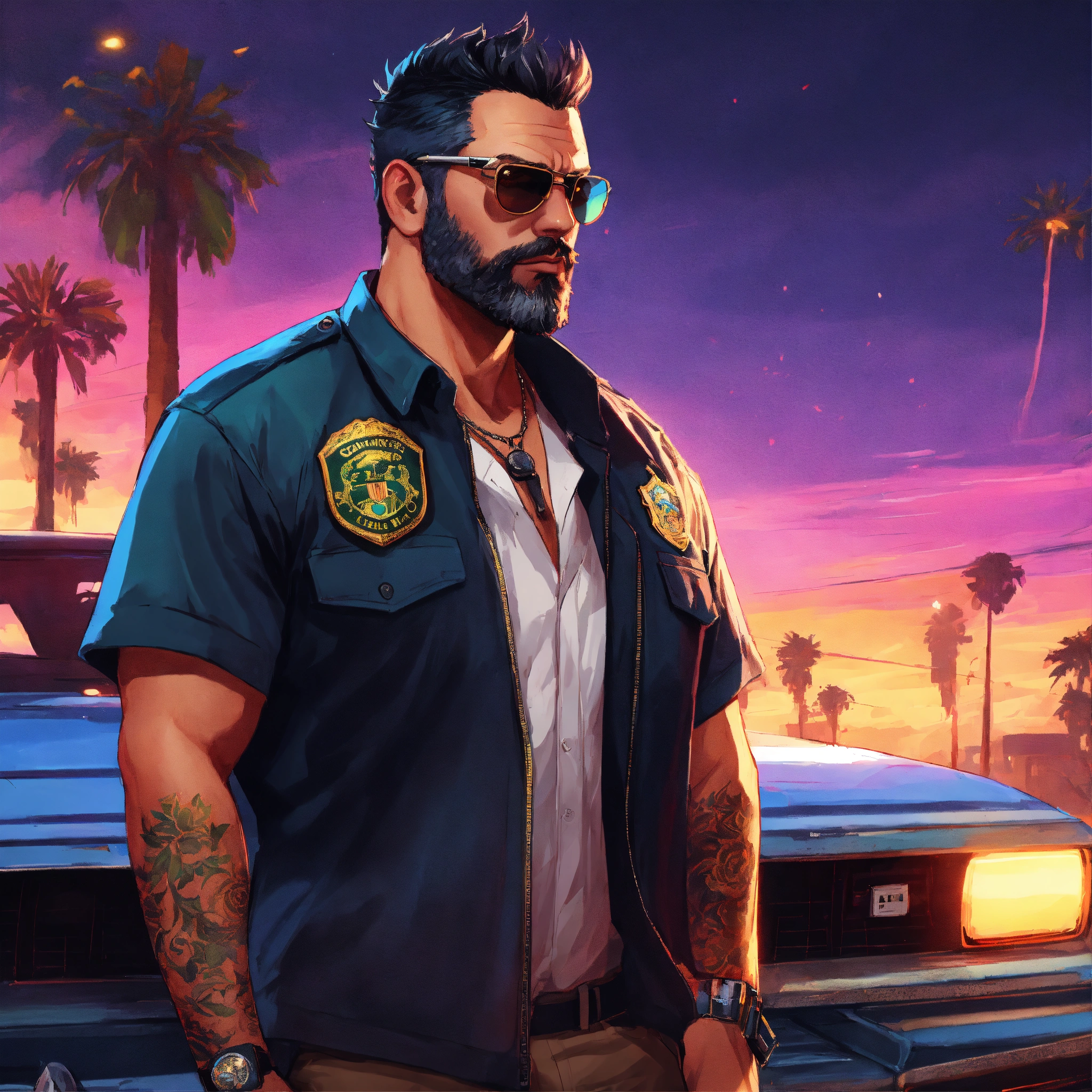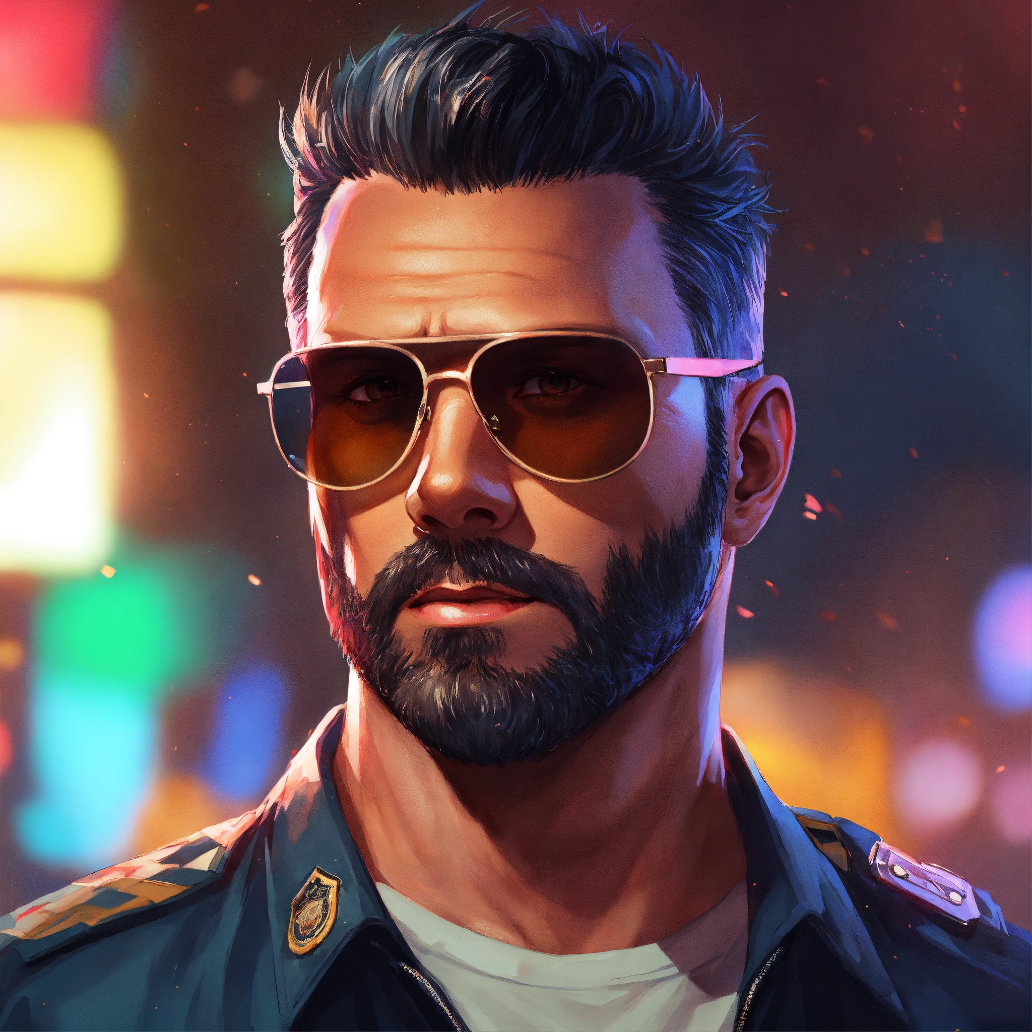 Full face portrait of a beautiful middle age white man with short black hair, american, sunglasses, beard, short faux hawk, police detective, 40 years old, digital artwork, gta v loading screen art, colourful, anime style by rossdraws artgerm and greg rutkowski, 4k, graphic design, adobe illustrator, behance, trending on pixiv, epic lighting, intricate, gta v, integrates a title into the image "darkfreeman"