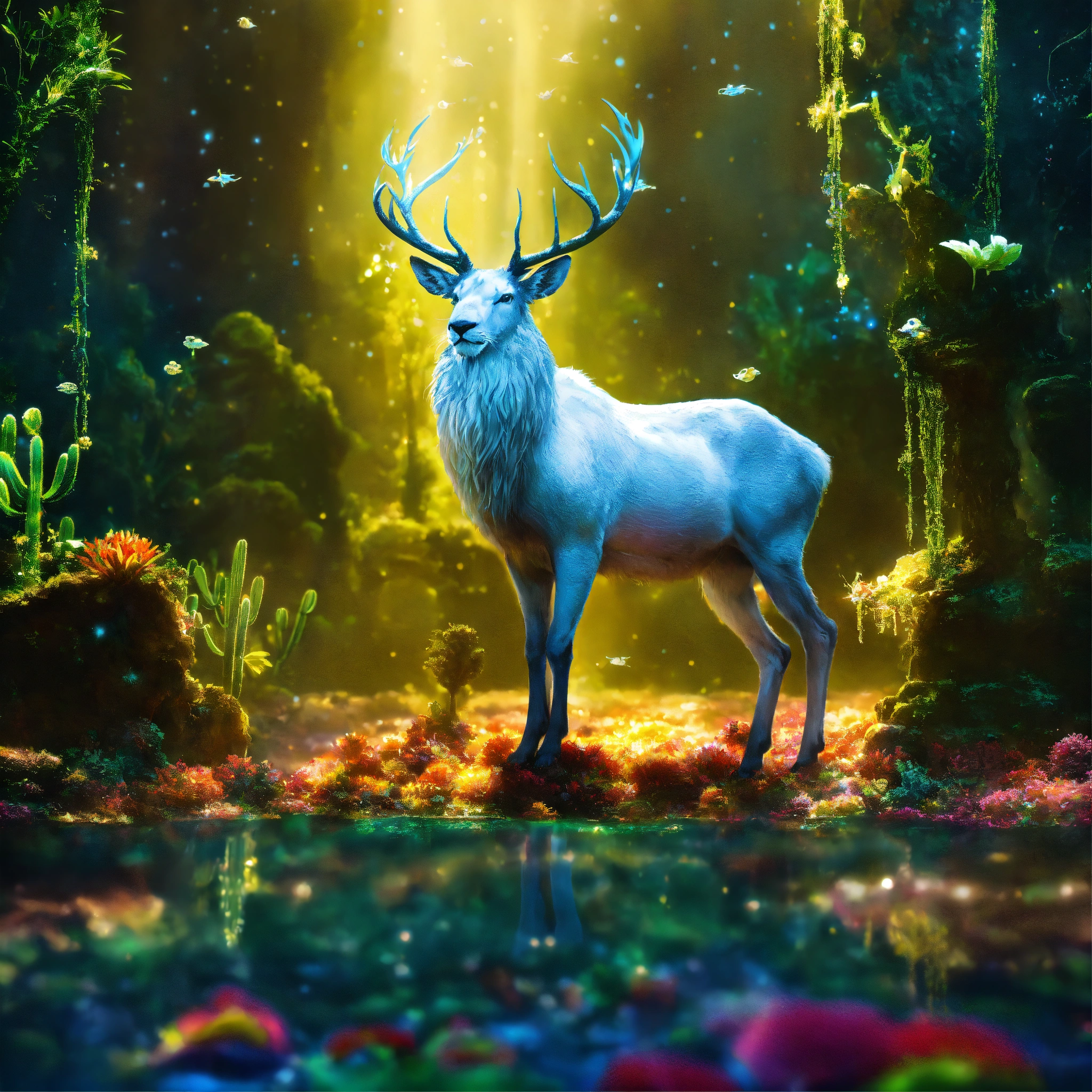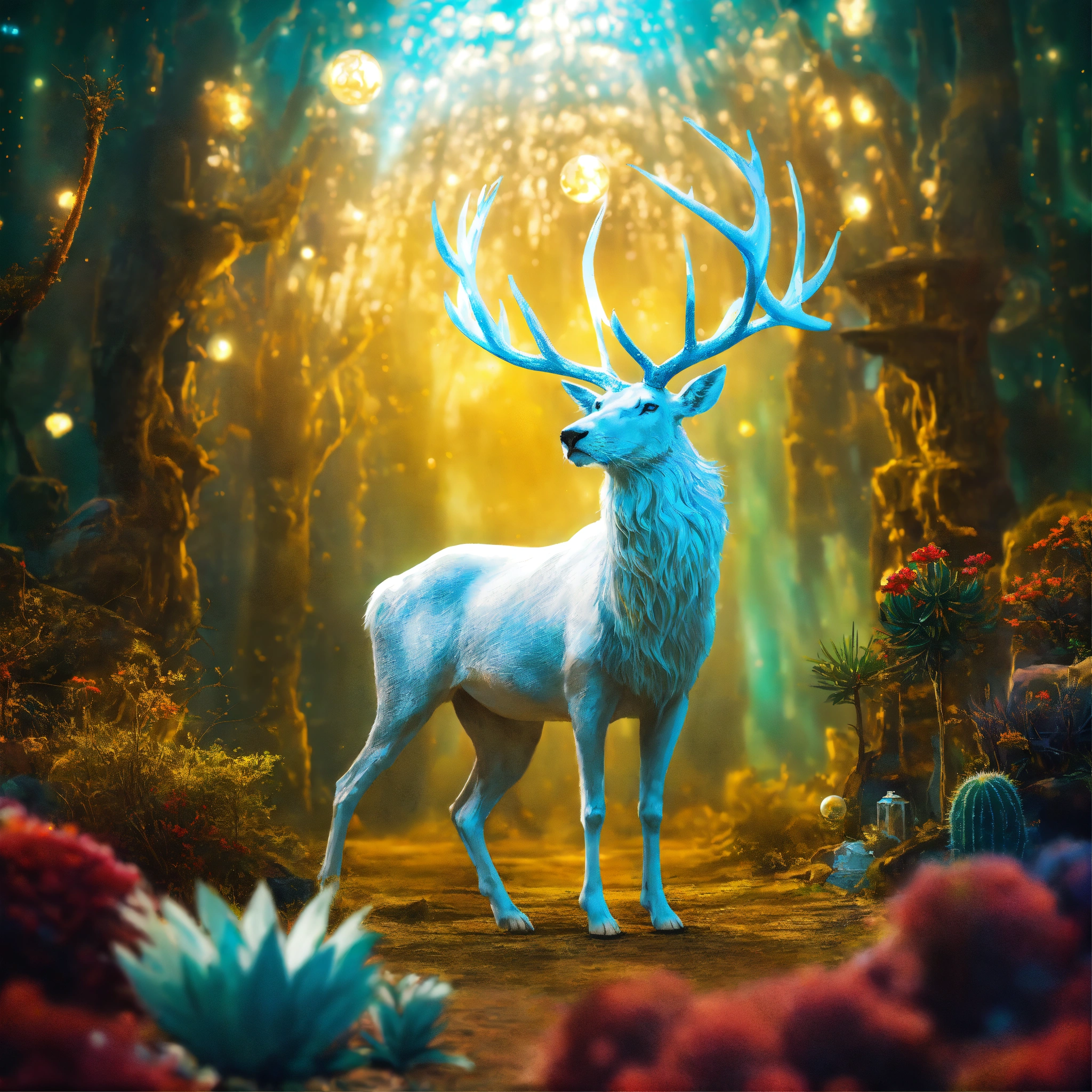 Underwater long exposure photography, a giant white elk flying in the cosmos in the daytime with orbs and cactus and portals, x-ray style, in the style of tim burton, harry potter, game of thrones, lion king, the chronicles of narnia, beauty and the beast, and peter pan. with sacred geometric patterns on the body. enchanting aura. the chronicles of narnia, wizard of oz, and alice in wonderland, harry potter background
