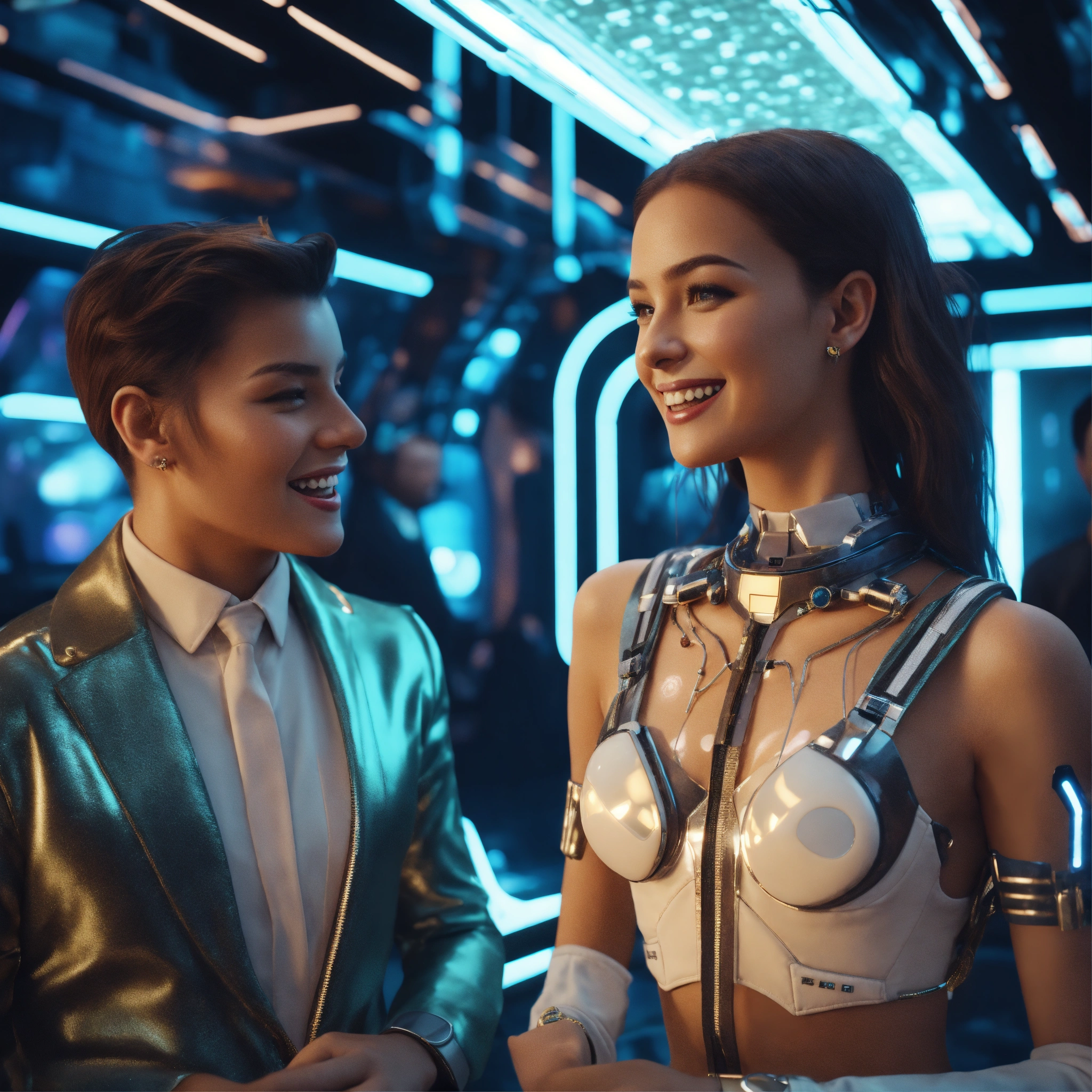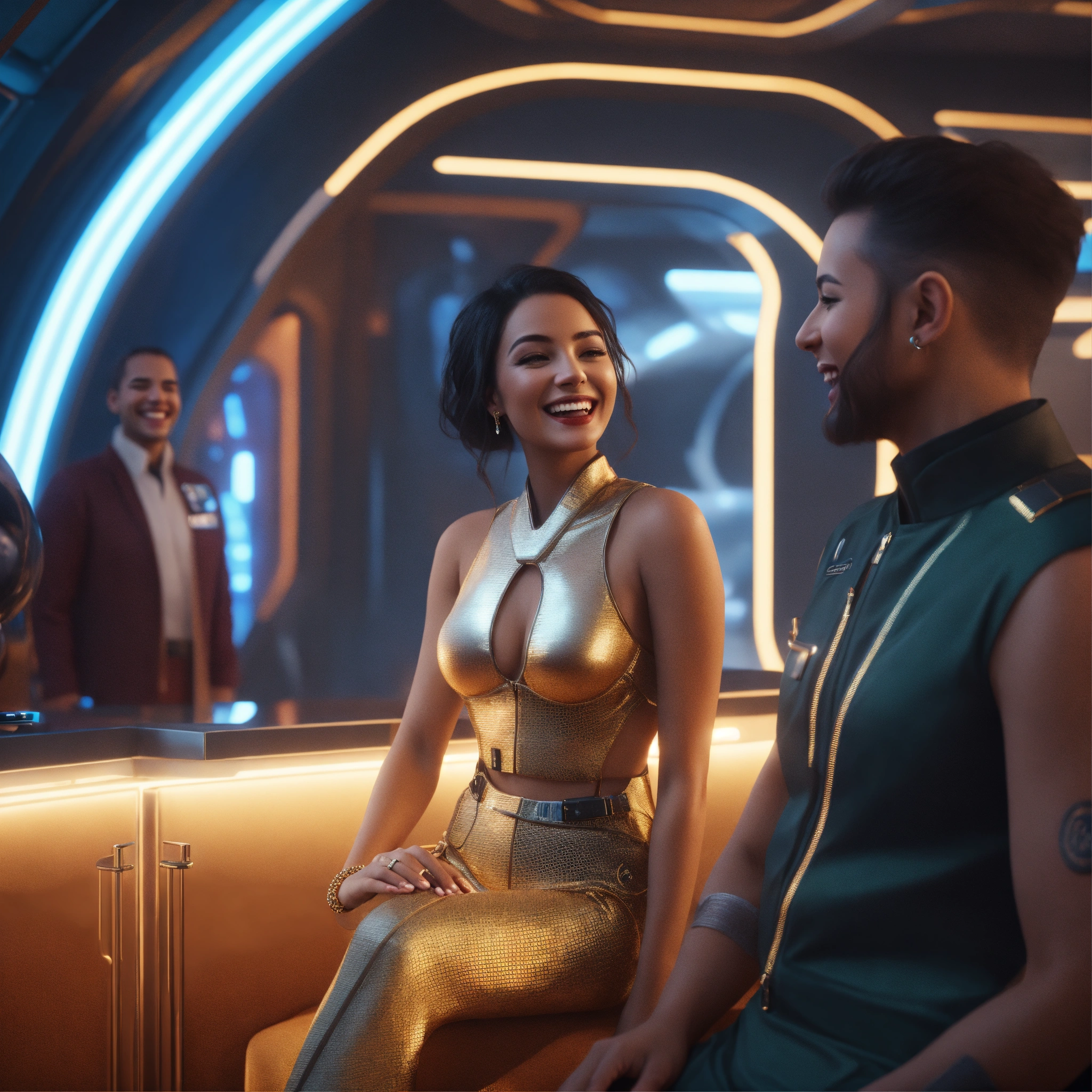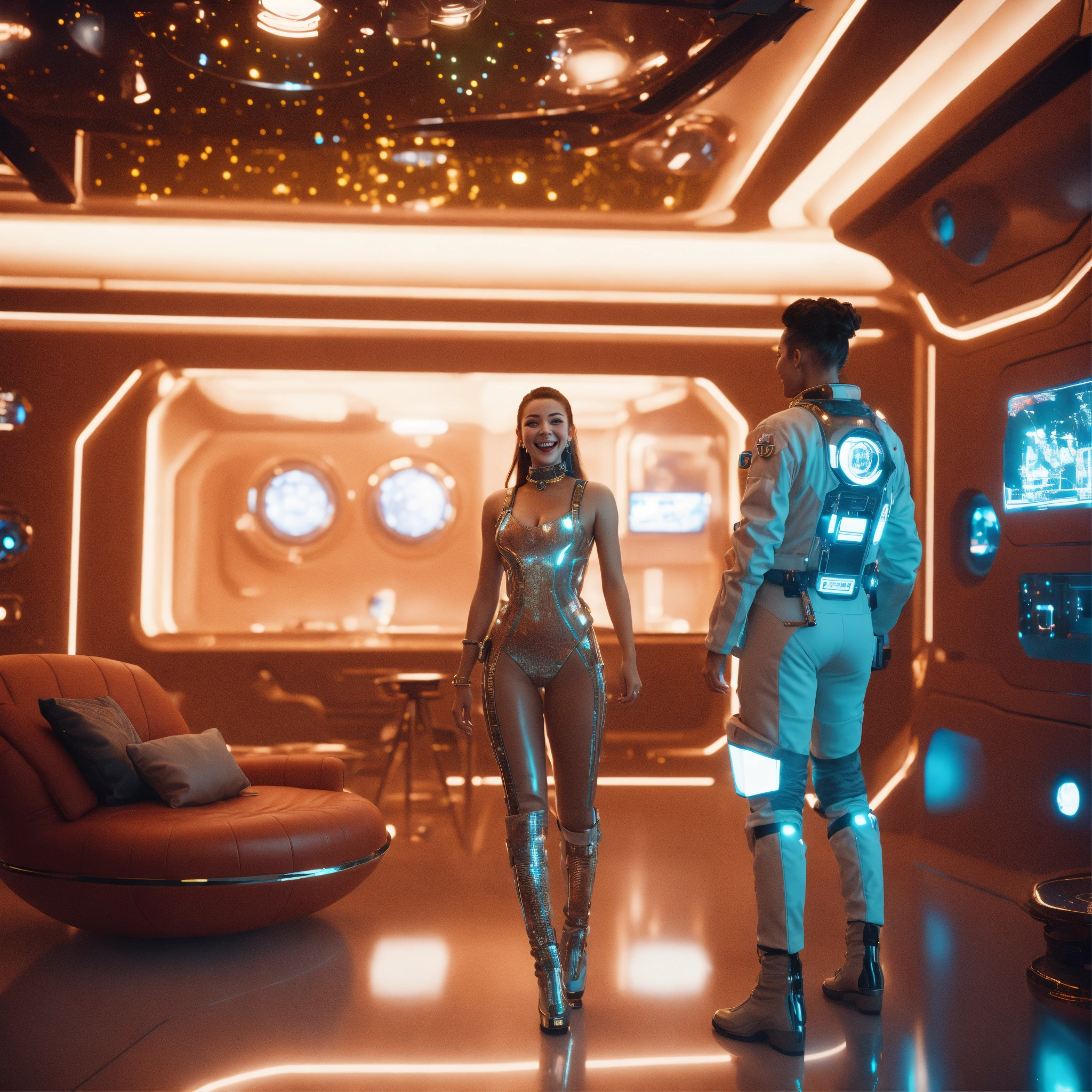 Zoom out from an alluring young babe wearing a fancy 38d space clothes and expensive jewelry in a futuristic space hotel lounge laughing with a man, realistic, futuristic, sci-fi, 8k, unreal engine