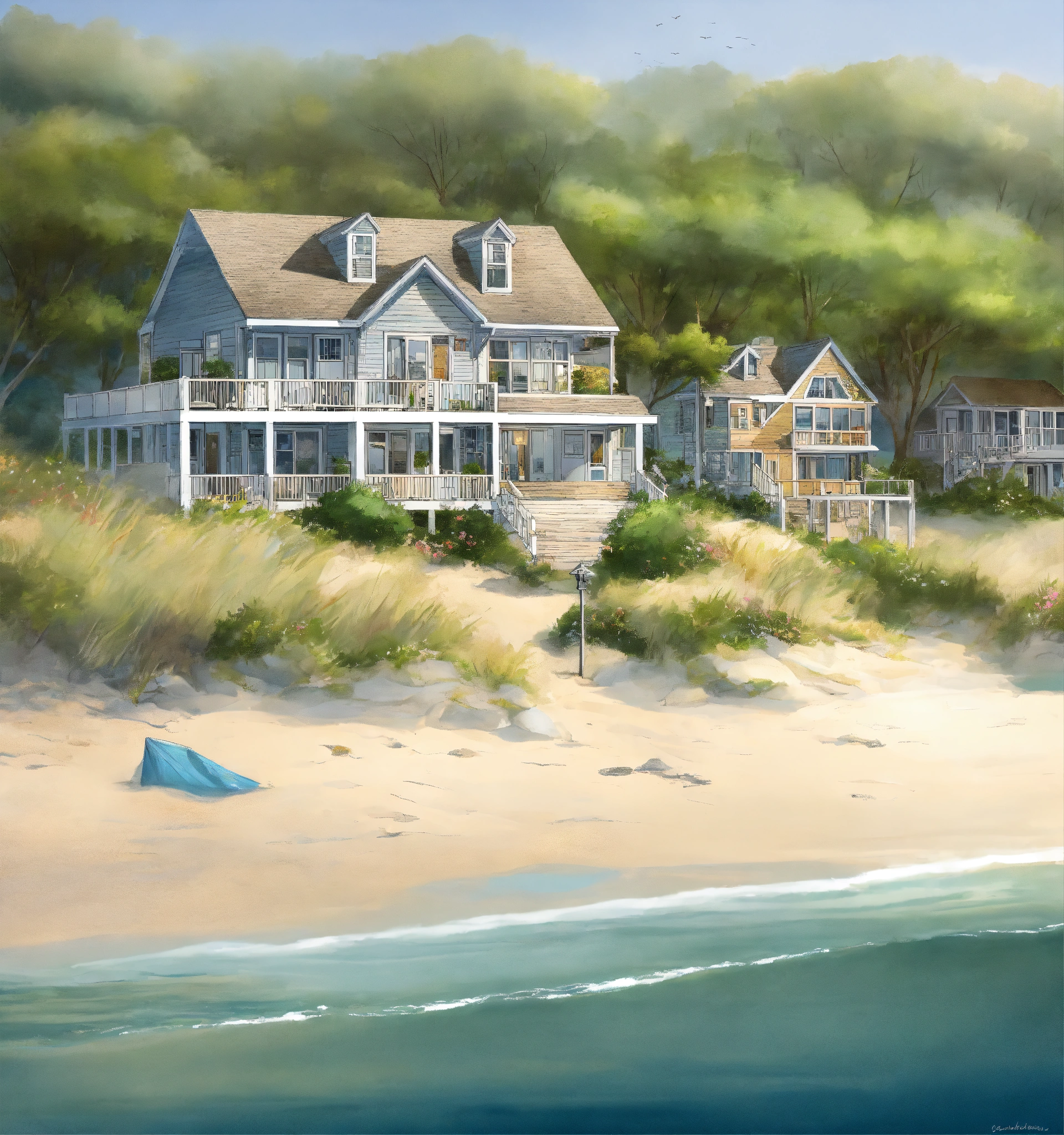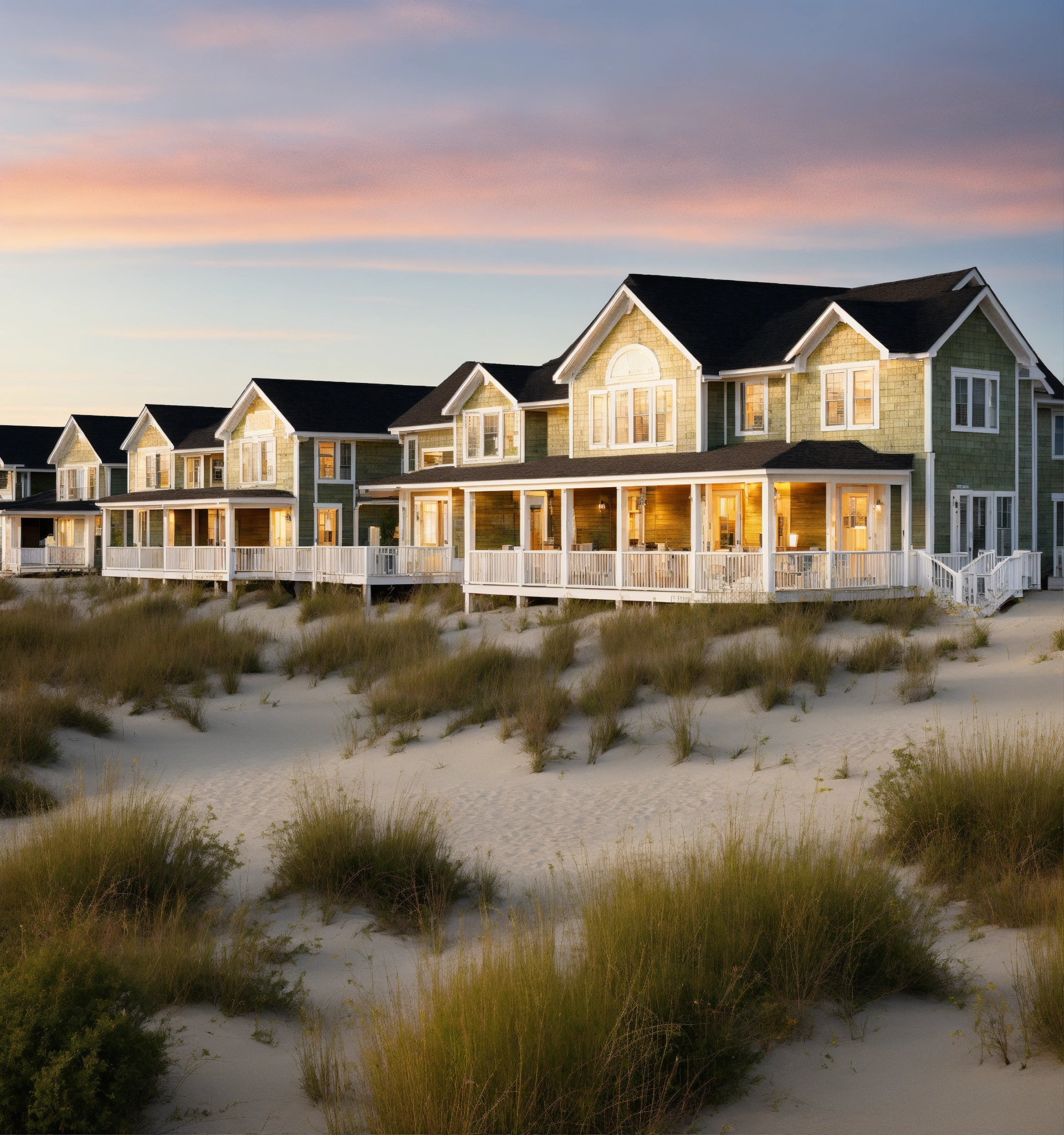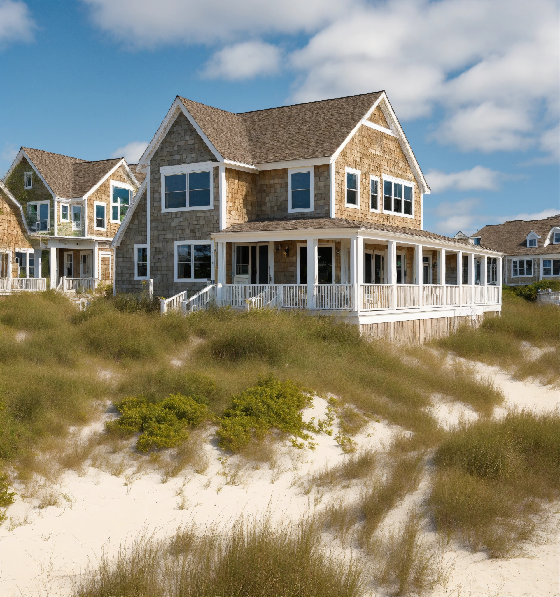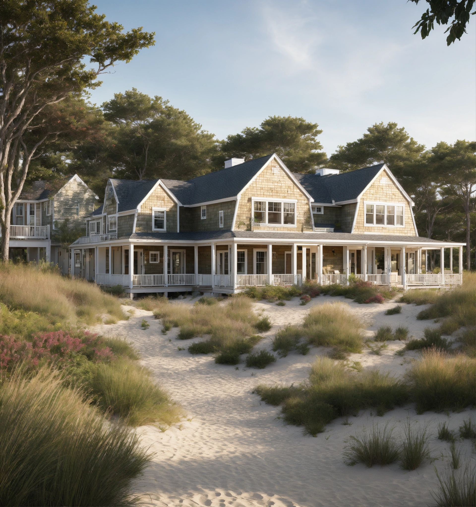 Beach houses complex/community, neutral colors with lost of vegetation and green spaces, cape cod style